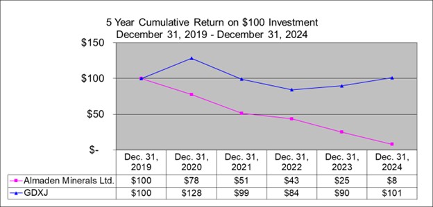 The following graph compares the total cumulative shareholder return for $100 invested in the Company’s common shares since December 31, 2019, with the cumulative total return of the VanEck Vectors Junior Gold Miners ETF Index (“GDXJ”) for the five most recently completed fiscal years of the Company.