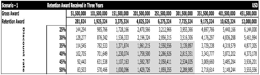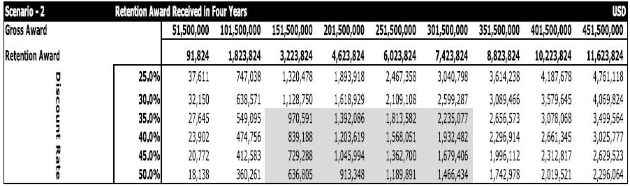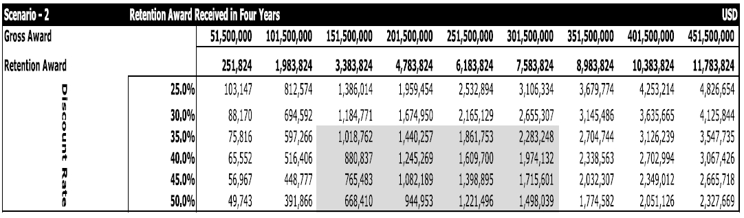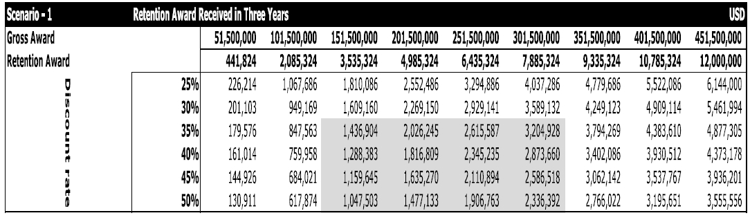In Scenario 1, Evans & Evans assumed the Retention Award would be received within three years. Under Scenario 1, the range of most likely values, based on the Claim being sought and an appropriate risk-adjusted rate of return, the net present value of the Retention Award ranges from $1.05 million to $3.20 million, with a median of $1.97 million.