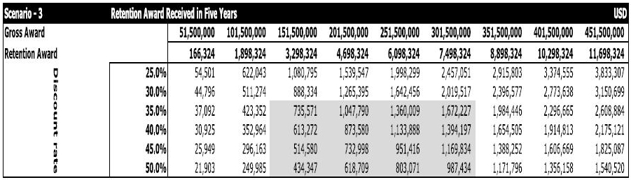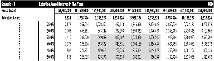 In Scenario 3, Evans & Evans assumed the Retention Award would be received in five years. Under Scenario 3, the range of most likely values, based on the Claim being sought and an appropriate risk-adjusted rate of return, the net present value of the Retention Award ranges from $0.43 million to $1.67 million, with a median of $0.91 million.