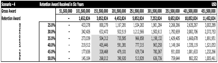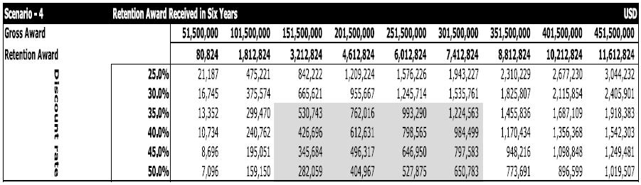 In Scenario 4, Evans & Evans assumed the Retention Award would be received in six years. Under Scenario 4, the range of most likely values, based on the Claim being sought and an appropriate risk-adjusted rate of return, the net present value of the Retention Award ranges from $0.28 million to $1.22 million, with a median of $0.63 million.