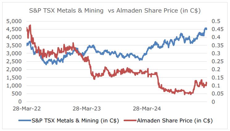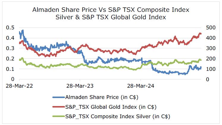 c)Given the Claim, the Company’s stock price lags behind industry benchmarks, suggesting it had lost the potential for share appreciation and adequate compensation for key personnel associated with the Claim. This is illustrated in the charts below, where the performance of Almaden’s share price has been compared to the S&P TSX Composite Silver index, S&P TSX Global Gold Index and the S&P TSX Metals and Mining index.