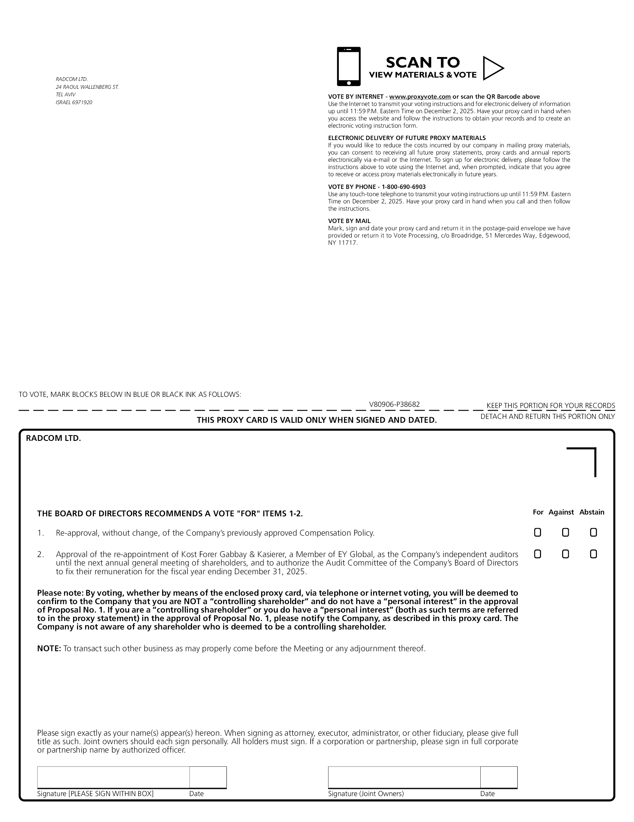 RADCOM LTD. 24 RAOUL WALLENBERG ST. TEL AVIV ISRAEL 6971920 SCAN TO VIEW MATERIALS & VOTE VOTE BY INTERNET - WWW.PROXYVOTE.COM OR SCAN THE QR BARCODE ABOVE Use the Internet to transmit your voting instructions and for electronic delivery of information up until 11:59 P.M. Eastern Time on December 2, 2025. Have your proxy card in hand when you access the website and follow the instructions to obtain your records and to create an electronic voting instruction form. ELECTRONIC DELIVERY OF FUTURE PROXY MATERIALS If you would like to reduce the costs incurred by our company in mailing proxy materials, you can consent to receiving all future proxy statements, proxy cards and annual reports electronically via e-mail or the Internet. To sign up for electronic delivery, please follow the instructions above to vote using the Internet and, when prompted, indicate that you agree to receive or access proxy materials electronically in future years. VOTE BY PHONE - 1-800-690-6903 Use any touch-tone telephone to transmit your voting instructions up until 11:59 P.M. Eastern Time on December 2, 2025. Have your proxy card in hand when you call and then follow the instructions. VOTE BY MAIL Mark, sign and date your proxy card and return it in the postage-paid envelope we have provided or return it to Vote Processing, c/o Broadridge, 51 Mercedes Way, Edgewood, NY 11717. TO VOTE, MARK BLOCKS BELOW IN BLUE OR BLACK INK AS FOLLOWS: V80906-P38682 KEEP THIS PORTION FOR YOUR RECORDS DETACH AND RETURN THIS PORTION ONLY THIS PROXY CARD IS VALID ONLY WHEN SIGNED AND DATED. RADCOM LTD. THE BOARD OF DIRECTORS RECOMMENDS A VOTE “FOR” ITEMS 1-2. FOR AGAINST ABSTAIN 1. RE-APPROVAL, WITHOUT CHANGE, OF THE COMPANY’S PREVIOUSLY APPROVED COMPENSATION POLICY. 2. APPROVAL OF THE RE-APPOINTMENT OF KOST FORER GABBAY & KASIERER, A MEMBER OF EY GLOBAL, AS THE COMPANY’S INDEPENDENT AUDITORS UNTIL THE NEXT ANNUAL GENERAL MEETING OF SHAREHOLDERS, AND TO AUTHORIZE THE AUDIT COMMITTEE OF THE COMPANY’S BOARD OF DIRECTORS TO FIX THEIR REMUNERATION FOR THE FISCAL YEAR ENDING DECEMBER 31, 2025. PLEASE NOTE: BY VOTING, WHETHER BY MEANS OF THE ENCLOSED PROXY CARD, VIA TELEPHONE OR INTERNET VOTING, YOU WILL BE DEEMED TO CONFIRM TO THE COMPANY THAT YOU ARE NOT A “CONTROLLING SHAREHOLDER” AND DO NOT HAVE A “PERSONAL INTEREST” IN THE APPROVAL OF PROPOSAL NO. 1. IF YOU ARE A “CONTROLLING SHAREHOLDER” OR YOU DO HAVE A “PERSONAL INTEREST” (BOTH AS SUCH TERMS ARE REFERRED TO IN THE PROXY STATEMENT) IN THE APPROVAL OF PROPOSAL NO. 1, PLEASE NOTIFY THE COMPANY, AS DESCRIBED IN THIS PROXY CARD. THE COMPANY IS NOT AWARE OF ANY SHAREHOLDER WHO IS DEEMED TO BE A CONTROLLING SHAREHOLDER. NOTE: TO TRANSACT SUCH OTHER BUSINESS AS MAY PROPERLY COME BEFORE THE MEETING OR ANY ADJOURNMENT THEREOF. PLEASE SIGN EXACTLY AS YOUR NAME(S) APPEAR(S) HEREON. WHEN SIGNING AS ATTORNEY, EXECUTOR, ADMINISTRATOR, OR OTHER FIDUCIARY, PLEASE GIVE FULL TITLE AS SUCH. JOINT OWNERS SHOULD EACH SIGN PERSONALLY. ALL HOLDERS MUST SIGN. IF A CORPORATION OR PARTNERSHIP, PLEASE SIGN IN FULL CORPORATE OR PARTNERSHIP NAME BY AUTHORIZED OFFICER. SIGNATURE [PLEASE SIGN WITHIN BOX] DATE SIGNATURE (JOINT OWNERS) DATE
