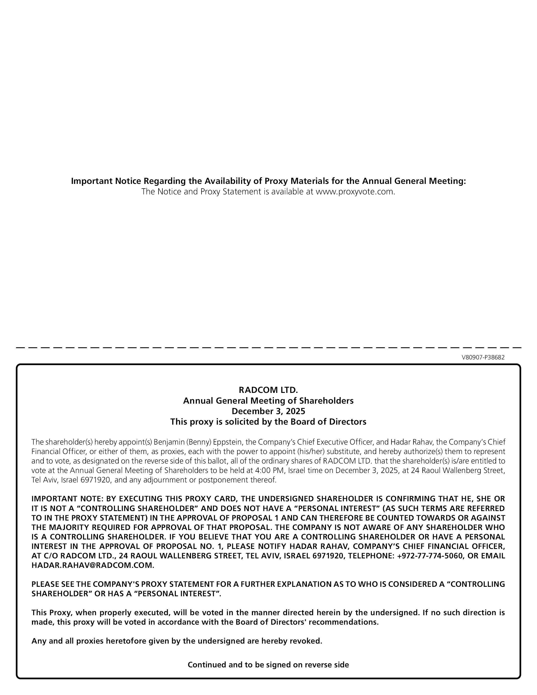 Important Notice Regarding the Availability of Proxy Materials for the Annual General Meeting: The Notice and Proxy Statement is available at www.proxyvote.com. V80907-P38682 RADCOM LTD. Annual General Meeting of Shareholders December 3, 2025 This proxy is solicited by the Board of Directors The shareholder(s) hereby appoint(s) Benjamin (Benny) Eppstein, the Company’s Chief Executive Officer, and Hadar Rahav, the Company’s Chief Financial Officer, or either of them, as proxies, each with the power to appoint (his/her) substitute, and hereby authorize(s) them to represent and to vote, as designated on the reverse side of this ballot, all of the ordinary shares of RADCOM LTD. that the shareholder(s) is/are entitled to vote at the Annual General Meeting of Shareholders to be held at 4:00 PM, Israel time on December 3, 2025, at 24 Raoul Wallenberg Street, Tel Aviv, Israel 6971920, and any adjournment or postponement thereof. IMPORTANT NOTE: BY EXECUTING THIS PROXY CARD, THE UNDERSIGNED SHAREHOLDER IS CONFIRMING THAT HE, SHE OR IT IS NOT A “CONTROLLING SHAREHOLDER” AND DOES NOT HAVE A “PERSONAL INTEREST” (AS SUCH TERMS ARE REFERRED TO IN THE PROXY STATEMENT) IN THE APPROVAL OF PROPOSAL 1 AND CAN THEREFORE BE COUNTED TOWARDS OR AGAINST THE MAJORITY REQUIRED FOR APPROVAL OF THAT PROPOSAL. THE COMPANY IS NOT AWARE OF ANY SHAREHOLDER WHO IS A CONTROLLING SHAREHOLDER. IF YOU BELIEVE THAT YOU ARE A CONTROLLING SHAREHOLDER OR HAVE A PERSONAL INTEREST IN THE APPROVAL OF PROPOSAL NO. 1, PLEASE NOTIFY HADAR RAHAV, COMPANY’S CHIEF FINANCIAL OFFICER, AT C/O RADCOM LTD., 24 RAOUL WALLENBERG STREET, TEL AVIV, ISRAEL 6971920, TELEPHONE: +972-77-774-5060, OR EMAIL HADAR.RAHAV@RADCOM.COM. PLEASE SEE THE COMPANY’S PROXY STATEMENT FOR A FURTHER EXPLANATION AS TO WHO IS CONSIDERED A “CONTROLLING SHAREHOLDER” OR HAS A “PERSONAL INTEREST”. This Proxy, when properly executed, will be voted in the manner directed herein by the undersigned. If no such direction is made, this proxy will be voted in accordance with the Board of Directors’ recommendations. Any and all proxies heretofore given by the undersigned are hereby revoked. Continued and to be signed on reverse side