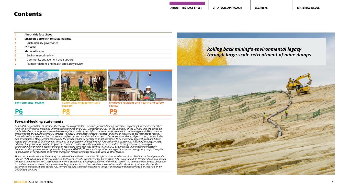 2 About this fact sheet 3 Strategic approach to sustainability 4 Sustainability governance 5 ESG risks 6 Material issues 6 Environmental review 8 Community engagement and support 9 Human relations and health and safety review Environmental review Community engagement and support Employee relations and health and safety review P6 P8 P9 Forward-looking statements Some of the information in this fact sheet may contain projections or other forward-looking statements regarding future events or other financial performance, including information relating to DRDGOLD Limited (DRDGOLD or the Company or the Group), that are based on the beliefs of our management, as well as assumptions made by and information currently available to our management. When used in this fact sheet, the words “estimate”, “project”, “believe”, “anticipate”, “intend”, “expect” and similar expressions are intended to identify forward-looking statements. Such statements reflect our current views with respect to future events and are subject to risks, uncertainties and assumptions. Many factors could cause the actual results, performance or achievements to be materially different from any future results, performance or achievements that may be expressed or implied by such forward-looking statements, including, amongst others, adverse changes or uncertainties in general economic conditions in the markets we serve, a drop in the gold price, a prolonged strengthening of the Rand against the Dollar, regulatory developments adverse to DRDGOLD or difficulties in maintaining necessary licences or other governmental approvals, changes in DRDGOLD’s competitive position, changes in business strategy, any major disruption in production at key facilities or adverse changes in foreign exchange rates and various other factors. These risks include, without limitation, those described in the section titled “Risk factors” included in our Form 20-F for the fiscal year ended 30 June 2024, which will be filed with the United States Securities and Exchange Commission (SEC) on or about 30 October 2024. You should not place undue reliance on these forward-looking statements, which speak only as of the date thereof. We do not undertake any obligation to publicly update or revise these forward-looking statements to reflect events or circumstances after the date of this fact sheet or the occurrence of unanticipated events. Any forward-looking statement included in this fact sheet have not been reviewed or reported on by DRDGOLD’s auditors. ABOUT THIS FACT SHEET STRATEGIC APPROACH ESG RISKS MATERIAL ISSUES Contents DRDGOLD ESG Fact Sheet 2024 1 Rolling back mining's environmental legacy through large-scale retreatment of mine dumps