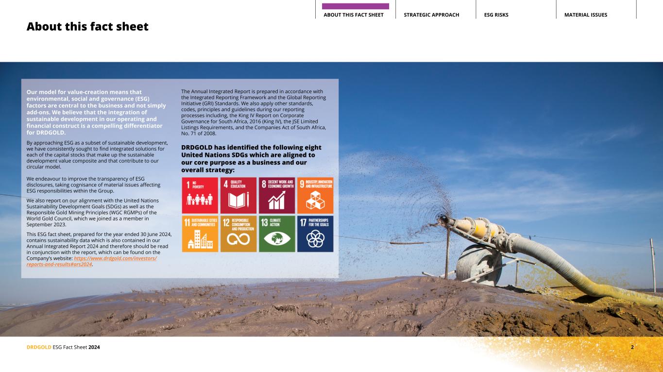 Our model for value-creation means that environmental, social and governance (ESG) factors are central to the business and not simply add-ons. We believe that the integration of sustainable development in our operating and financial construct is a compelling differentiator for DRDGOLD. By approaching ESG as a subset of sustainable development, we have consistently sought to find integrated solutions for each of the capital stocks that make up the sustainable development value composite and that contribute to our circular model. We endeavour to improve the transparency of ESG disclosures, taking cognisance of material issues affecting ESG responsibilities within the Group. We also report on our alignment with the United Nations Sustainability Development Goals (SDGs) as well as the Responsible Gold Mining Principles (WGC RGMPs) of the World Gold Council, which we joined as a member in September 2023. This ESG fact sheet, prepared for the year ended 30 June 2024, contains sustainability data which is also contained in our Annual Integrated Report 2024 and therefore should be read in conjunction with the report, which can be found on the Company’s website: https://www.drdgold.com/investors/ reports-and-results#ars2024. The Annual Integrated Report is prepared in accordance with the Integrated Reporting Framework and the Global Reporting Initiative (GRI) Standards. We also apply other standards, codes, principles and guidelines during our reporting processes including, the King IV Report on Corporate Governance for South Africa, 2016 (King IV), the JSE Limited Listings Requirements, and the Companies Act of South Africa, No. 71 of 2008. DRDGOLD has identified the following eight United Nations SDGs which are aligned to our core purpose as a business and our overall strategy: ABOUT THIS FACT SHEET STRATEGIC APPROACH ESG RISKS MATERIAL ISSUES About this fact sheet DRDGOLD ESG Fact Sheet 2024 2