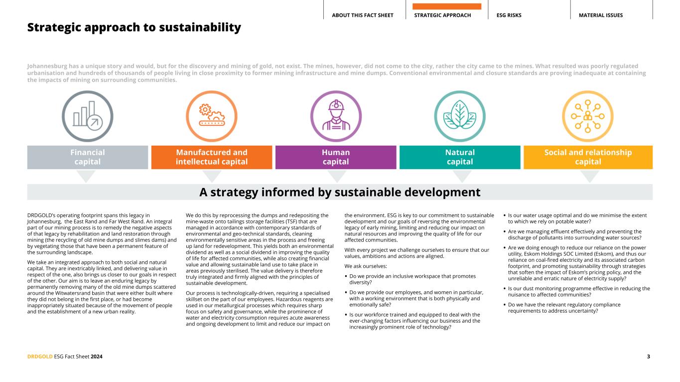 Johannesburg has a unique story and would, but for the discovery and mining of gold, not exist. The mines, however, did not come to the city, rather the city came to the mines. What resulted was poorly regulated urbanisation and hundreds of thousands of people living in close proximity to former mining infrastructure and mine dumps. Conventional environmental and closure standards are proving inadequate at containing the impacts of mining on surrounding communities. Financial capital Manufactured and intellectual capital Human capital Natural capital Social and relationship capital A strategy informed by sustainable development DRDGOLD’s operating footprint spans this legacy in Johannesburg, the East Rand and Far West Rand. An integral part of our mining process is to remedy the negative aspects of that legacy by rehabilitation and land restoration through mining (the recycling of old mine dumps and slimes dams) and by vegetating those that have been a permanent feature of the surrounding landscape. We take an integrated approach to both social and natural capital. They are inextricably linked, and delivering value in respect of the one, also brings us closer to our goals in respect of the other. Our aim is to leave an enduring legacy by permanently removing many of the old mine dumps scattered around the Witwatersrand basin that were either built where they did not belong in the first place, or had become inappropriately situated because of the movement of people and the establishment of a new urban reality. We do this by reprocessing the dumps and redepositing the mine-waste onto tailings storage facilities (TSF) that are managed in accordance with contemporary standards of environmental and geo-technical standards, cleaning environmentally sensitive areas in the process and freeing up land for redevelopment. This yields both an environmental dividend as well as a social dividend in improving the quality of life for affected communities, while also creating financial value and allowing sustainable land use to take place in areas previously sterilised. The value delivery is therefore truly integrated and firmly aligned with the principles of sustainable development. Our process is technologically-driven, requiring a specialised skillset on the part of our employees. Hazardous reagents are used in our metallurgical processes which requires sharp focus on safety and governance, while the prominence of water and electricity consumption requires acute awareness and ongoing development to limit and reduce our impact on the environment. ESG is key to our commitment to sustainable development and our goals of reversing the environmental legacy of early mining, limiting and reducing our impact on natural resources and improving the quality of life for our affected communities. With every project we challenge ourselves to ensure that our values, ambitions and actions are aligned. We ask ourselves: • Do we provide an inclusive workspace that promotes diversity? • Do we provide our employees, and women in particular, with a working environment that is both physically and emotionally safe? • Is our workforce trained and equipped to deal with the ever-changing factors influencing our business and the increasingly prominent role of technology? • Is our water usage optimal and do we minimise the extent to which we rely on potable water? • Are we managing effluent effectively and preventing the discharge of pollutants into surrounding water sources? • Are we doing enough to reduce our reliance on the power utility, Eskom Holdings SOC Limited (Eskom), and thus our reliance on coal-fired electricity and its associated carbon footprint, and promoting sustainability through strategies that soften the impact of Eskom’s pricing policy, and the unreliable and erratic nature of electricity supply? • Is our dust monitoring programme effective in reducing the nuisance to affected communities? • Do we have the relevant regulatory compliance requirements to address uncertainty? ABOUT THIS FACT SHEET STRATEGIC APPROACH ESG RISKS MATERIAL ISSUES Strategic approach to sustainability DRDGOLD ESG Fact Sheet 2024 3