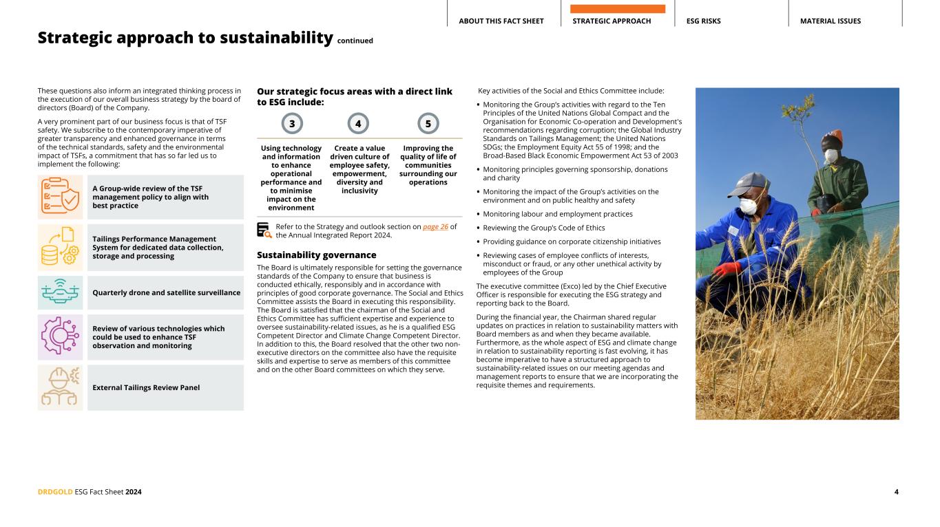 These questions also inform an integrated thinking process in the execution of our overall business strategy by the board of directors (Board) of the Company. A very prominent part of our business focus is that of TSF safety. We subscribe to the contemporary imperative of greater transparency and enhanced governance in terms of the technical standards, safety and the environmental impact of TSFs, a commitment that has so far led us to implement the following: A Group-wide review of the TSF management policy to align with best practice Tailings Performance Management System for dedicated data collection, storage and processing Quarterly drone and satellite surveillance Review of various technologies which could be used to enhance TSF observation and monitoring External Tailings Review Panel Our strategic focus areas with a direct link to ESG include: Using technology and information to enhance operational performance and to minimise impact on the environment Create a value driven culture of employee safety, empowerment, diversity and inclusivity Improving the quality of life of communities surrounding our operations Refer to the Strategy and outlook section on page 26 of the Annual Integrated Report 2024. Sustainability governance The Board is ultimately responsible for setting the governance standards of the Company to ensure that business is conducted ethically, responsibly and in accordance with principles of good corporate governance. The Social and Ethics Committee assists the Board in executing this responsibility. The Board is satisfied that the chairman of the Social and Ethics Committee has sufficient expertise and experience to oversee sustainability-related issues, as he is a qualified ESG Competent Director and Climate Change Competent Director. In addition to this, the Board resolved that the other two non- executive directors on the committee also have the requisite skills and expertise to serve as members of this committee and on the other Board committees on which they serve. Key activities of the Social and Ethics Committee include: • Monitoring the Group’s activities with regard to the Ten Principles of the United Nations Global Compact and the Organisation for Economic Co-operation and Development's recommendations regarding corruption; the Global Industry Standards on Tailings Management; the United Nations SDGs; the Employment Equity Act 55 of 1998; and the Broad-Based Black Economic Empowerment Act 53 of 2003 • Monitoring principles governing sponsorship, donations and charity • Monitoring the impact of the Group’s activities on the environment and on public healthy and safety • Monitoring labour and employment practices • Reviewing the Group’s Code of Ethics • Providing guidance on corporate citizenship initiatives • Reviewing cases of employee conflicts of interests, misconduct or fraud, or any other unethical activity by employees of the Group The executive committee (Exco) led by the Chief Executive Officer is responsible for executing the ESG strategy and reporting back to the Board. During the financial year, the Chairman shared regular updates on practices in relation to sustainability matters with Board members as and when they became available. Furthermore, as the whole aspect of ESG and climate change in relation to sustainability reporting is fast evolving, it has become imperative to have a structured approach to sustainability-related issues on our meeting agendas and management reports to ensure that we are incorporating the requisite themes and requirements. ABOUT THIS FACT SHEET STRATEGIC APPROACH ESG RISKS MATERIAL ISSUES Strategic approach to sustainability continued DRDGOLD ESG Fact Sheet 2024 4 3 4 5