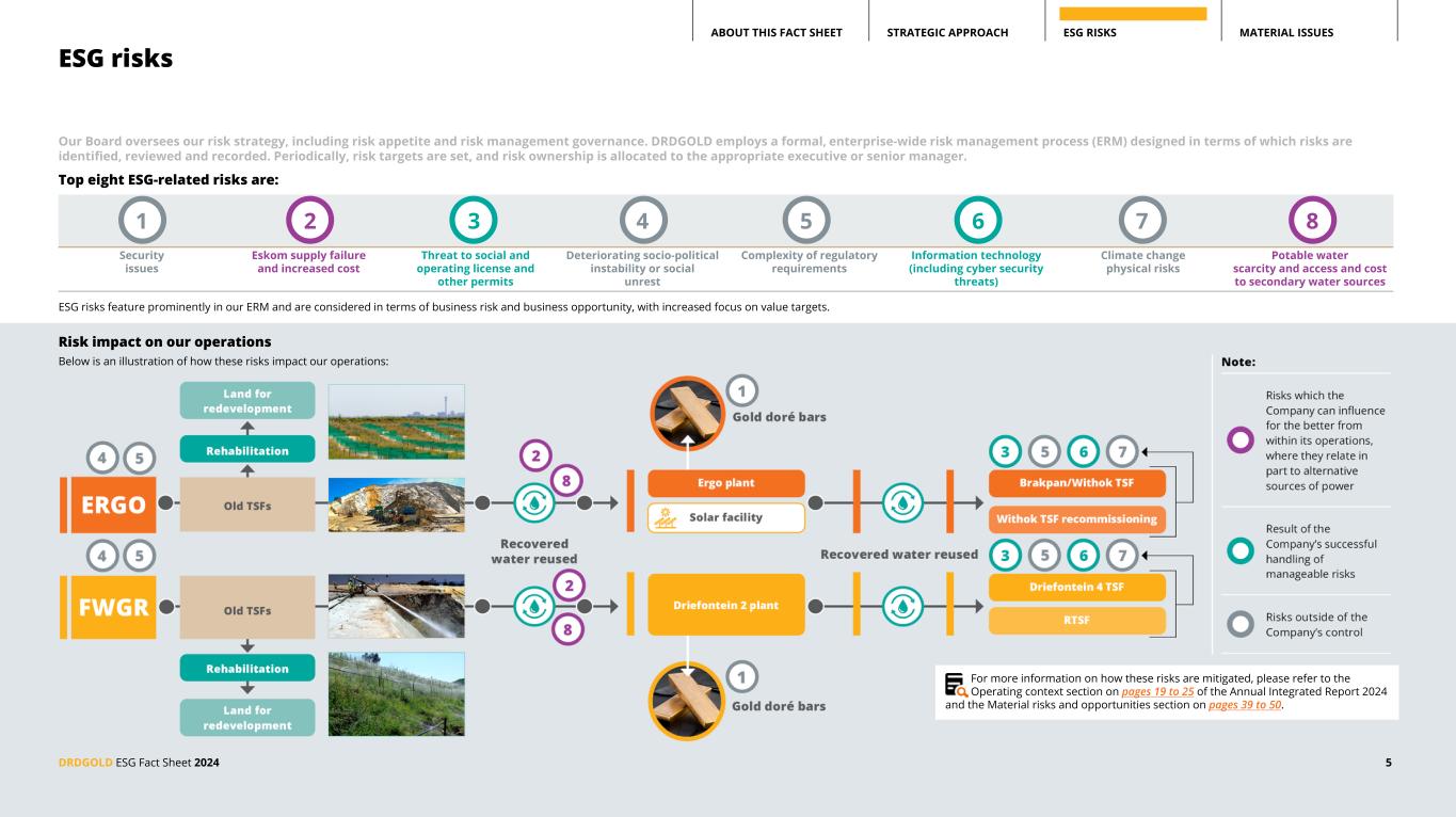 Our Board oversees our risk strategy, including risk appetite and risk management governance. DRDGOLD employs a formal, enterprise-wide risk management process (ERM) designed in terms of which risks are identified, reviewed and recorded. Periodically, risk targets are set, and risk ownership is allocated to the appropriate executive or senior manager. Top eight ESG-related risks are: 1 2 3 4 5 6 7 8 Security issues Eskom supply failure and increased cost Threat to social and operating license and other permits Deteriorating socio-political instability or social unrest Complexity of regulatory requirements Information technology (including cyber security threats) Climate change physical risks Potable water scarcity and access and cost to secondary water sources ESG risks feature prominently in our ERM and are considered in terms of business risk and business opportunity, with increased focus on value targets. Risk impact on our operations Below is an illustration of how these risks impact our operations: ABOUT THIS FACT SHEET STRATEGIC APPROACH ESG RISKS MATERIAL ISSUES ESG risks DRDGOLD ESG Fact Sheet 2024 5 For more information on how these risks are mitigated, please refer to the Operating context section on pages 19 to 25 of the Annual Integrated Report 2024 and the Material risks and opportunities section on pages 39 to 50. 1 2 3 4 5 6 7 8