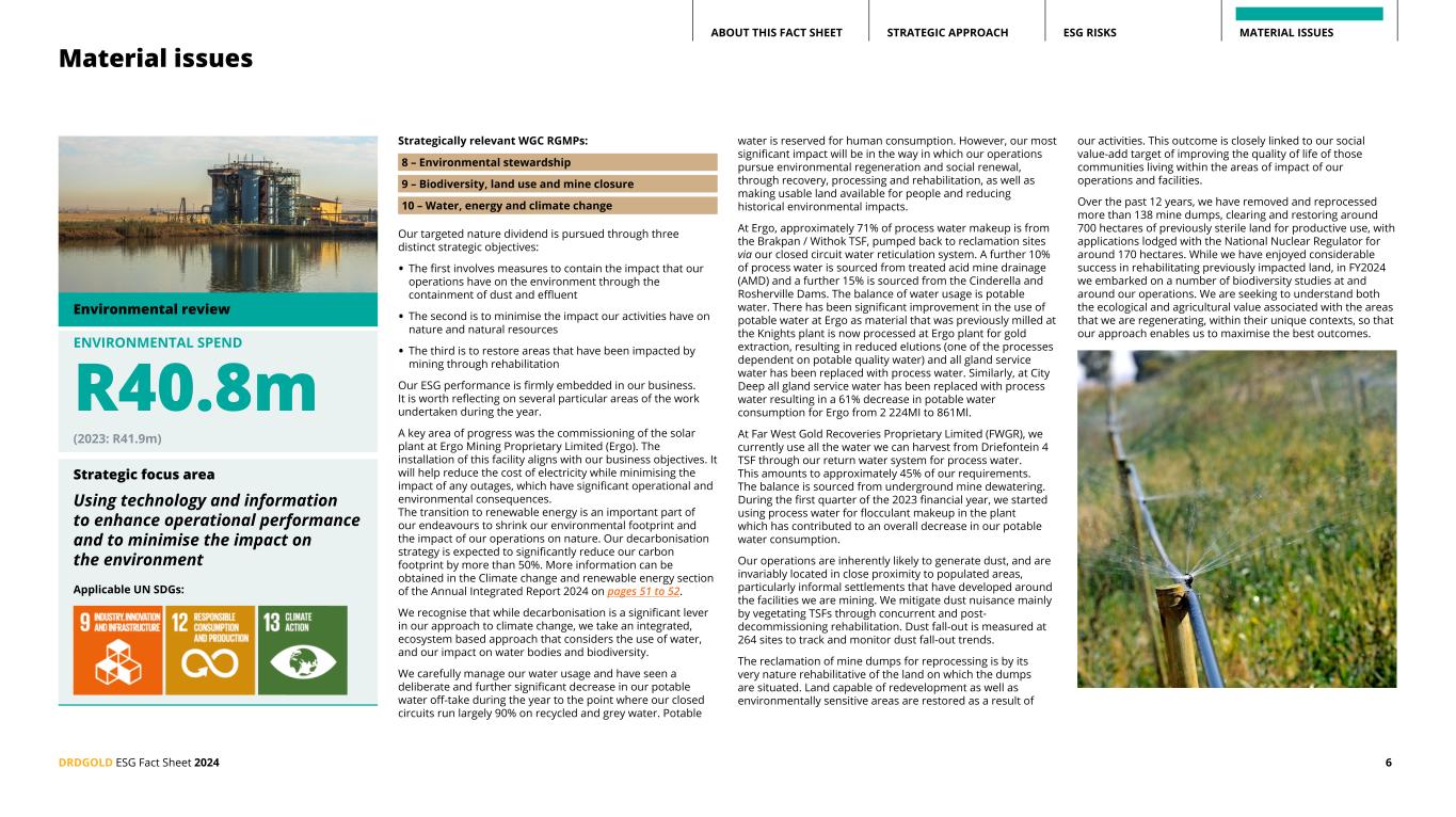 Environmental review ENVIRONMENTAL SPEND R40.8m (2023: R41.9m) Strategic focus area Using technology and information to enhance operational performance and to minimise the impact on the environment Applicable UN SDGs: Strategically relevant WGC RGMPs: 8 – Environmental stewardship 9 – Biodiversity, land use and mine closure 10 – Water, energy and climate change Our targeted nature dividend is pursued through three distinct strategic objectives: • The first involves measures to contain the impact that our operations have on the environment through the containment of dust and effluent • The second is to minimise the impact our activities have on nature and natural resources • The third is to restore areas that have been impacted by mining through rehabilitation Our ESG performance is firmly embedded in our business. It is worth reflecting on several particular areas of the work undertaken during the year. A key area of progress was the commissioning of the solar plant at Ergo Mining Proprietary Limited (Ergo). The installation of this facility aligns with our business objectives. It will help reduce the cost of electricity while minimising the impact of any outages, which have significant operational and environmental consequences. The transition to renewable energy is an important part of our endeavours to shrink our environmental footprint and the impact of our operations on nature. Our decarbonisation strategy is expected to significantly reduce our carbon footprint by more than 50%. More information can be obtained in the Climate change and renewable energy section of the Annual Integrated Report 2024 on pages 51 to 52. We recognise that while decarbonisation is a significant lever in our approach to climate change, we take an integrated, ecosystem based approach that considers the use of water, and our impact on water bodies and biodiversity. We carefully manage our water usage and have seen a deliberate and further significant decrease in our potable water off-take during the year to the point where our closed circuits run largely 90% on recycled and grey water. Potable water is reserved for human consumption. However, our most significant impact will be in the way in which our operations pursue environmental regeneration and social renewal, through recovery, processing and rehabilitation, as well as making usable land available for people and reducing historical environmental impacts. At Ergo, approximately 71% of process water makeup is from the Brakpan / Withok TSF, pumped back to reclamation sites via our closed circuit water reticulation system. A further 10% of process water is sourced from treated acid mine drainage (AMD) and a further 15% is sourced from the Cinderella and Rosherville Dams. The balance of water usage is potable water. There has been significant improvement in the use of potable water at Ergo as material that was previously milled at the Knights plant is now processed at Ergo plant for gold extraction, resulting in reduced elutions (one of the processes dependent on potable quality water) and all gland service water has been replaced with process water. Similarly, at City Deep all gland service water has been replaced with process water resulting in a 61% decrease in potable water consumption for Ergo from 2 224MI to 861Ml. At Far West Gold Recoveries Proprietary Limited (FWGR), we currently use all the water we can harvest from Driefontein 4 TSF through our return water system for process water. This amounts to approximately 45% of our requirements. The balance is sourced from underground mine dewatering. During the first quarter of the 2023 financial year, we started using process water for flocculant makeup in the plant which has contributed to an overall decrease in our potable water consumption. Our operations are inherently likely to generate dust, and are invariably located in close proximity to populated areas, particularly informal settlements that have developed around the facilities we are mining. We mitigate dust nuisance mainly by vegetating TSFs through concurrent and post- decommissioning rehabilitation. Dust fall-out is measured at 264 sites to track and monitor dust fall-out trends. The reclamation of mine dumps for reprocessing is by its very nature rehabilitative of the land on which the dumps are situated. Land capable of redevelopment as well as environmentally sensitive areas are restored as a result of our activities. This outcome is closely linked to our social value-add target of improving the quality of life of those communities living within the areas of impact of our operations and facilities. Over the past 12 years, we have removed and reprocessed more than 138 mine dumps, clearing and restoring around 700 hectares of previously sterile land for productive use, with applications lodged with the National Nuclear Regulator for around 170 hectares. While we have enjoyed considerable success in rehabilitating previously impacted land, in FY2024 we embarked on a number of biodiversity studies at and around our operations. We are seeking to understand both the ecological and agricultural value associated with the areas that we are regenerating, within their unique contexts, so that our approach enables us to maximise the best outcomes. ABOUT THIS FACT SHEET STRATEGIC APPROACH ESG RISKS MATERIAL ISSUES Material issues DRDGOLD ESG Fact Sheet 2024 6