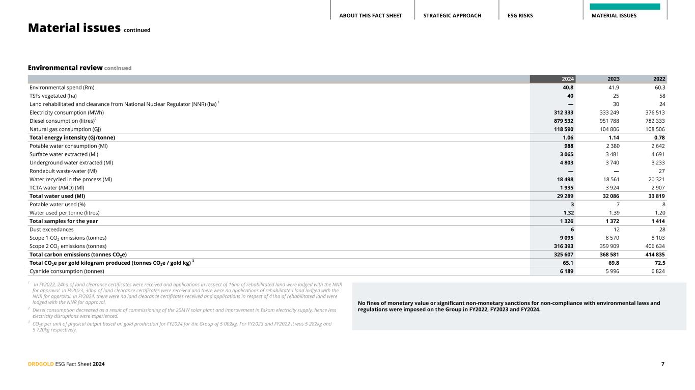 Environmental review continued 2024 2023 2022 Environmental spend (Rm) 40.8 41.9 60.3 TSFs vegetated (ha) 40 25 58 Land rehabilitated and clearance from National Nuclear Regulator (NNR) (ha) 1 — 30 24 Electricity consumption (MWh) 312 333 333 249 376 513 Diesel consumption (litres)2 879 532 951 788 782 333 Natural gas consumption (GJ) 118 590 104 806 108 506 Total energy intensity (GJ/tonne) 1.06 1.14 0.78 Potable water consumption (Ml) 988 2 380 2 642 Surface water extracted (Ml) 3 065 3 481 4 691 Underground water extracted (Ml) 4 803 3 740 3 233 Rondebult waste-water (Ml) — — 27 Water recycled in the process (Ml) 18 498 18 561 20 321 TCTA water (AMD) (Ml) 1 935 3 924 2 907 Total water used (Ml) 29 289 32 086 33 819 Potable water used (%) 3 7 8 Water used per tonne (litres) 1.32 1.39 1.20 Total samples for the year 1 326 1 372 1 414 Dust exceedances 6 12 28 Scope 1 CO2 emissions (tonnes) 9 095 8 570 8 103 Scope 2 CO2 emissions (tonnes) 316 393 359 909 406 634 Total carbon emissions (tonnes CO2e) 325 607 368 581 414 835 Total CO2e per gold kilogram produced (tonnes CO2e / gold kg) 3 65.1 69.8 72.5 Cyanide consumption (tonnes) 6 189 5 996 6 824 1 In FY2022, 24ha of land clearance certificates were received and applications in respect of 16ha of rehabilitated land were lodged with the NNR for approval. In FY2023, 30ha of land clearance certificates were received and there were no applications of rehabilitated land lodged with the NNR for approval. In FY2024, there were no land clearance certificates received and applications in respect of 41ha of rehabilitated land were lodged with the NNR for approval. 2 Diesel consumption decreased as a result of commissioning of the 20MW solar plant and improvement in Eskom electricity supply, hence less electricity disruptions were experienced. 3 CO2e per unit of physical output based on gold production for FY2024 for the Group of 5 002kg. For FY2023 and FY2022 it was 5 282kg and 5 720kg respectively. No fines of monetary value or significant non-monetary sanctions for non-compliance with environmental laws and regulations were imposed on the Group in FY2022, FY2023 and FY2024. ABOUT THIS FACT SHEET STRATEGIC APPROACH ESG RISKS MATERIAL ISSUES Material issues continued DRDGOLD ESG Fact Sheet 2024 7