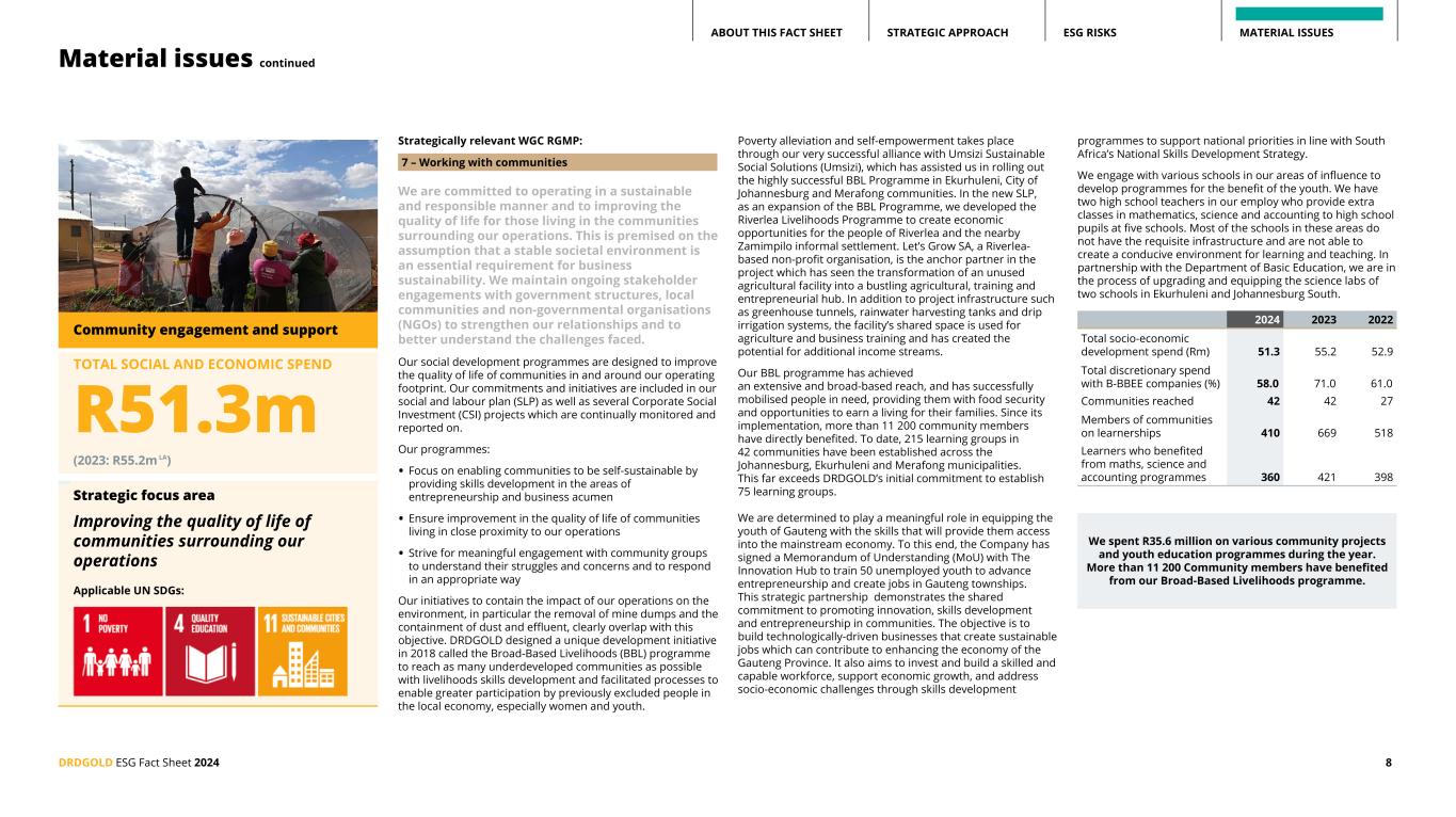 Community engagement and support TOTAL SOCIAL AND ECONOMIC SPEND R51.3m (2023: R55.2m LA) Strategic focus area Improving the quality of life of communities surrounding our operations Applicable UN SDGs: Strategically relevant WGC RGMP: 7 – Working with communities We are committed to operating in a sustainable and responsible manner and to improving the quality of life for those living in the communities surrounding our operations. This is premised on the assumption that a stable societal environment is an essential requirement for business sustainability. We maintain ongoing stakeholder engagements with government structures, local communities and non-governmental organisations (NGOs) to strengthen our relationships and to better understand the challenges faced. Our social development programmes are designed to improve the quality of life of communities in and around our operating footprint. Our commitments and initiatives are included in our social and labour plan (SLP) as well as several Corporate Social Investment (CSI) projects which are continually monitored and reported on. Our programmes: • Focus on enabling communities to be self-sustainable by providing skills development in the areas of entrepreneurship and business acumen • Ensure improvement in the quality of life of communities living in close proximity to our operations • Strive for meaningful engagement with community groups to understand their struggles and concerns and to respond in an appropriate way Our initiatives to contain the impact of our operations on the environment, in particular the removal of mine dumps and the containment of dust and effluent, clearly overlap with this objective. DRDGOLD designed a unique development initiative in 2018 called the Broad-Based Livelihoods (BBL) programme to reach as many underdeveloped communities as possible with livelihoods skills development and facilitated processes to enable greater participation by previously excluded people in the local economy, especially women and youth. Poverty alleviation and self-empowerment takes place through our very successful alliance with Umsizi Sustainable Social Solutions (Umsizi), which has assisted us in rolling out the highly successful BBL Programme in Ekurhuleni, City of Johannesburg and Merafong communities. In the new SLP, as an expansion of the BBL Programme, we developed the Riverlea Livelihoods Programme to create economic opportunities for the people of Riverlea and the nearby Zamimpilo informal settlement. Let’s Grow SA, a Riverlea- based non-profit organisation, is the anchor partner in the project which has seen the transformation of an unused agricultural facility into a bustling agricultural, training and entrepreneurial hub. In addition to project infrastructure such as greenhouse tunnels, rainwater harvesting tanks and drip irrigation systems, the facility’s shared space is used for agriculture and business training and has created the potential for additional income streams. Our BBL programme has achieved an extensive and broad-based reach, and has successfully mobilised people in need, providing them with food security and opportunities to earn a living for their families. Since its implementation, more than 11 200 community members have directly benefited. To date, 215 learning groups in 42 communities have been established across the Johannesburg, Ekurhuleni and Merafong municipalities. This far exceeds DRDGOLD’s initial commitment to establish 75 learning groups. We are determined to play a meaningful role in equipping the youth of Gauteng with the skills that will provide them access into the mainstream economy. To this end, the Company has signed a Memorandum of Understanding (MoU) with The Innovation Hub to train 50 unemployed youth to advance entrepreneurship and create jobs in Gauteng townships. This strategic partnership demonstrates the shared commitment to promoting innovation, skills development and entrepreneurship in communities. The objective is to build technologically-driven businesses that create sustainable jobs which can contribute to enhancing the economy of the Gauteng Province. It also aims to invest and build a skilled and capable workforce, support economic growth, and address socio-economic challenges through skills development programmes to support national priorities in line with South Africa’s National Skills Development Strategy. We engage with various schools in our areas of influence to develop programmes for the benefit of the youth. We have two high school teachers in our employ who provide extra classes in mathematics, science and accounting to high school pupils at five schools. Most of the schools in these areas do not have the requisite infrastructure and are not able to create a conducive environment for learning and teaching. In partnership with the Department of Basic Education, we are in the process of upgrading and equipping the science labs of two schools in Ekurhuleni and Johannesburg South. 2024 2023 2022 Total socio-economic development spend (Rm) 51.3 55.2 52.9 Total discretionary spend with B-BBEE companies (%) 58.0 71.0 61.0 Communities reached 42 42 27 Members of communities on learnerships 410 669 518 Learners who benefited from maths, science and accounting programmes 360 421 398 We spent R35.6 million on various community projects and youth education programmes during the year. More than 11 200 Community members have benefited from our Broad-Based Livelihoods programme. ABOUT THIS FACT SHEET STRATEGIC APPROACH ESG RISKS MATERIAL ISSUES Material issues continued DRDGOLD ESG Fact Sheet 2024 8