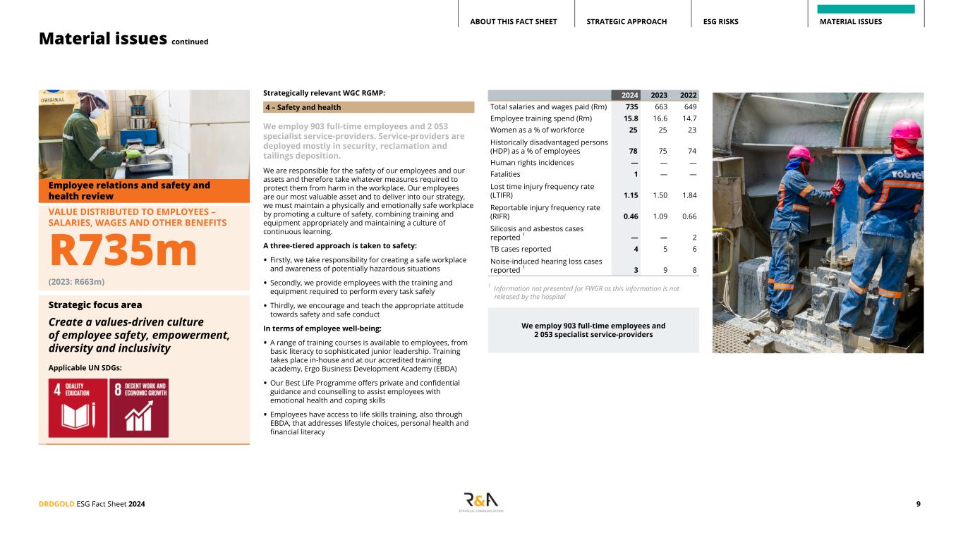 Employee relations and safety and health review VALUE DISTRIBUTED TO EMPLOYEES – SALARIES, WAGES AND OTHER BENEFITS R735m (2023: R663m) Strategic focus area Create a values-driven culture of employee safety, empowerment, diversity and inclusivity Applicable UN SDGs: Strategically relevant WGC RGMP: 4 – Safety and health We employ 903 full-time employees and 2 053 specialist service-providers. Service-providers are deployed mostly in security, reclamation and tailings deposition. We are responsible for the safety of our employees and our assets and therefore take whatever measures required to protect them from harm in the workplace. Our employees are our most valuable asset and to deliver into our strategy, we must maintain a physically and emotionally safe workplace by promoting a culture of safety, combining training and equipment appropriately and maintaining a culture of continuous learning. A three-tiered approach is taken to safety: • Firstly, we take responsibility for creating a safe workplace and awareness of potentially hazardous situations • Secondly, we provide employees with the training and equipment required to perform every task safely • Thirdly, we encourage and teach the appropriate attitude towards safety and safe conduct In terms of employee well-being: • A range of training courses is available to employees, from basic literacy to sophisticated junior leadership. Training takes place in-house and at our accredited training academy, Ergo Business Development Academy (EBDA) • Our Best Life Programme offers private and confidential guidance and counselling to assist employees with emotional health and coping skills • Employees have access to life skills training, also through EBDA, that addresses lifestyle choices, personal health and financial literacy 2024 2023 2022 Total salaries and wages paid (Rm) 735 663 649 Employee training spend (Rm) 15.8 16.6 14.7 Women as a % of workforce 25 25 23 Historically disadvantaged persons (HDP) as a % of employees 78 75 74 Human rights incidences — — — Fatalities 1 — — Lost time injury frequency rate (LTIFR) 1.15 1.50 1.84 Reportable injury frequency rate (RIFR) 0.46 1.09 0.66 Silicosis and asbestos cases reported 1 — — 2 TB cases reported 4 5 6 Noise-induced hearing loss cases reported 1 3 9 8 1 Information not presented for FWGR as this information is not released by the hospital We employ 903 full-time employees and 2 053 specialist service-providers ABOUT THIS FACT SHEET STRATEGIC APPROACH ESG RISKS MATERIAL ISSUES Material issues continued DRDGOLD ESG Fact Sheet 2024 9