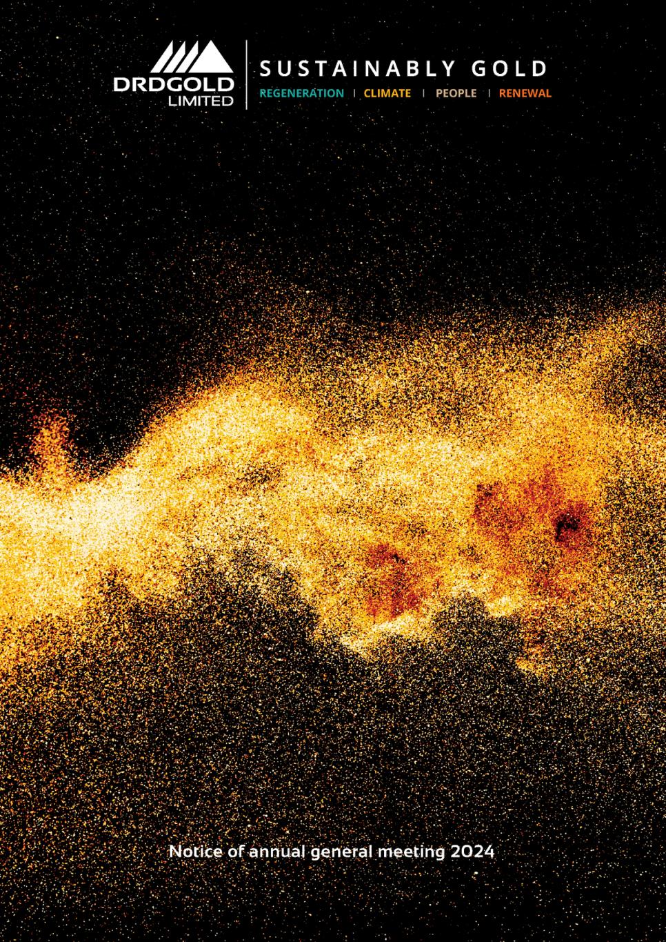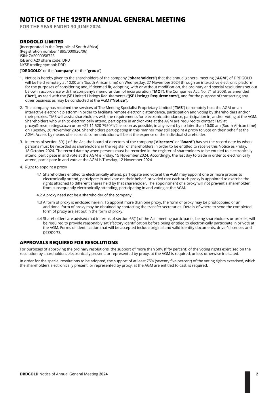DRDGOLD LIMITED (Incorporated in the Republic of South Africa) (Registration number 1895/000926/06) ISIN: ZAE000058723 JSE and A2X share code: DRD NYSE trading symbol: DRD (“DRDGOLD” or the “company” or the “group”) 1. Notice is hereby given to the shareholders of the company (“shareholders”) that the annual general meeting (“AGM”) of DRDGOLD will be held remotely at 10:00 am (South African time) on Wednesday, 27 November 2024 through an interactive electronic platform for the purposes of considering and, if deemed fit, adopting, with or without modification, the ordinary and special resolutions set out below in accordance with the company’s memorandum of incorporation (“MOI”), the Companies Act, No. 71 of 2008, as amended (“Act”), as read with the JSE Limited Listings Requirements (“JSE Listings Requirements”), and for the purpose of transacting any other business as may be conducted at the AGM (“Notice”). 2. The company has retained the services of The Meeting Specialist Proprietary Limited (“TMS”) to remotely host the AGM on an interactive electronic platform in order to facilitate remote electronic attendance, participation and voting by shareholders and/or their proxies. TMS will assist shareholders with the requirements for electronic attendance, participation in, and/or voting at the AGM. Shareholders who wish to electronically attend, participate in and/or vote at the AGM are required to contact TMS at proxy@tmsmeetings.co.za or on +27 11 520 7950/1/2 as soon as possible, in any event by no later than 10:00 am (South African time) on Tuesday, 26 November 2024. Shareholders participating in this manner may still appoint a proxy to vote on their behalf at the AGM. Access by means of electronic communication will be at the expense of the individual shareholder. 3. In terms of section 59(1) of the Act, the board of directors of the company (“directors” or “Board”) has set the record date by when persons must be recorded as shareholders in the register of shareholders in order to be entitled to receive this Notice as Friday, 18 October 2024. The record date by when persons must be recorded in the register of shareholders to be entitled to electronically attend, participate in and vote at the AGM is Friday, 15 November 2024. Accordingly, the last day to trade in order to electronically attend, participate in and vote at the AGM is Tuesday, 12 November 2024. 4. Right to appoint a proxy 4.1 Shareholders entitled to electronically attend, participate and vote at the AGM may appoint one or more proxies to electronically attend, participate in and vote on their behalf, provided that each such proxy is appointed to exercise the rights attached to different shares held by that shareholder. The appointment of a proxy will not prevent a shareholder from subsequently electronically attending, participating in and voting at the AGM. 4.2 A proxy need not be a shareholder of the company. 4.3 A form of proxy is enclosed herein. To appoint more than one proxy, the form of proxy may be photocopied or an additional form of proxy may be obtained by contacting the transfer secretaries. Details of where to send the completed form of proxy are set out in the form of proxy. 4.4 Shareholders are advised that in terms of section 63(1) of the Act, meeting participants, being shareholders or proxies, will be required to provide reasonably satisfactory identification before being entitled to electronically participate in or vote at the AGM. Forms of identification that will be accepted include original and valid identity documents, driver’s licences and passports. APPROVALS REQUIRED FOR RESOLUTIONS For purposes of approving the ordinary resolutions, the support of more than 50% (fifty percent) of the voting rights exercised on the resolution by shareholders electronically present, or represented by proxy, at the AGM is required, unless otherwise indicated. In order for the special resolutions to be adopted, the support of at least 75% (seventy five percent) of the voting rights exercised, which the shareholders electronically present, or represented by proxy, at the AGM are entitled to cast, is required. NOTICE OF THE 129TH ANNUAL GENERAL MEETING FOR THE YEAR ENDED 30 JUNE 2024 DRDGOLD Notice of Annual General Meeting 2024 2