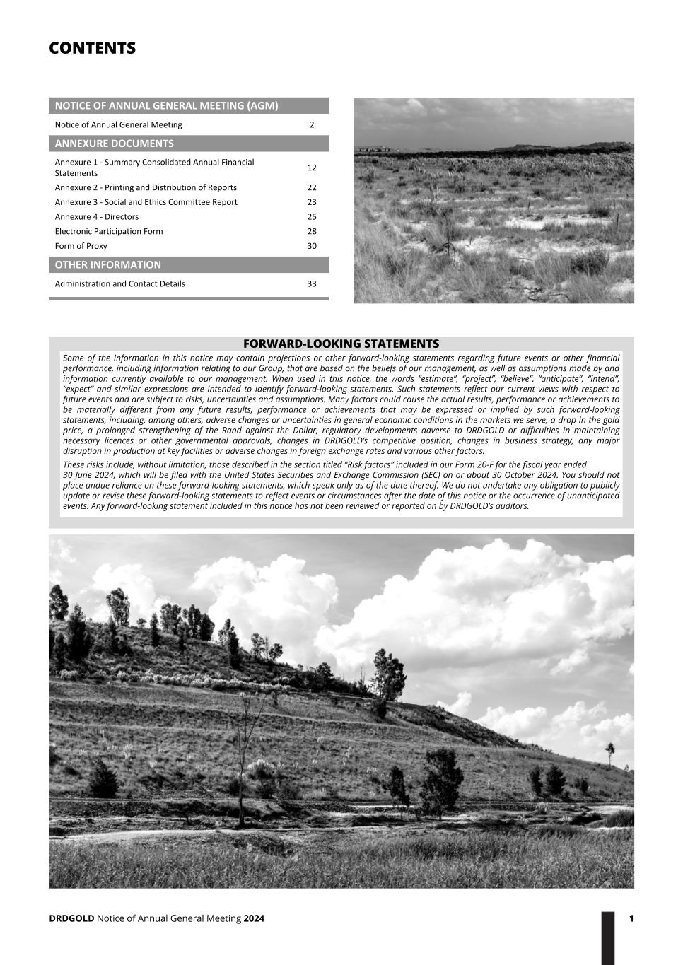 NOTICE OF ANNUAL GENERAL MEETING (AGM) Notice of Annual General Meeting 2 ANNEXURE DOCUMENTS Annexure 1 - Summary Consolidated Annual Financial Statements 12 Annexure 2 - Printing and Distribution of Reports 22 Annexure 3 - Social and Ethics Committee Report 23 Annexure 4 - Directors 25 Electronic Participation Form 28 Form of Proxy 30 OTHER INFORMATION Administration and Contact Details 33 FORWARD-LOOKING STATEMENTS Some of the information in this notice may contain projections or other forward-looking statements regarding future events or other financial performance, including information relating to our Group, that are based on the beliefs of our management, as well as assumptions made by and information currently available to our management. When used in this notice, the words “estimate”, “project”, “believe”, “anticipate”, “intend”, “expect” and similar expressions are intended to identify forward-looking statements. Such statements reflect our current views with respect to future events and are subject to risks, uncertainties and assumptions. Many factors could cause the actual results, performance or achievements to be materially different from any future results, performance or achievements that may be expressed or implied by such forward-looking statements, including, among others, adverse changes or uncertainties in general economic conditions in the markets we serve, a drop in the gold price, a prolonged strengthening of the Rand against the Dollar, regulatory developments adverse to DRDGOLD or difficulties in maintaining necessary licences or other governmental approvals, changes in DRDGOLD’s competitive position, changes in business strategy, any major disruption in production at key facilities or adverse changes in foreign exchange rates and various other factors. These risks include, without limitation, those described in the section titled “Risk factors” included in our Form 20-F for the fiscal year ended 30 June 2024, which will be filed with the United States Securities and Exchange Commission (SEC) on or about 30 October 2024. You should not place undue reliance on these forward-looking statements, which speak only as of the date thereof. We do not undertake any obligation to publicly update or revise these forward-looking statements to reflect events or circumstances after the date of this notice or the occurrence of unanticipated events. Any forward-looking statement included in this notice has not been reviewed or reported on by DRDGOLD’s auditors. CONTENTS DRDGOLD Notice of Annual General Meeting 2024 1