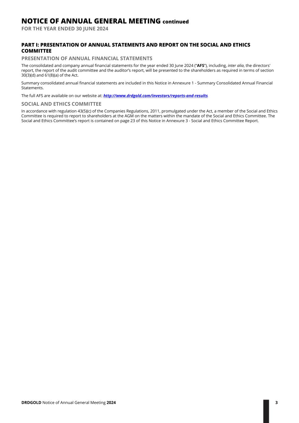 PART I: PRESENTATION OF ANNUAL STATEMENTS AND REPORT ON THE SOCIAL AND ETHICS COMMITTEE PRESENTATION OF ANNUAL FINANCIAL STATEMENTS The consolidated and company annual financial statements for the year ended 30 June 2024 (“AFS”), including, inter alia, the directors' report, the report of the audit committee and the auditor’s report, will be presented to the shareholders as required in terms of section 30(3)(d) and 61(8)(a) of the Act. Summary consolidated annual financial statements are included in this Notice in Annexure 1 - Summary Consolidated Annual Financial Statements. The full AFS are available on our website at: http://www.drdgold.com/investors/reports-and-results. SOCIAL AND ETHICS COMMITTEE In accordance with regulation 43(5)(c) of the Companies Regulations, 2011, promulgated under the Act, a member of the Social and Ethics Committee is required to report to shareholders at the AGM on the matters within the mandate of the Social and Ethics Committee. The Social and Ethics Committee’s report is contained on page 23 of this Notice in Annexure 3 - Social and Ethics Committee Report. NOTICE OF ANNUAL GENERAL MEETING continued FOR THE YEAR ENDED 30 JUNE 2024 DRDGOLD Notice of Annual General Meeting 2024 3