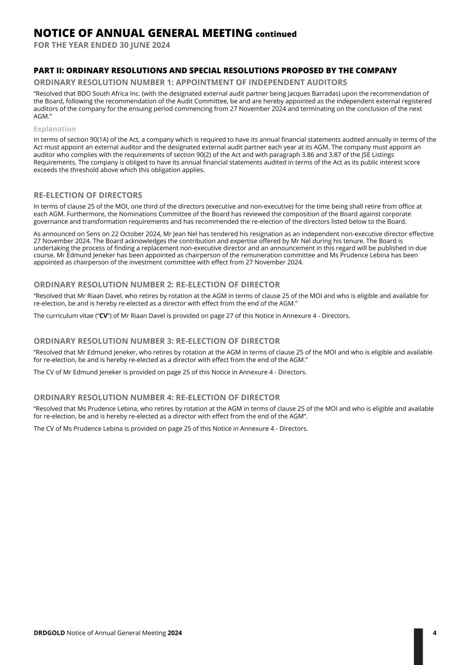 PART II: ORDINARY RESOLUTIONS AND SPECIAL RESOLUTIONS PROPOSED BY THE COMPANY ORDINARY RESOLUTION NUMBER 1: APPOINTMENT OF INDEPENDENT AUDITORS “Resolved that BDO South Africa Inc. (with the designated external audit partner being Jacques Barradas) upon the recommendation of the Board, following the recommendation of the Audit Committee, be and are hereby appointed as the independent external registered auditors of the company for the ensuing period commencing from 27 November 2024 and terminating on the conclusion of the next AGM.” Explanation In terms of section 90(1A) of the Act, a company which is required to have its annual financial statements audited annually in terms of the Act must appoint an external auditor and the designated external audit partner each year at its AGM. The company must appoint an auditor who complies with the requirements of section 90(2) of the Act and with paragraph 3.86 and 3.87 of the JSE Listings Requirements. The company is obliged to have its annual financial statements audited in terms of the Act as its public interest score exceeds the threshold above which this obligation applies. RE-ELECTION OF DIRECTORS In terms of clause 25 of the MOI, one third of the directors (executive and non-executive) for the time being shall retire from office at each AGM. Furthermore, the Nominations Committee of the Board has reviewed the composition of the Board against corporate governance and transformation requirements and has recommended the re-election of the directors listed below to the Board. As announced on Sens on 22 October 2024, Mr Jean Nel has tendered his resignation as an independent non-executive director effective 27 November 2024. The Board acknowledges the contribution and expertise offered by Mr Nel during his tenure. The Board is undertaking the process of finding a replacement non-executive director and an announcement in this regard will be published in due course. Mr Edmund Jeneker has been appointed as chairperson of the remuneration committee and Ms Prudence Lebina has been appointed as chairperson of the investment committee with effect from 27 November 2024. ORDINARY RESOLUTION NUMBER 2: RE-ELECTION OF DIRECTOR “Resolved that Mr Riaan Davel, who retires by rotation at the AGM in terms of clause 25 of the MOI and who is eligible and available for re-election, be and is hereby re-elected as a director with effect from the end of the AGM.” The curriculum vitae (“CV”) of Mr Riaan Davel is provided on page 27 of this Notice in Annexure 4 - Directors. ORDINARY RESOLUTION NUMBER 3: RE-ELECTION OF DIRECTOR “Resolved that Mr Edmund Jeneker, who retires by rotation at the AGM in terms of clause 25 of the MOI and who is eligible and available for re-election, be and is hereby re-elected as a director with effect from the end of the AGM.” The CV of Mr Edmund Jeneker is provided on page 25 of this Notice in Annexure 4 - Directors. ORDINARY RESOLUTION NUMBER 4: RE-ELECTION OF DIRECTOR “Resolved that Ms Prudence Lebina, who retires by rotation at the AGM in terms of clause 25 of the MOI and who is eligible and available for re-election, be and is hereby re-elected as a director with effect from the end of the AGM”. The CV of Ms Prudence Lebina is provided on page 25 of this Notice in Annexure 4 - Directors. NOTICE OF ANNUAL GENERAL MEETING continued FOR THE YEAR ENDED 30 JUNE 2024 DRDGOLD Notice of Annual General Meeting 2024 4