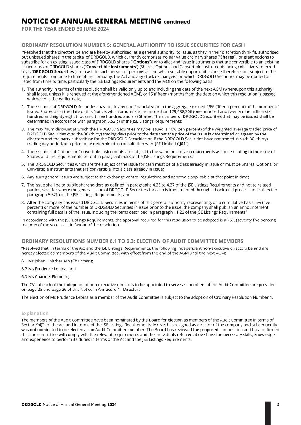 ORDINARY RESOLUTION NUMBER 5: GENERAL AUTHORITY TO ISSUE SECURITIES FOR CASH “Resolved that the directors be and are hereby authorised, as a general authority, to issue, as they in their discretion think fit, authorised but unissued shares in the capital of DRDGOLD, which currently comprises no par value ordinary shares (“Shares”), or grant options to subscribe for an existing issued class of DRDGOLD shares (“Options”), or to allot and issue instruments that are convertible to an existing issued class of DRDGOLD shares (“Convertible Instruments”) (Shares, Options and Convertible Instruments being collectively referred to as “DRDGOLD Securities”), for cash to such person or persons as and when suitable opportunities arise therefore, but subject to the requirements from time to time of the company, the Act and any stock exchange(s) on which DRDGOLD Securities may be quoted or listed from time to time, particularly the JSE Listings Requirements and the MOI on the following basis: 1. The authority in terms of this resolution shall be valid only up to and including the date of the next AGM (whereupon this authority shall lapse, unless it is renewed at the aforementioned AGM), or 15 (fifteen) months from the date on which this resolution is passed, whichever is the earlier date; 2. The issuance of DRDGOLD Securities may not in any one financial year in the aggregate exceed 15% (fifteen percent) of the number of issued Shares as at the date of this Notice, which amounts to no more than 129,688,306 (one hundred and twenty nine million six hundred and eighty eight thousand three hundred and six) Shares. The number of DRDGOLD Securities that may be issued shall be determined in accordance with paragraph 5.52(c) of the JSE Listings Requirements; 3. The maximum discount at which the DRDGOLD Securities may be issued is 10% (ten percent) of the weighted average traded price of DRDGOLD Securities over the 30 (thirty) trading days prior to the date that the price of the issue is determined or agreed by the directors and the party subscribing for the DRDGOLD Securities or, if the DRDGOLD Securities have not traded in such 30 (thirty) trading day period, at a price to be determined in consultation with JSE Limited ("JSE"); 4. The issuance of Options or Convertible Instruments are subject to the same or similar requirements as those relating to the issue of Shares and the requirements set out in paragraph 5.53 of the JSE Listings Requirements; 5. The DRDGOLD Securities which are the subject of the issue for cash must be of a class already in issue or must be Shares, Options, or Convertible Instruments that are convertible into a class already in issue; 6. Any such general issues are subject to the exchange control regulations and approvals applicable at that point in time; 7. The issue shall be to public shareholders as defined in paragraphs 4.25 to 4.27 of the JSE Listings Requirements and not to related parties, save for where the general issue of DRDGOLD Securities for cash is implemented through a bookbuild process and subject to paragraph 5.52(f) of the JSE Listings Requirements; and 8. After the company has issued DRDGOLD Securities in terms of this general authority representing, on a cumulative basis, 5% (five percent) or more of the number of DRDGOLD Securities in issue prior to the issue, the company shall publish an announcement containing full details of the issue, including the items described in paragraph 11.22 of the JSE Listings Requirements” In accordance with the JSE Listings Requirements, the approval required for this resolution to be adopted is a 75% (seventy five percent) majority of the votes cast in favour of the resolution. ORDINARY RESOLUTIONS NUMBER 6.1 TO 6.3: ELECTION OF AUDIT COMMITTEE MEMBERS “Resolved that, in terms of the Act and the JSE Listings Requirements, the following independent non-executive directors be and are hereby elected as members of the Audit Committee, with effect from the end of the AGM until the next AGM: 6.1 Mr Johan Holtzhausen (Chairman); 6.2 Ms Prudence Lebina; and 6.3 Ms Charmel Flemming The CVs of each of the independent non-executive directors to be appointed to serve as members of the Audit Committee are provided on page 25 and page 26 of this Notice in Annexure 4 - Directors. The election of Ms Prudence Lebina as a member of the Audit Committee is subject to the adoption of Ordinary Resolution Number 4. Explanation The members of the Audit Committee have been nominated by the Board for election as members of the Audit Committee in terms of Section 94(2) of the Act and in terms of the JSE Listings Requirements. Mr Nel has resigned as director of the company and subsequently was not nominated to be elected as an Audit Committee member. The Board has reviewed the proposed composition and has confirmed that the committee will comply with the relevant requirements and the individuals referred above have the necessary skills, knowledge and experience to perform its duties in terms of the Act and the JSE Listings Requirements. NOTICE OF ANNUAL GENERAL MEETING continued FOR THE YEAR ENDED 30 JUNE 2024 DRDGOLD Notice of Annual General Meeting 2024 5
