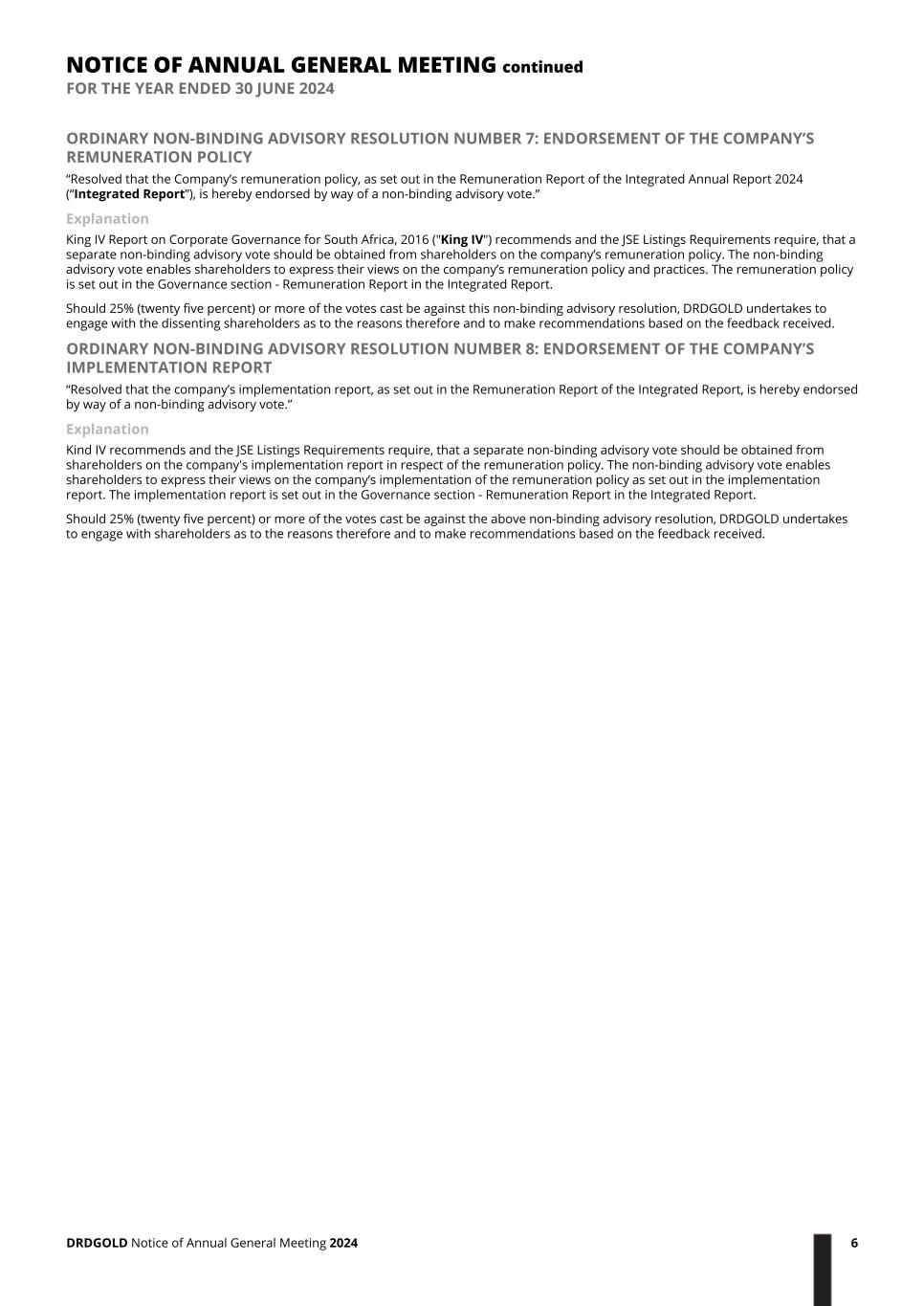 ORDINARY NON-BINDING ADVISORY RESOLUTION NUMBER 7: ENDORSEMENT OF THE COMPANY’S REMUNERATION POLICY “Resolved that the Company’s remuneration policy, as set out in the Remuneration Report of the Integrated Annual Report 2024 (“Integrated Report”), is hereby endorsed by way of a non-binding advisory vote.” Explanation King IV Report on Corporate Governance for South Africa, 2016 ("King IV") recommends and the JSE Listings Requirements require, that a separate non-binding advisory vote should be obtained from shareholders on the company’s remuneration policy. The non-binding advisory vote enables shareholders to express their views on the company’s remuneration policy and practices. The remuneration policy is set out in the Governance section - Remuneration Report in the Integrated Report. Should 25% (twenty five percent) or more of the votes cast be against this non-binding advisory resolution, DRDGOLD undertakes to engage with the dissenting shareholders as to the reasons therefore and to make recommendations based on the feedback received. ORDINARY NON-BINDING ADVISORY RESOLUTION NUMBER 8: ENDORSEMENT OF THE COMPANY’S IMPLEMENTATION REPORT “Resolved that the company’s implementation report, as set out in the Remuneration Report of the Integrated Report, is hereby endorsed by way of a non-binding advisory vote.” Explanation Kind IV recommends and the JSE Listings Requirements require, that a separate non-binding advisory vote should be obtained from shareholders on the company's implementation report in respect of the remuneration policy. The non-binding advisory vote enables shareholders to express their views on the company’s implementation of the remuneration policy as set out in the implementation report. The implementation report is set out in the Governance section - Remuneration Report in the Integrated Report. Should 25% (twenty five percent) or more of the votes cast be against the above non-binding advisory resolution, DRDGOLD undertakes to engage with shareholders as to the reasons therefore and to make recommendations based on the feedback received. NOTICE OF ANNUAL GENERAL MEETING continued FOR THE YEAR ENDED 30 JUNE 2024 DRDGOLD Notice of Annual General Meeting 2024 6