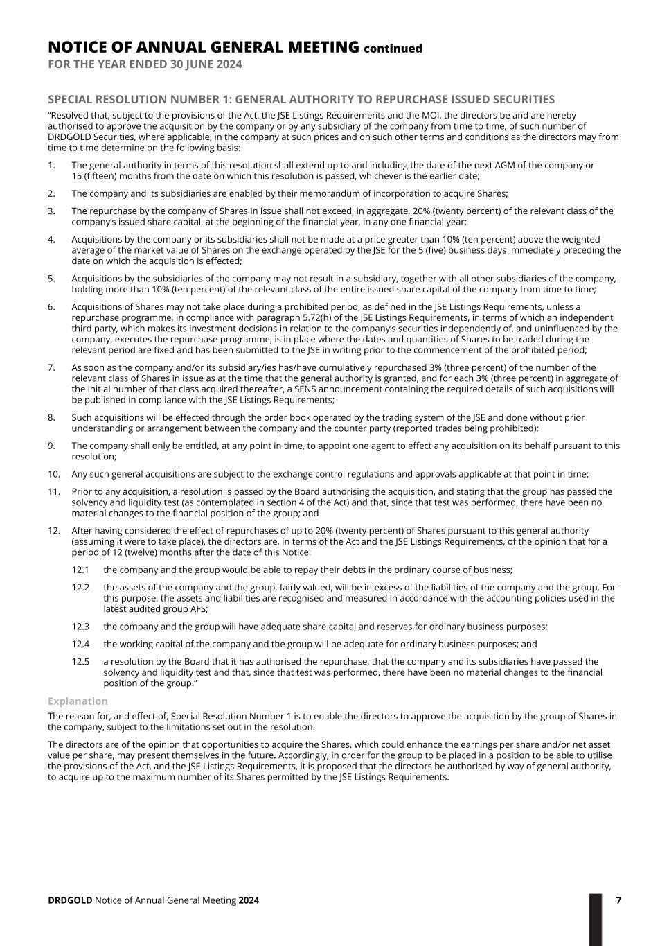 SPECIAL RESOLUTION NUMBER 1: GENERAL AUTHORITY TO REPURCHASE ISSUED SECURITIES “Resolved that, subject to the provisions of the Act, the JSE Listings Requirements and the MOI, the directors be and are hereby authorised to approve the acquisition by the company or by any subsidiary of the company from time to time, of such number of DRDGOLD Securities, where applicable, in the company at such prices and on such other terms and conditions as the directors may from time to time determine on the following basis: 1. The general authority in terms of this resolution shall extend up to and including the date of the next AGM of the company or 15 (fifteen) months from the date on which this resolution is passed, whichever is the earlier date; 2. The company and its subsidiaries are enabled by their memorandum of incorporation to acquire Shares; 3. The repurchase by the company of Shares in issue shall not exceed, in aggregate, 20% (twenty percent) of the relevant class of the company’s issued share capital, at the beginning of the financial year, in any one financial year; 4. Acquisitions by the company or its subsidiaries shall not be made at a price greater than 10% (ten percent) above the weighted average of the market value of Shares on the exchange operated by the JSE for the 5 (five) business days immediately preceding the date on which the acquisition is effected; 5. Acquisitions by the subsidiaries of the company may not result in a subsidiary, together with all other subsidiaries of the company, holding more than 10% (ten percent) of the relevant class of the entire issued share capital of the company from time to time; 6. Acquisitions of Shares may not take place during a prohibited period, as defined in the JSE Listings Requirements, unless a repurchase programme, in compliance with paragraph 5.72(h) of the JSE Listings Requirements, in terms of which an independent third party, which makes its investment decisions in relation to the company’s securities independently of, and uninfluenced by the company, executes the repurchase programme, is in place where the dates and quantities of Shares to be traded during the relevant period are fixed and has been submitted to the JSE in writing prior to the commencement of the prohibited period; 7. As soon as the company and/or its subsidiary/ies has/have cumulatively repurchased 3% (three percent) of the number of the relevant class of Shares in issue as at the time that the general authority is granted, and for each 3% (three percent) in aggregate of the initial number of that class acquired thereafter, a SENS announcement containing the required details of such acquisitions will be published in compliance with the JSE Listings Requirements; 8. Such acquisitions will be effected through the order book operated by the trading system of the JSE and done without prior understanding or arrangement between the company and the counter party (reported trades being prohibited); 9. The company shall only be entitled, at any point in time, to appoint one agent to effect any acquisition on its behalf pursuant to this resolution; 10. Any such general acquisitions are subject to the exchange control regulations and approvals applicable at that point in time; 11. Prior to any acquisition, a resolution is passed by the Board authorising the acquisition, and stating that the group has passed the solvency and liquidity test (as contemplated in section 4 of the Act) and that, since that test was performed, there have been no material changes to the financial position of the group; and 12. After having considered the effect of repurchases of up to 20% (twenty percent) of Shares pursuant to this general authority (assuming it were to take place), the directors are, in terms of the Act and the JSE Listings Requirements, of the opinion that for a period of 12 (twelve) months after the date of this Notice: 12.1 the company and the group would be able to repay their debts in the ordinary course of business; 12.2 the assets of the company and the group, fairly valued, will be in excess of the liabilities of the company and the group. For this purpose, the assets and liabilities are recognised and measured in accordance with the accounting policies used in the latest audited group AFS; 12.3 the company and the group will have adequate share capital and reserves for ordinary business purposes; 12.4 the working capital of the company and the group will be adequate for ordinary business purposes; and 12.5 a resolution by the Board that it has authorised the repurchase, that the company and its subsidiaries have passed the solvency and liquidity test and that, since that test was performed, there have been no material changes to the financial position of the group.” Explanation The reason for, and effect of, Special Resolution Number 1 is to enable the directors to approve the acquisition by the group of Shares in the company, subject to the limitations set out in the resolution. The directors are of the opinion that opportunities to acquire the Shares, which could enhance the earnings per share and/or net asset value per share, may present themselves in the future. Accordingly, in order for the group to be placed in a position to be able to utilise the provisions of the Act, and the JSE Listings Requirements, it is proposed that the directors be authorised by way of general authority, to acquire up to the maximum number of its Shares permitted by the JSE Listings Requirements. NOTICE OF ANNUAL GENERAL MEETING continued FOR THE YEAR ENDED 30 JUNE 2024 DRDGOLD Notice of Annual General Meeting 2024 7