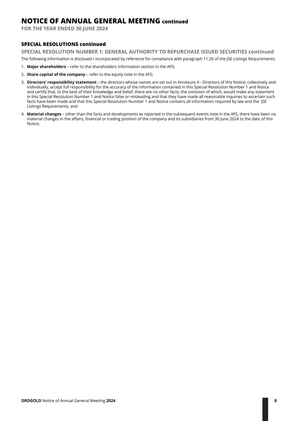 SPECIAL RESOLUTIONS continued SPECIAL RESOLUTION NUMBER 1: GENERAL AUTHORITY TO REPURCHASE ISSUED SECURITIES continued The following information is disclosed / incorporated by reference for compliance with paragraph 11.26 of the JSE Listings Requirements: 1. Major shareholders – refer to the shareholders information section in the AFS; 2. Share capital of the company – refer to the equity note in the AFS; 3. Directors’ responsibility statement – the directors whose names are set out in Annexure 4 - Directors of this Notice; collectively and individually, accept full responsibility for the accuracy of the information contained in this Special Resolution Number 1 and Notice and certify that, to the best of their knowledge and belief, there are no other facts, the omission of which, would make any statement in this Special Resolution Number 1 and Notice false or misleading and that they have made all reasonable inquiries to ascertain such facts have been made and that this Special Resolution Number 1 and Notice contains all information required by law and the JSE Listings Requirements; and 4. Material changes – other than the facts and developments as reported in the subsequent events note in the AFS, there have been no material changes in the affairs, financial or trading position of the company and its subsidiaries from 30 June 2024 to the date of this Notice. NOTICE OF ANNUAL GENERAL MEETING continued FOR THE YEAR ENDED 30 JUNE 2024 DRDGOLD Notice of Annual General Meeting 2024 8
