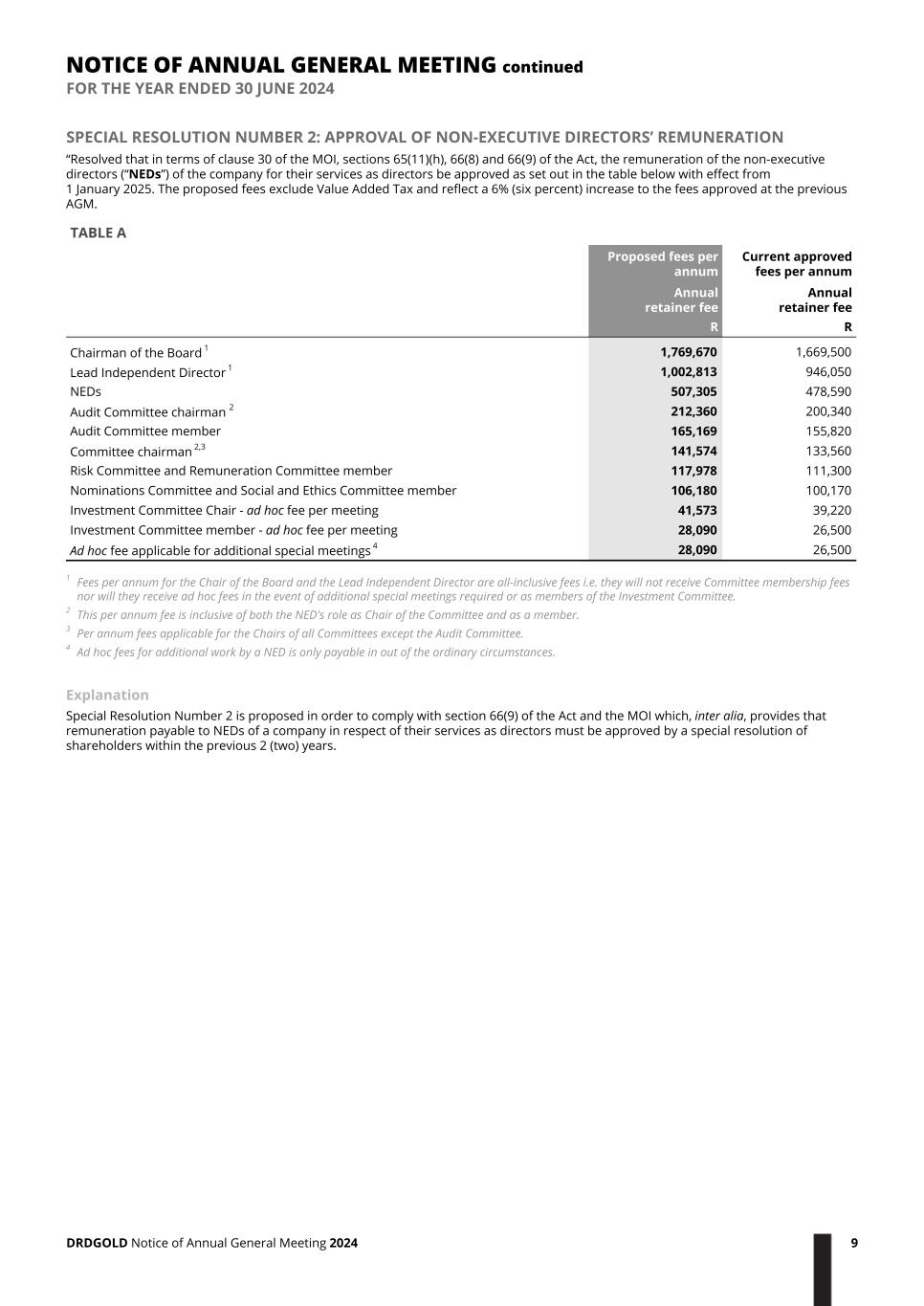 SPECIAL RESOLUTION NUMBER 2: APPROVAL OF NON-EXECUTIVE DIRECTORS’ REMUNERATION “Resolved that in terms of clause 30 of the MOI, sections 65(11)(h), 66(8) and 66(9) of the Act, the remuneration of the non-executive directors (“NEDs”) of the company for their services as directors be approved as set out in the table below with effect from 1 January 2025. The proposed fees exclude Value Added Tax and reflect a 6% (six percent) increase to the fees approved at the previous AGM. TABLE A Proposed fees per annum Current approved fees per annum Annual retainer fee Annual retainer fee R R Chairman of the Board 1 1,769,670 1,669,500 Lead Independent Director 1 1,002,813 946,050 NEDs 507,305 478,590 Audit Committee chairman 2 212,360 200,340 Audit Committee member 165,169 155,820 Committee chairman 2,3 141,574 133,560 Risk Committee and Remuneration Committee member 117,978 111,300 Nominations Committee and Social and Ethics Committee member 106,180 100,170 Investment Committee Chair - ad hoc fee per meeting 41,573 39,220 Investment Committee member - ad hoc fee per meeting 28,090 26,500 Ad hoc fee applicable for additional special meetings 4 28,090 26,500 1 Fees per annum for the Chair of the Board and the Lead Independent Director are all-inclusive fees i.e. they will not receive Committee membership fees nor will they receive ad hoc fees in the event of additional special meetings required or as members of the Investment Committee. 2 This per annum fee is inclusive of both the NED's role as Chair of the Committee and as a member. 3 Per annum fees applicable for the Chairs of all Committees except the Audit Committee. 4 Ad hoc fees for additional work by a NED is only payable in out of the ordinary circumstances. Explanation Special Resolution Number 2 is proposed in order to comply with section 66(9) of the Act and the MOI which, inter alia, provides that remuneration payable to NEDs of a company in respect of their services as directors must be approved by a special resolution of shareholders within the previous 2 (two) years. NOTICE OF ANNUAL GENERAL MEETING continued FOR THE YEAR ENDED 30 JUNE 2024 DRDGOLD Notice of Annual General Meeting 2024 9