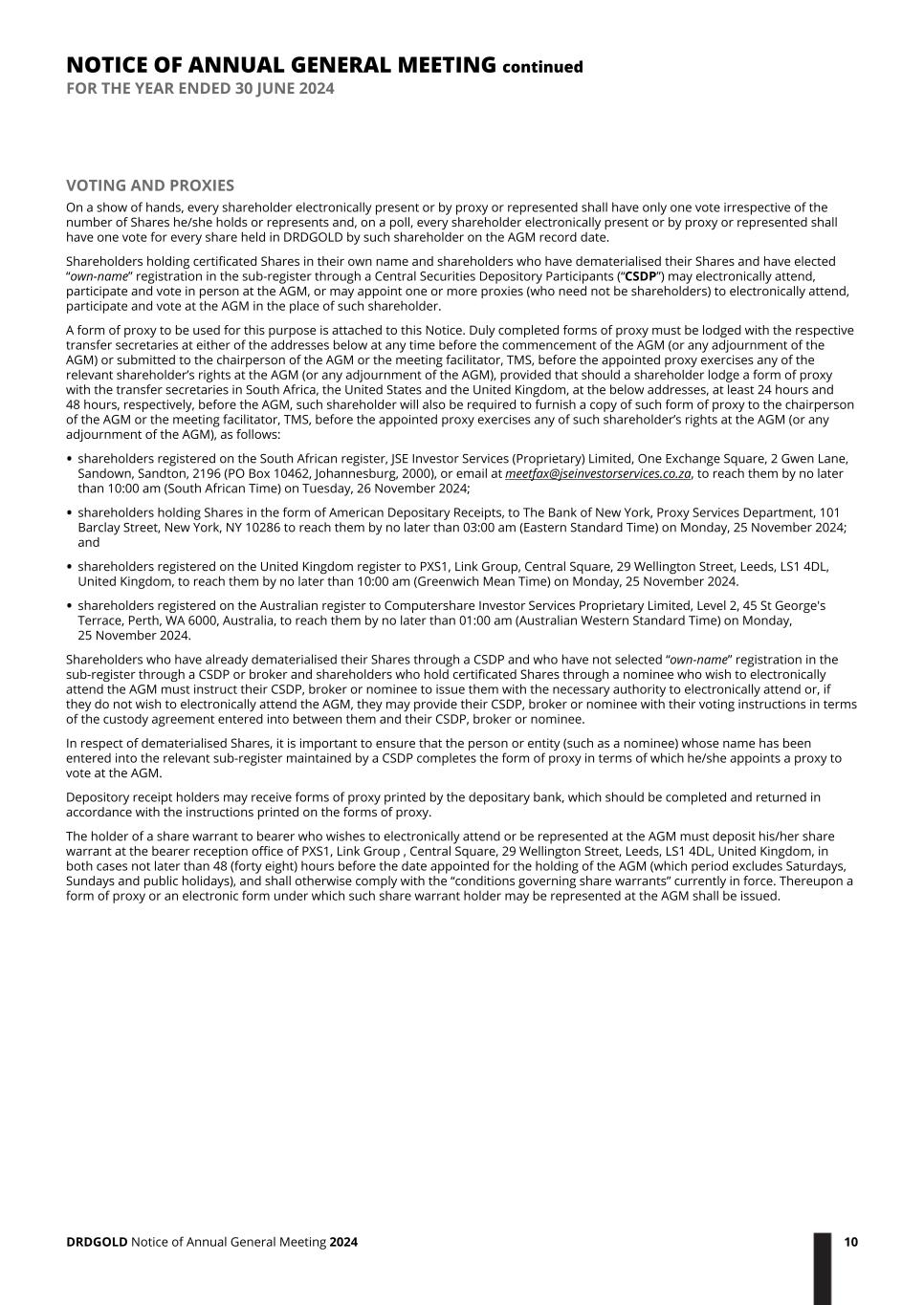 VOTING AND PROXIES On a show of hands, every shareholder electronically present or by proxy or represented shall have only one vote irrespective of the number of Shares he/she holds or represents and, on a poll, every shareholder electronically present or by proxy or represented shall have one vote for every share held in DRDGOLD by such shareholder on the AGM record date. Shareholders holding certificated Shares in their own name and shareholders who have dematerialised their Shares and have elected “own-name” registration in the sub-register through a Central Securities Depository Participants (“CSDP”) may electronically attend, participate and vote in person at the AGM, or may appoint one or more proxies (who need not be shareholders) to electronically attend, participate and vote at the AGM in the place of such shareholder. A form of proxy to be used for this purpose is attached to this Notice. Duly completed forms of proxy must be lodged with the respective transfer secretaries at either of the addresses below at any time before the commencement of the AGM (or any adjournment of the AGM) or submitted to the chairperson of the AGM or the meeting facilitator, TMS, before the appointed proxy exercises any of the relevant shareholder’s rights at the AGM (or any adjournment of the AGM), provided that should a shareholder lodge a form of proxy with the transfer secretaries in South Africa, the United States and the United Kingdom, at the below addresses, at least 24 hours and 48 hours, respectively, before the AGM, such shareholder will also be required to furnish a copy of such form of proxy to the chairperson of the AGM or the meeting facilitator, TMS, before the appointed proxy exercises any of such shareholder’s rights at the AGM (or any adjournment of the AGM), as follows: • shareholders registered on the South African register, JSE Investor Services (Proprietary) Limited, One Exchange Square, 2 Gwen Lane, Sandown, Sandton, 2196 (PO Box 10462, Johannesburg, 2000), or email at meetfax@jseinvestorservices.co.za, to reach them by no later than 10:00 am (South African Time) on Tuesday, 26 November 2024; • shareholders holding Shares in the form of American Depositary Receipts, to The Bank of New York, Proxy Services Department, 101 Barclay Street, New York, NY 10286 to reach them by no later than 03:00 am (Eastern Standard Time) on Monday, 25 November 2024; and • shareholders registered on the United Kingdom register to PXS1, Link Group, Central Square, 29 Wellington Street, Leeds, LS1 4DL, United Kingdom, to reach them by no later than 10:00 am (Greenwich Mean Time) on Monday, 25 November 2024. • shareholders registered on the Australian register to Computershare Investor Services Proprietary Limited, Level 2, 45 St George's Terrace, Perth, WA 6000, Australia, to reach them by no later than 01:00 am (Australian Western Standard Time) on Monday, 25 November 2024. Shareholders who have already dematerialised their Shares through a CSDP and who have not selected “own-name” registration in the sub-register through a CSDP or broker and shareholders who hold certificated Shares through a nominee who wish to electronically attend the AGM must instruct their CSDP, broker or nominee to issue them with the necessary authority to electronically attend or, if they do not wish to electronically attend the AGM, they may provide their CSDP, broker or nominee with their voting instructions in terms of the custody agreement entered into between them and their CSDP, broker or nominee. In respect of dematerialised Shares, it is important to ensure that the person or entity (such as a nominee) whose name has been entered into the relevant sub-register maintained by a CSDP completes the form of proxy in terms of which he/she appoints a proxy to vote at the AGM. Depository receipt holders may receive forms of proxy printed by the depositary bank, which should be completed and returned in accordance with the instructions printed on the forms of proxy. The holder of a share warrant to bearer who wishes to electronically attend or be represented at the AGM must deposit his/her share warrant at the bearer reception office of PXS1, Link Group , Central Square, 29 Wellington Street, Leeds, LS1 4DL, United Kingdom, in both cases not later than 48 (forty eight) hours before the date appointed for the holding of the AGM (which period excludes Saturdays, Sundays and public holidays), and shall otherwise comply with the “conditions governing share warrants” currently in force. Thereupon a form of proxy or an electronic form under which such share warrant holder may be represented at the AGM shall be issued. NOTICE OF ANNUAL GENERAL MEETING continued FOR THE YEAR ENDED 30 JUNE 2024 DRDGOLD Notice of Annual General Meeting 2024 10