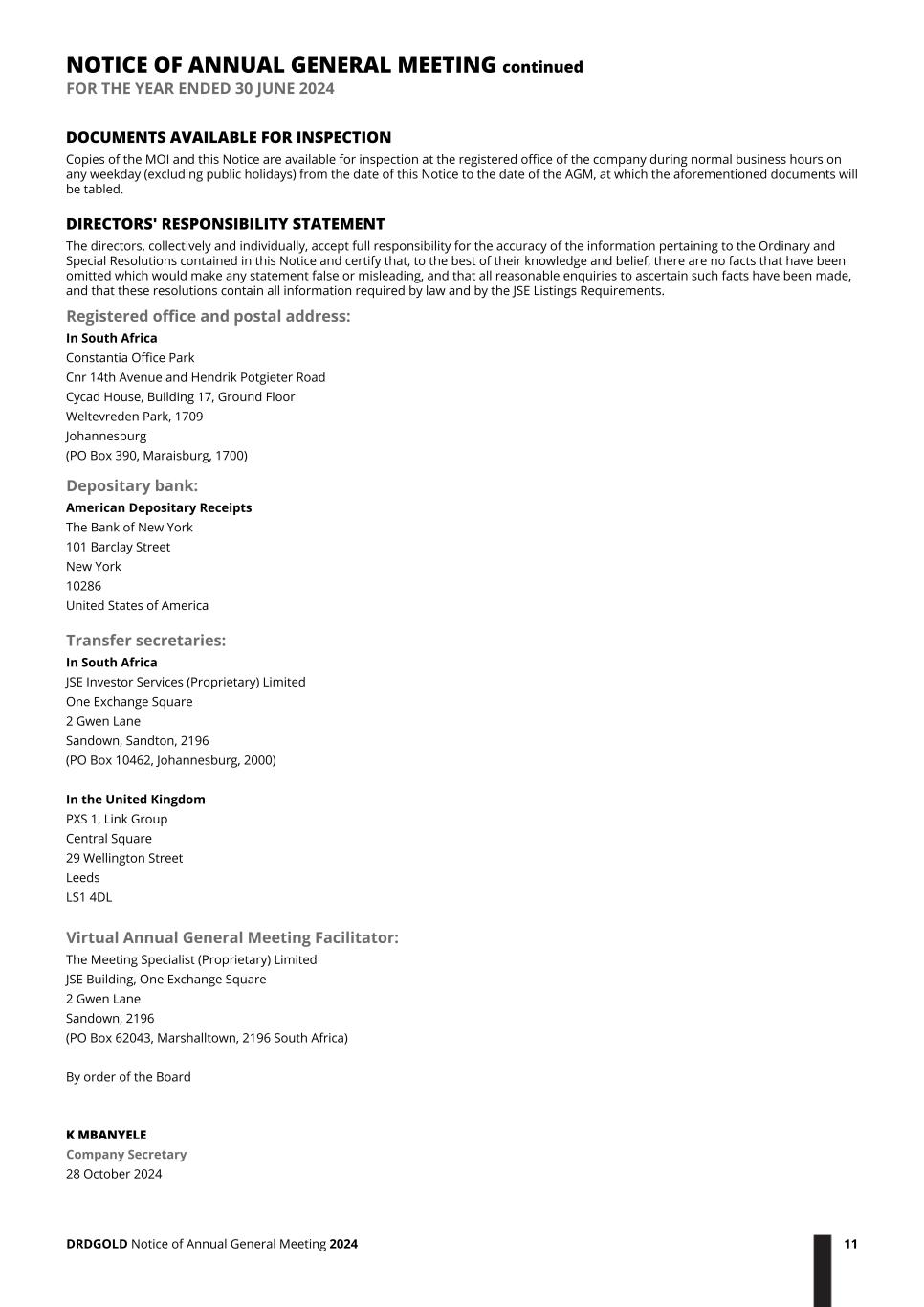 DOCUMENTS AVAILABLE FOR INSPECTION Copies of the MOI and this Notice are available for inspection at the registered office of the company during normal business hours on any weekday (excluding public holidays) from the date of this Notice to the date of the AGM, at which the aforementioned documents will be tabled. DIRECTORS' RESPONSIBILITY STATEMENT The directors, collectively and individually, accept full responsibility for the accuracy of the information pertaining to the Ordinary and Special Resolutions contained in this Notice and certify that, to the best of their knowledge and belief, there are no facts that have been omitted which would make any statement false or misleading, and that all reasonable enquiries to ascertain such facts have been made, and that these resolutions contain all information required by law and by the JSE Listings Requirements. Registered office and postal address: In South Africa Constantia Office Park Cnr 14th Avenue and Hendrik Potgieter Road Cycad House, Building 17, Ground Floor Weltevreden Park, 1709 Johannesburg (PO Box 390, Maraisburg, 1700) Depositary bank: American Depositary Receipts The Bank of New York 101 Barclay Street New York 10286 United States of America Transfer secretaries: In South Africa JSE Investor Services (Proprietary) Limited One Exchange Square 2 Gwen Lane Sandown, Sandton, 2196 (PO Box 10462, Johannesburg, 2000) In the United Kingdom PXS 1, Link Group Central Square 29 Wellington Street Leeds LS1 4DL Virtual Annual General Meeting Facilitator: The Meeting Specialist (Proprietary) Limited JSE Building, One Exchange Square 2 Gwen Lane Sandown, 2196 (PO Box 62043, Marshalltown, 2196 South Africa) By order of the Board K MBANYELE Company Secretary 28 October 2024 NOTICE OF ANNUAL GENERAL MEETING continued FOR THE YEAR ENDED 30 JUNE 2024 DRDGOLD Notice of Annual General Meeting 2024 11