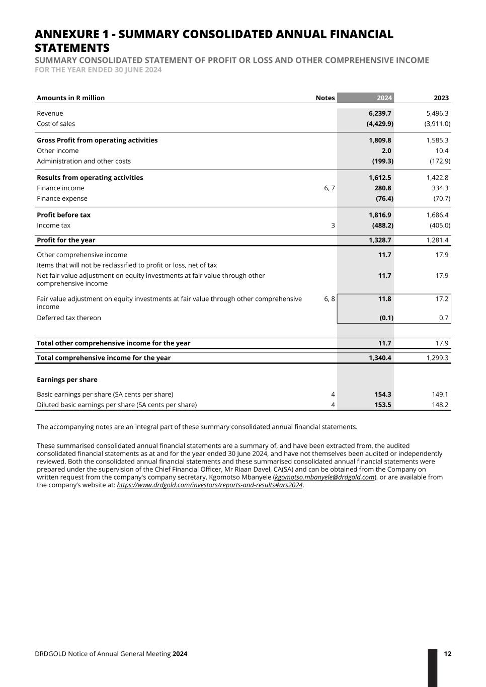 Amounts in R million Notes 2024 2023 Revenue 6,239.7 5,496.3 Cost of sales (4,429.9) (3,911.0) Gross Profit from operating activities 1,809.8 1,585.3 Other income 2.0 10.4 Administration and other costs (199.3) (172.9) Results from operating activities 1,612.5 1,422.8 Finance income 6, 7 280.8 334.3 Finance expense (76.4) (70.7) Profit before tax 1,816.9 1,686.4 Income tax 3 (488.2) (405.0) Profit for the year 1,328.7 1,281.4 Other comprehensive income 11.7 17.9 Items that will not be reclassified to profit or loss, net of tax Net fair value adjustment on equity investments at fair value through other comprehensive income 11.7 17.9 Fair value adjustment on equity investments at fair value through other comprehensive income 6, 8 11.8 17.2 Deferred tax thereon (0.1) 0.7 Total other comprehensive income for the year 11.7 17.9 Total comprehensive income for the year 1,340.4 1,299.3 Earnings per share Basic earnings per share (SA cents per share) 4 154.3 149.1 Diluted basic earnings per share (SA cents per share) 4 153.5 148.2 The accompanying notes are an integral part of these summary consolidated annual financial statements. These summarised consolidated annual financial statements are a summary of, and have been extracted from, the audited consolidated financial statements as at and for the year ended 30 June 2024, and have not themselves been audited or independently reviewed. Both the consolidated annual financial statements and these summarised consolidated annual financial statements were prepared under the supervision of the Chief Financial Officer, Mr Riaan Davel, CA(SA) and can be obtained from the Company on written request from the company's company secretary, Kgomotso Mbanyele (kgomotso.mbanyele@drdgold.com), or are available from the company’s website at: https://www.drdgold.com/investors/reports-and-results#ars2024. ANNEXURE 1 - SUMMARY CONSOLIDATED ANNUAL FINANCIAL STATEMENTS SUMMARY CONSOLIDATED STATEMENT OF PROFIT OR LOSS AND OTHER COMPREHENSIVE INCOME FOR THE YEAR ENDED 30 JUNE 2024 DRDGOLD Notice of Annual General Meeting 2024 12