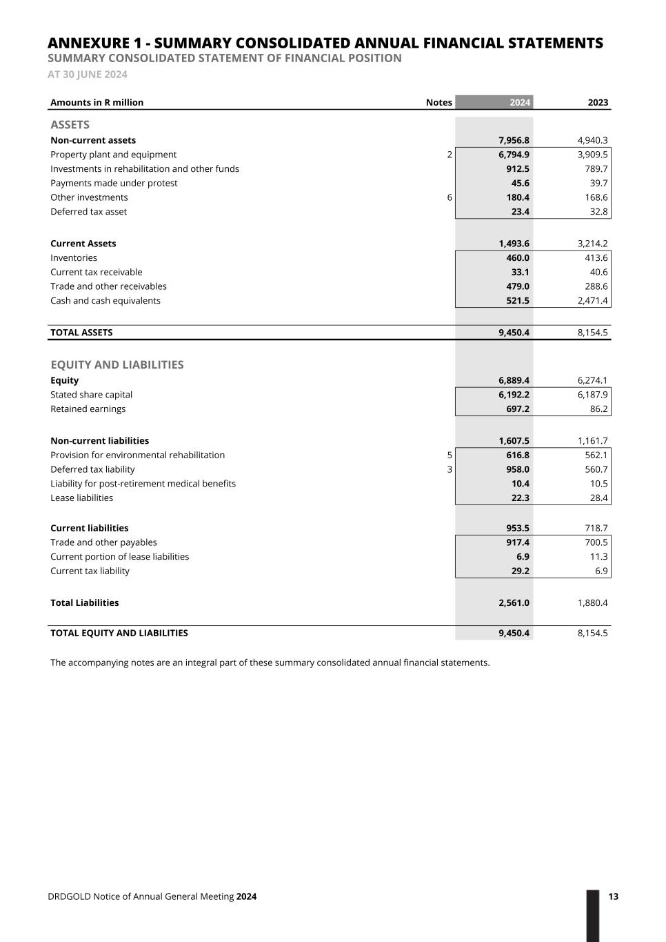 Amounts in R million Notes 2024 2023 ASSETS Non-current assets 7,956.8 4,940.3 Property plant and equipment 2 6,794.9 3,909.5 Investments in rehabilitation and other funds 912.5 789.7 Payments made under protest 45.6 39.7 Other investments 6 180.4 168.6 Deferred tax asset 23.4 32.8 Current Assets 1,493.6 3,214.2 Inventories 460.0 413.6 Current tax receivable 33.1 40.6 Trade and other receivables 479.0 288.6 Cash and cash equivalents 521.5 2,471.4 TOTAL ASSETS 9,450.4 8,154.5 EQUITY AND LIABILITIES Equity 6,889.4 6,274.1 Stated share capital 6,192.2 6,187.9 Retained earnings 697.2 86.2 Non-current liabilities 1,607.5 1,161.7 Provision for environmental rehabilitation 5 616.8 562.1 Deferred tax liability 3 958.0 560.7 Liability for post-retirement medical benefits 10.4 10.5 Lease liabilities 22.3 28.4 Current liabilities 953.5 718.7 Trade and other payables 917.4 700.5 Current portion of lease liabilities 6.9 11.3 Current tax liability 29.2 6.9 Total Liabilities 2,561.0 1,880.4 TOTAL EQUITY AND LIABILITIES 9,450.4 8,154.5 The accompanying notes are an integral part of these summary consolidated annual financial statements. ANNEXURE 1 - SUMMARY CONSOLIDATED ANNUAL FINANCIAL STATEMENTS SUMMARY CONSOLIDATED STATEMENT OF FINANCIAL POSITION AT 30 JUNE 2024 DRDGOLD Notice of Annual General Meeting 2024 13