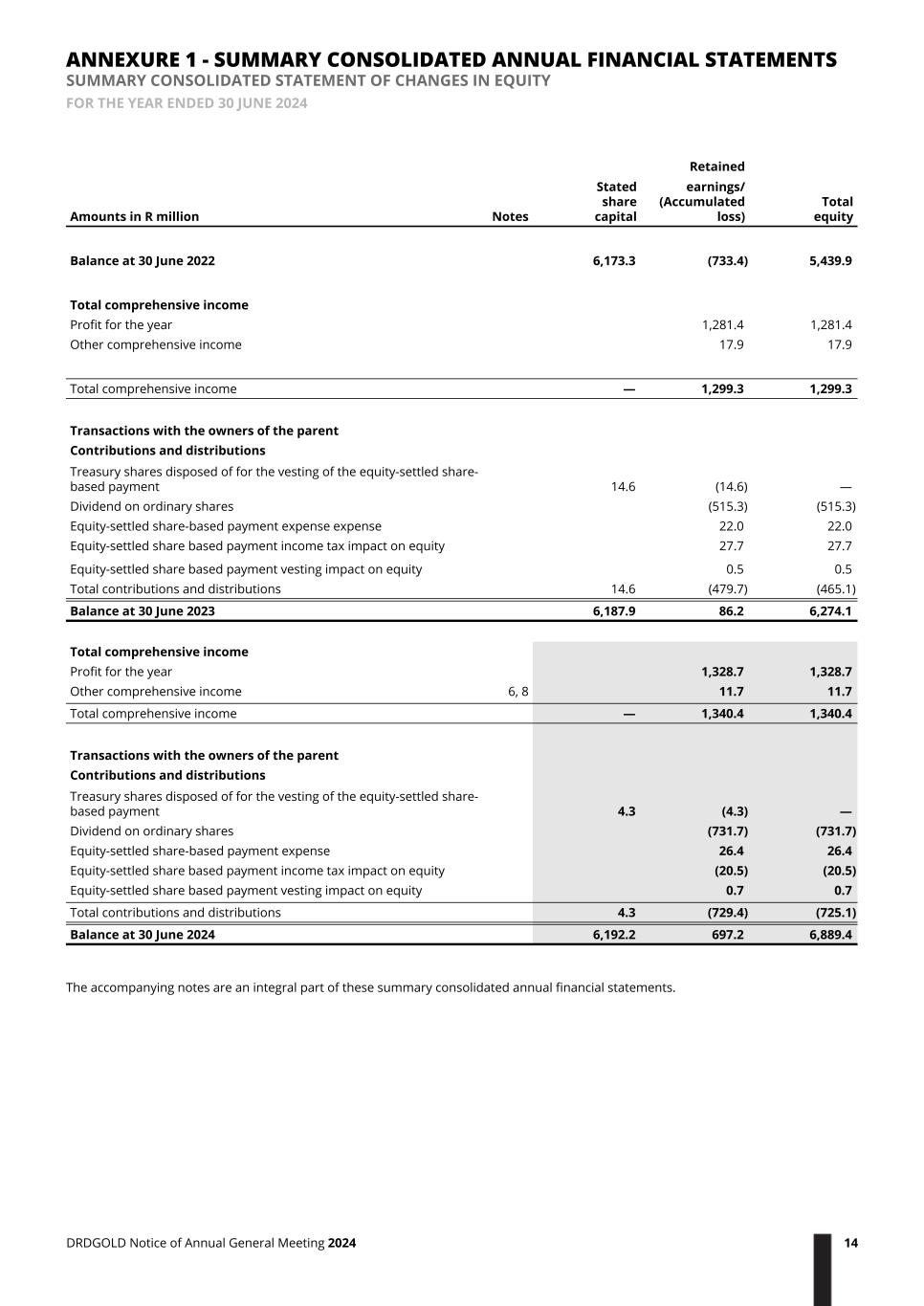 Retained Amounts in R million Notes Stated share capital earnings/ (Accumulated loss) Total equity Balance at 30 June 2022 6,173.3 (733.4) 5,439.9 Total comprehensive income Profit for the year 1,281.4 1,281.4 Other comprehensive income 17.9 17.9 Total comprehensive income — 1,299.3 1,299.3 Transactions with the owners of the parent Contributions and distributions Treasury shares disposed of for the vesting of the equity-settled share- based payment 14.6 (14.6) — Dividend on ordinary shares (515.3) (515.3) Equity-settled share-based payment expense expense 22.0 22.0 Equity-settled share based payment income tax impact on equity 27.7 27.7 Equity-settled share based payment vesting impact on equity 0.5 0.5 Total contributions and distributions 14.6 (479.7) (465.1) Balance at 30 June 2023 6,187.9 86.2 6,274.1 Total comprehensive income Profit for the year 1,328.7 1,328.7 Other comprehensive income 6, 8 11.7 11.7 Total comprehensive income — 1,340.4 1,340.4 Transactions with the owners of the parent Contributions and distributions Treasury shares disposed of for the vesting of the equity-settled share- based payment 4.3 (4.3) — Dividend on ordinary shares (731.7) (731.7) Equity-settled share-based payment expense 26.4 26.4 Equity-settled share based payment income tax impact on equity (20.5) (20.5) Equity-settled share based payment vesting impact on equity 0.7 0.7 Total contributions and distributions 4.3 (729.4) (725.1) Balance at 30 June 2024 6,192.2 697.2 6,889.4 The accompanying notes are an integral part of these summary consolidated annual financial statements. ANNEXURE 1 - SUMMARY CONSOLIDATED ANNUAL FINANCIAL STATEMENTS SUMMARY CONSOLIDATED STATEMENT OF CHANGES IN EQUITY FOR THE YEAR ENDED 30 JUNE 2024 DRDGOLD Notice of Annual General Meeting 2024 14