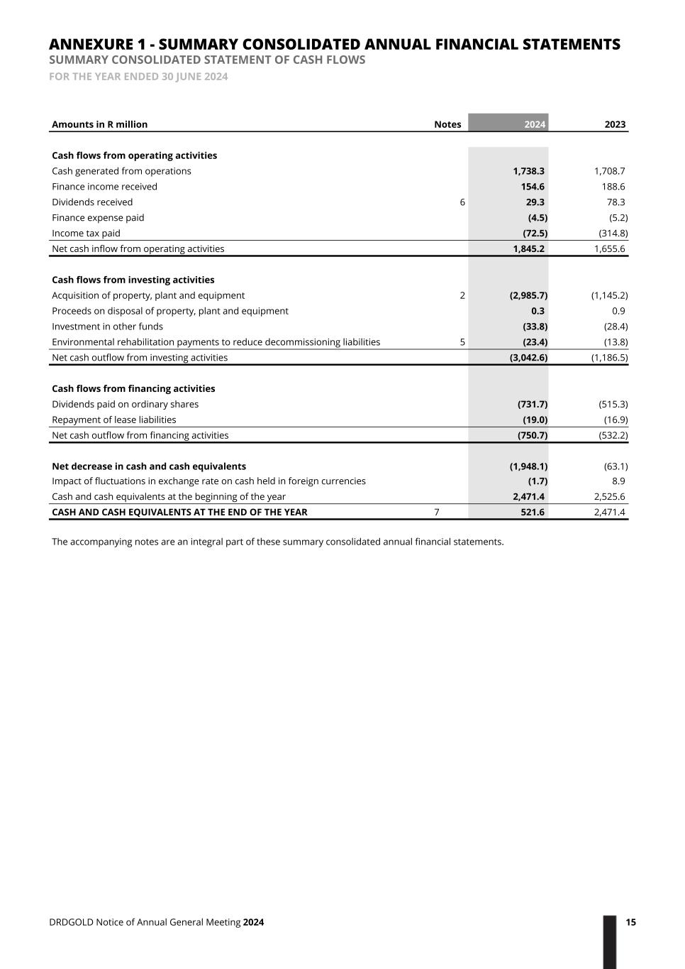 Amounts in R million Notes 2024 2023 Cash flows from operating activities Cash generated from operations 1,738.3 1,708.7 Finance income received 154.6 188.6 Dividends received 6 29.3 78.3 Finance expense paid (4.5) (5.2) Income tax paid (72.5) (314.8) Net cash inflow from operating activities 1,845.2 1,655.6 Cash flows from investing activities Acquisition of property, plant and equipment 2 (2,985.7) (1,145.2) Proceeds on disposal of property, plant and equipment 0.3 0.9 Investment in other funds (33.8) (28.4) Environmental rehabilitation payments to reduce decommissioning liabilities 5 (23.4) (13.8) Net cash outflow from investing activities (3,042.6) (1,186.5) Cash flows from financing activities Dividends paid on ordinary shares (731.7) (515.3) Repayment of lease liabilities (19.0) (16.9) Net cash outflow from financing activities (750.7) (532.2) Net decrease in cash and cash equivalents (1,948.1) (63.1) Impact of fluctuations in exchange rate on cash held in foreign currencies (1.7) 8.9 Cash and cash equivalents at the beginning of the year 2,471.4 2,525.6 CASH AND CASH EQUIVALENTS AT THE END OF THE YEAR 7 521.6 2,471.4 The accompanying notes are an integral part of these summary consolidated annual financial statements. ANNEXURE 1 - SUMMARY CONSOLIDATED ANNUAL FINANCIAL STATEMENTS SUMMARY CONSOLIDATED STATEMENT OF CASH FLOWS FOR THE YEAR ENDED 30 JUNE 2024 DRDGOLD Notice of Annual General Meeting 2024 15