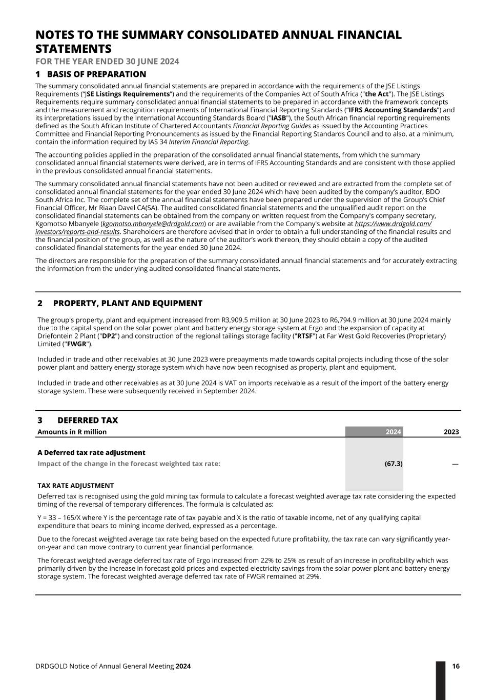 1 BASIS OF PREPARATION The summary consolidated annual financial statements are prepared in accordance with the requirements of the JSE Listings Requirements (“JSE Listings Requirements”) and the requirements of the Companies Act of South Africa ("the Act"). The JSE Listings Requirements require summary consolidated annual financial statements to be prepared in accordance with the framework concepts and the measurement and recognition requirements of International Financial Reporting Standards (“IFRS Accounting Standards”) and its interpretations issued by the International Accounting Standards Board ("IASB"), the South African financial reporting requirements defined as the South African Institute of Chartered Accountants Financial Reporting Guides as issued by the Accounting Practices Committee and Financial Reporting Pronouncements as issued by the Financial Reporting Standards Council and to also, at a minimum, contain the information required by IAS 34 Interim Financial Reporting. The accounting policies applied in the preparation of the consolidated annual financial statements, from which the summary consolidated annual financial statements were derived, are in terms of IFRS Accounting Standards and are consistent with those applied in the previous consolidated annual financial statements. The summary consolidated annual financial statements have not been audited or reviewed and are extracted from the complete set of consolidated annual financial statements for the year ended 30 June 2024 which have been audited by the company’s auditor, BDO South Africa Inc. The complete set of the annual financial statements have been prepared under the supervision of the Group’s Chief Financial Officer, Mr Riaan Davel CA(SA). The audited consolidated financial statements and the unqualified audit report on the consolidated financial statements can be obtained from the company on written request from the Company's company secretary, Kgomotso Mbanyele (kgomotso.mbanyele@drdgold.com) or are available from the Company's website at https://www.drdgold.com/ investors/reports-and-results. Shareholders are therefore advised that in order to obtain a full understanding of the financial results and the financial position of the group, as well as the nature of the auditor’s work thereon, they should obtain a copy of the audited consolidated financial statements for the year ended 30 June 2024. The directors are responsible for the preparation of the summary consolidated annual financial statements and for accurately extracting the information from the underlying audited consolidated financial statements. 2 PROPERTY, PLANT AND EQUIPMENT The group's property, plant and equipment increased from R3,909.5 million at 30 June 2023 to R6,794.9 million at 30 June 2024 mainly due to the capital spend on the solar power plant and battery energy storage system at Ergo and the expansion of capacity at Driefontein 2 Plant ("DP2") and construction of the regional tailings storage facility ("RTSF") at Far West Gold Recoveries (Proprietary) Limited ("FWGR"). Included in trade and other receivables at 30 June 2023 were prepayments made towards capital projects including those of the solar power plant and battery energy storage system which have now been recognised as property, plant and equipment. Included in trade and other receivables as at 30 June 2024 is VAT on imports receivable as a result of the import of the battery energy storage system. These were subsequently received in September 2024. 3 DEFERRED TAX Amounts in R million 2024 2023 A Deferred tax rate adjustment Impact of the change in the forecast weighted tax rate: (67.3) — TAX RATE ADJUSTMENT Deferred tax is recognised using the gold mining tax formula to calculate a forecast weighted average tax rate considering the expected timing of the reversal of temporary differences. The formula is calculated as: Y = 33 – 165/X where Y is the percentage rate of tax payable and X is the ratio of taxable income, net of any qualifying capital expenditure that bears to mining income derived, expressed as a percentage. Due to the forecast weighted average tax rate being based on the expected future profitability, the tax rate can vary significantly year- on-year and can move contrary to current year financial performance. The forecast weighted average deferred tax rate of Ergo increased from 22% to 25% as result of an increase in profitability which was primarily driven by the increase in forecast gold prices and expected electricity savings from the solar power plant and battery energy storage system. The forecast weighted average deferred tax rate of FWGR remained at 29%. NOTES TO THE SUMMARY CONSOLIDATED ANNUAL FINANCIAL STATEMENTS FOR THE YEAR ENDED 30 JUNE 2024 DRDGOLD Notice of Annual General Meeting 2024 16