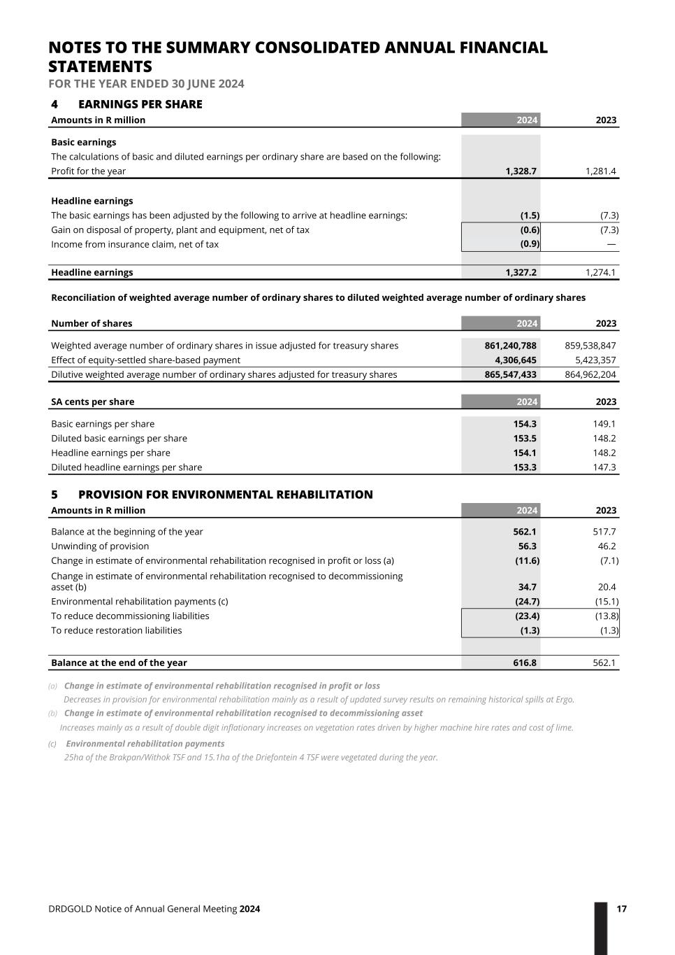4 EARNINGS PER SHARE Amounts in R million 2024 2023 Basic earnings The calculations of basic and diluted earnings per ordinary share are based on the following: Profit for the year 1,328.7 1,281.4 Headline earnings The basic earnings has been adjusted by the following to arrive at headline earnings: (1.5) (7.3) Gain on disposal of property, plant and equipment, net of tax (0.6) (7.3) Income from insurance claim, net of tax (0.9) — Headline earnings 1,327.2 1,274.1 Reconciliation of weighted average number of ordinary shares to diluted weighted average number of ordinary shares Number of shares 2024 2023 Weighted average number of ordinary shares in issue adjusted for treasury shares 861,240,788 859,538,847 Effect of equity-settled share-based payment 4,306,645 5,423,357 Dilutive weighted average number of ordinary shares adjusted for treasury shares 865,547,433 864,962,204 SA cents per share 2024 2023 Basic earnings per share 154.3 149.1 Diluted basic earnings per share 153.5 148.2 Headline earnings per share 154.1 148.2 Diluted headline earnings per share 153.3 147.3 5 PROVISION FOR ENVIRONMENTAL REHABILITATION Amounts in R million 2024 2023 Balance at the beginning of the year 562.1 517.7 Unwinding of provision 56.3 46.2 Change in estimate of environmental rehabilitation recognised in profit or loss (a) (11.6) (7.1) Change in estimate of environmental rehabilitation recognised to decommissioning asset (b) 34.7 20.4 Environmental rehabilitation payments (c) (24.7) (15.1) To reduce decommissioning liabilities (23.4) (13.8) To reduce restoration liabilities (1.3) (1.3) Balance at the end of the year 616.8 562.1 (a) Change in estimate of environmental rehabilitation recognised in profit or loss Decreases in provision for environmental rehabilitation mainly as a result of updated survey results on remaining historical spills at Ergo. (b) Change in estimate of environmental rehabilitation recognised to decommissioning asset Increases mainly as a result of double digit inflationary increases on vegetation rates driven by higher machine hire rates and cost of lime. (c) Environmental rehabilitation payments 25ha of the Brakpan/Withok TSF and 15.1ha of the Driefontein 4 TSF were vegetated during the year. NOTES TO THE SUMMARY CONSOLIDATED ANNUAL FINANCIAL STATEMENTS FOR THE YEAR ENDED 30 JUNE 2024 DRDGOLD Notice of Annual General Meeting 2024 17