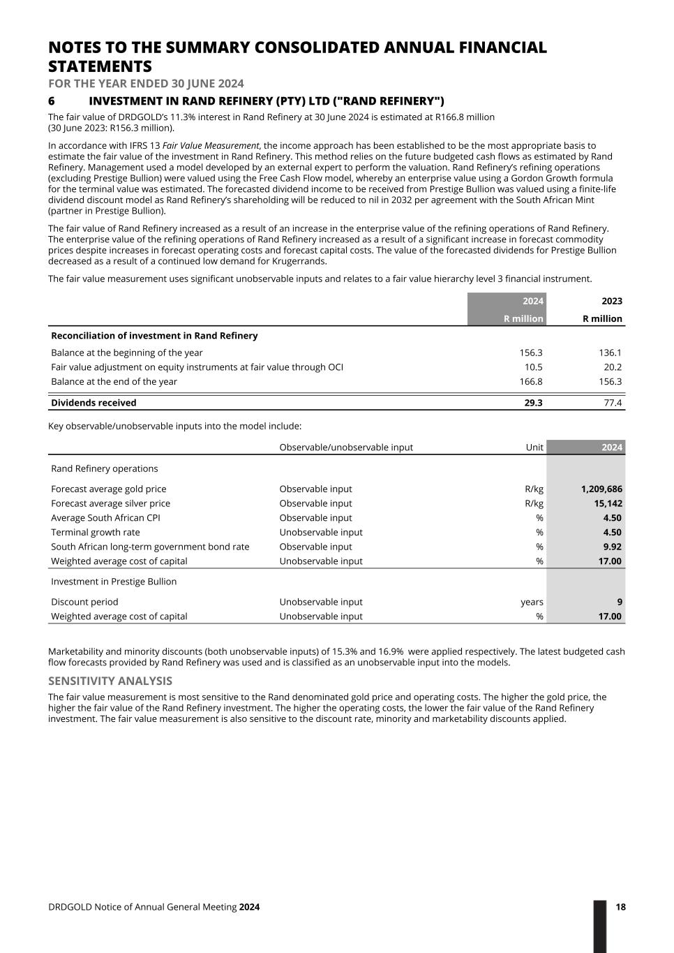 6 INVESTMENT IN RAND REFINERY (PTY) LTD ("RAND REFINERY") The fair value of DRDGOLD’s 11.3% interest in Rand Refinery at 30 June 2024 is estimated at R166.8 million (30 June 2023: R156.3 million). In accordance with IFRS 13 Fair Value Measurement, the income approach has been established to be the most appropriate basis to estimate the fair value of the investment in Rand Refinery. This method relies on the future budgeted cash flows as estimated by Rand Refinery. Management used a model developed by an external expert to perform the valuation. Rand Refinery’s refining operations (excluding Prestige Bullion) were valued using the Free Cash Flow model, whereby an enterprise value using a Gordon Growth formula for the terminal value was estimated. The forecasted dividend income to be received from Prestige Bullion was valued using a finite-life dividend discount model as Rand Refinery’s shareholding will be reduced to nil in 2032 per agreement with the South African Mint (partner in Prestige Bullion). The fair value of Rand Refinery increased as a result of an increase in the enterprise value of the refining operations of Rand Refinery. The enterprise value of the refining operations of Rand Refinery increased as a result of a significant increase in forecast commodity prices despite increases in forecast operating costs and forecast capital costs. The value of the forecasted dividends for Prestige Bullion decreased as a result of a continued low demand for Krugerrands. The fair value measurement uses significant unobservable inputs and relates to a fair value hierarchy level 3 financial instrument. 2024 R million 2023 R million Reconciliation of investment in Rand Refinery Balance at the beginning of the year 156.3 136.1 Fair value adjustment on equity instruments at fair value through OCI 10.5 20.2 Balance at the end of the year 166.8 156.3 Dividends received 29.3 77.4 Key observable/unobservable inputs into the model include: Observable/unobservable input Unit 2024 Rand Refinery operations Forecast average gold price Observable input R/kg 1,209,686 Forecast average silver price Observable input R/kg 15,142 Average South African CPI Observable input % 4.50 Terminal growth rate Unobservable input % 4.50 South African long-term government bond rate Observable input % 9.92 Weighted average cost of capital Unobservable input % 17.00 Investment in Prestige Bullion Discount period Unobservable input years 9 Weighted average cost of capital Unobservable input % 17.00 Marketability and minority discounts (both unobservable inputs) of 15.3% and 16.9% were applied respectively. The latest budgeted cash flow forecasts provided by Rand Refinery was used and is classified as an unobservable input into the models. SENSITIVITY ANALYSIS The fair value measurement is most sensitive to the Rand denominated gold price and operating costs. The higher the gold price, the higher the fair value of the Rand Refinery investment. The higher the operating costs, the lower the fair value of the Rand Refinery investment. The fair value measurement is also sensitive to the discount rate, minority and marketability discounts applied. NOTES TO THE SUMMARY CONSOLIDATED ANNUAL FINANCIAL STATEMENTS FOR THE YEAR ENDED 30 JUNE 2024 DRDGOLD Notice of Annual General Meeting 2024 18