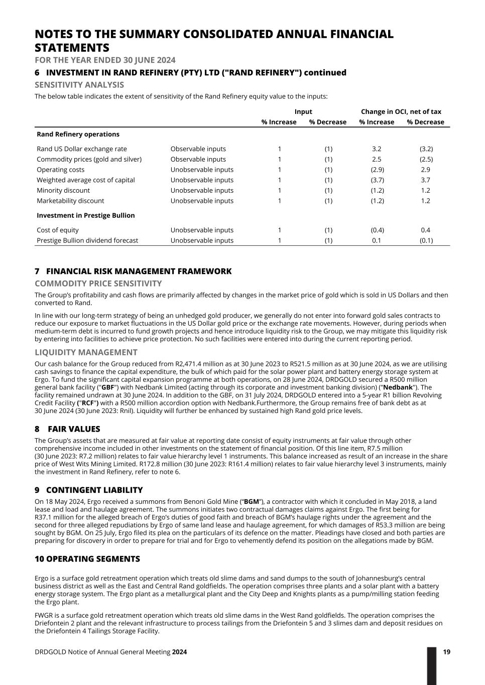 6 INVESTMENT IN RAND REFINERY (PTY) LTD ("RAND REFINERY") continued SENSITIVITY ANALYSIS The below table indicates the extent of sensitivity of the Rand Refinery equity value to the inputs: Input Change in OCI, net of tax % Increase % Decrease % Increase % Decrease Rand Refinery operations Rand US Dollar exchange rate Observable inputs 1 (1) 3.2 (3.2) Commodity prices (gold and silver) Observable inputs 1 (1) 2.5 (2.5) Operating costs Unobservable inputs 1 (1) (2.9) 2.9 Weighted average cost of capital Unobservable inputs 1 (1) (3.7) 3.7 Minority discount Unobservable inputs 1 (1) (1.2) 1.2 Marketability discount Unobservable inputs 1 (1) (1.2) 1.2 Investment in Prestige Bullion Cost of equity Unobservable inputs 1 (1) (0.4) 0.4 Prestige Bullion dividend forecast Unobservable inputs 1 (1) 0.1 (0.1) 7 FINANCIAL RISK MANAGEMENT FRAMEWORK COMMODITY PRICE SENSITIVITY The Group’s profitability and cash flows are primarily affected by changes in the market price of gold which is sold in US Dollars and then converted to Rand. In line with our long-term strategy of being an unhedged gold producer, we generally do not enter into forward gold sales contracts to reduce our exposure to market fluctuations in the US Dollar gold price or the exchange rate movements. However, during periods when medium-term debt is incurred to fund growth projects and hence introduce liquidity risk to the Group, we may mitigate this liquidity risk by entering into facilities to achieve price protection. No such facilities were entered into during the current reporting period. LIQUIDITY MANAGEMENT Our cash balance for the Group reduced from R2,471.4 million as at 30 June 2023 to R521.5 million as at 30 June 2024, as we are utilising cash savings to finance the capital expenditure, the bulk of which paid for the solar power plant and battery energy storage system at Ergo. To fund the significant capital expansion programme at both operations, on 28 June 2024, DRDGOLD secured a R500 million general bank facility ("GBF") with Nedbank Limited (acting through its corporate and investment banking division) ("Nedbank"). The facility remained undrawn at 30 June 2024. In addition to the GBF, on 31 July 2024, DRDGOLD entered into a 5-year R1 billion Revolving Credit Facility ("RCF") with a R500 million accordion option with Nedbank.Furthermore, the Group remains free of bank debt as at 30 June 2024 (30 June 2023: Rnil). Liquidity will further be enhanced by sustained high Rand gold price levels. 8 FAIR VALUES The Group’s assets that are measured at fair value at reporting date consist of equity instruments at fair value through other comprehensive income included in other investments on the statement of financial position. Of this line item, R7.5 million (30 June 2023: R7.2 million) relates to fair value hierarchy level 1 instruments. This balance increased as result of an increase in the share price of West Wits Mining Limited. R172.8 million (30 June 2023: R161.4 million) relates to fair value hierarchy level 3 instruments, mainly the investment in Rand Refinery, refer to note 6. 9 CONTINGENT LIABILITY On 18 May 2024, Ergo received a summons from Benoni Gold Mine (“BGM”), a contractor with which it concluded in May 2018, a land lease and load and haulage agreement. The summons initiates two contractual damages claims against Ergo. The first being for R37.1 million for the alleged breach of Ergo’s duties of good faith and breach of BGM’s haulage rights under the agreement and the second for three alleged repudiations by Ergo of same land lease and haulage agreement, for which damages of R53.3 million are being sought by BGM. On 25 July, Ergo filed its plea on the particulars of its defence on the matter. Pleadings have closed and both parties are preparing for discovery in order to prepare for trial and for Ergo to vehemently defend its position on the allegations made by BGM. 10 OPERATING SEGMENTS Ergo is a surface gold retreatment operation which treats old slime dams and sand dumps to the south of Johannesburg’s central business district as well as the East and Central Rand goldfields. The operation comprises three plants and a solar plant with a battery energy storage system. The Ergo plant as a metallurgical plant and the City Deep and Knights plants as a pump/milling station feeding the Ergo plant. FWGR is a surface gold retreatment operation which treats old slime dams in the West Rand goldfields. The operation comprises the Driefontein 2 plant and the relevant infrastructure to process tailings from the Driefontein 5 and 3 slimes dam and deposit residues on the Driefontein 4 Tailings Storage Facility. NOTES TO THE SUMMARY CONSOLIDATED ANNUAL FINANCIAL STATEMENTS FOR THE YEAR ENDED 30 JUNE 2024 DRDGOLD Notice of Annual General Meeting 2024 19