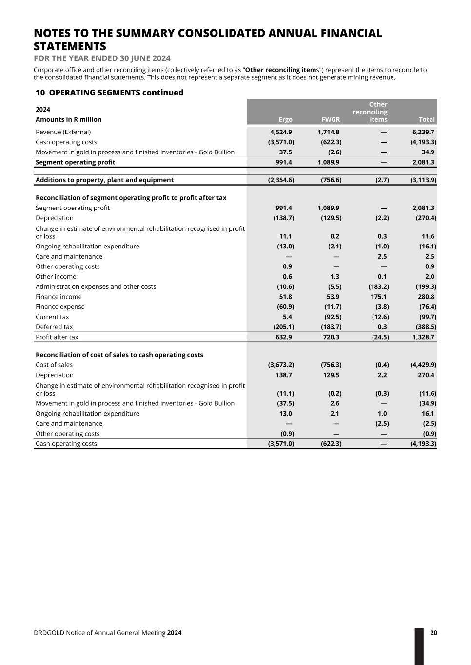Corporate office and other reconciling items (collectively referred to as "Other reconciling items") represent the items to reconcile to the consolidated financial statements. This does not represent a separate segment as it does not generate mining revenue. 10 OPERATING SEGMENTS continued Ergo FWGR Other reconciling items Total 2024 Amounts in R million Revenue (External) 4,524.9 1,714.8 — 6,239.7 Cash operating costs (3,571.0) (622.3) — (4,193.3) Movement in gold in process and finished inventories - Gold Bullion 37.5 (2.6) — 34.9 Segment operating profit 991.4 1,089.9 — 2,081.3 Additions to property, plant and equipment (2,354.6) (756.6) (2.7) (3,113.9) Reconciliation of segment operating profit to profit after tax Segment operating profit 991.4 1,089.9 — 2,081.3 Depreciation (138.7) (129.5) (2.2) (270.4) Change in estimate of environmental rehabilitation recognised in profit or loss 11.1 0.2 0.3 11.6 Ongoing rehabilitation expenditure (13.0) (2.1) (1.0) (16.1) Care and maintenance — — 2.5 2.5 Other operating costs 0.9 — — 0.9 Other income 0.6 1.3 0.1 2.0 Administration expenses and other costs (10.6) (5.5) (183.2) (199.3) Finance income 51.8 53.9 175.1 280.8 Finance expense (60.9) (11.7) (3.8) (76.4) Current tax 5.4 (92.5) (12.6) (99.7) Deferred tax (205.1) (183.7) 0.3 (388.5) Profit after tax 632.9 720.3 (24.5) 1,328.7 Reconciliation of cost of sales to cash operating costs Cost of sales (3,673.2) (756.3) (0.4) (4,429.9) Depreciation 138.7 129.5 2.2 270.4 Change in estimate of environmental rehabilitation recognised in profit or loss (11.1) (0.2) (0.3) (11.6) Movement in gold in process and finished inventories - Gold Bullion (37.5) 2.6 — (34.9) Ongoing rehabilitation expenditure 13.0 2.1 1.0 16.1 Care and maintenance — — (2.5) (2.5) Other operating costs (0.9) — — (0.9) Cash operating costs (3,571.0) (622.3) — (4,193.3) NOTES TO THE SUMMARY CONSOLIDATED ANNUAL FINANCIAL STATEMENTS FOR THE YEAR ENDED 30 JUNE 2024 DRDGOLD Notice of Annual General Meeting 2024 20