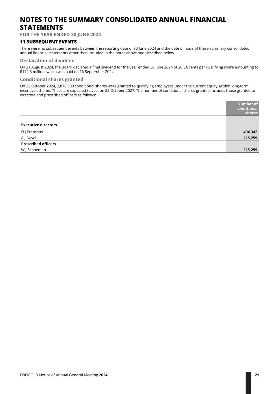 11 SUBSEQUENT EVENTS There were no subsequent events between the reporting date of 30 June 2024 and the date of issue of these summary consolidated annual financial statements other than included in the notes above and described below. Declaration of dividend On 21 August 2024, the Board declared a final dividend for the year ended 30 June 2024 of 20 SA cents per qualifying share amounting to R172.3 million, which was paid on 16 September 2024. Conditional shares granted On 22 October 2024, 2,878,900 conditional shares were granted to qualifying employees under the current equity settled long-term incentive scheme. These are expected to vest on 22 October 2027. The number of conditional shares granted includes those granted to directors and prescribed officers as follows: Number of conditional shares Executive directors D J Pretorius 404,342 A J Davel 215,259 Prescribed officers W J Schoeman 215,259 NOTES TO THE SUMMARY CONSOLIDATED ANNUAL FINANCIAL STATEMENTS FOR THE YEAR ENDED 30 JUNE 2024 DRDGOLD Notice of Annual General Meeting 2024 21