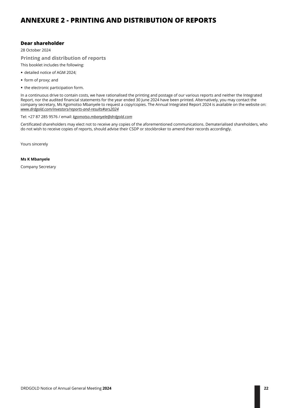 Dear shareholder 28 October 2024 Printing and distribution of reports This booklet includes the following: • detailed notice of AGM 2024; • form of proxy; and • the electronic participation form. In a continuous drive to contain costs, we have rationalised the printing and postage of our various reports and neither the Integrated Report, nor the audited financial statements for the year ended 30 June 2024 have been printed. Alternatively, you may contact the company secretary, Ms Kgomotso Mbanyele to request a copy/copies. The Annual Integrated Report 2024 is available on the website on: www.drdgold.com/investors/reports-and-results#ars2024 Tel: +27 87 285 9576 / email: kgomotso.mbanyele@drdgold.com Certificated shareholders may elect not to receive any copies of the aforementioned communications. Dematerialised shareholders, who do not wish to receive copies of reports, should advise their CSDP or stockbroker to amend their records accordingly. Yours sincerely Ms K Mbanyele Company Secretary ANNEXURE 2 - PRINTING AND DISTRIBUTION OF REPORTS DRDGOLD Notice of Annual General Meeting 2024 22