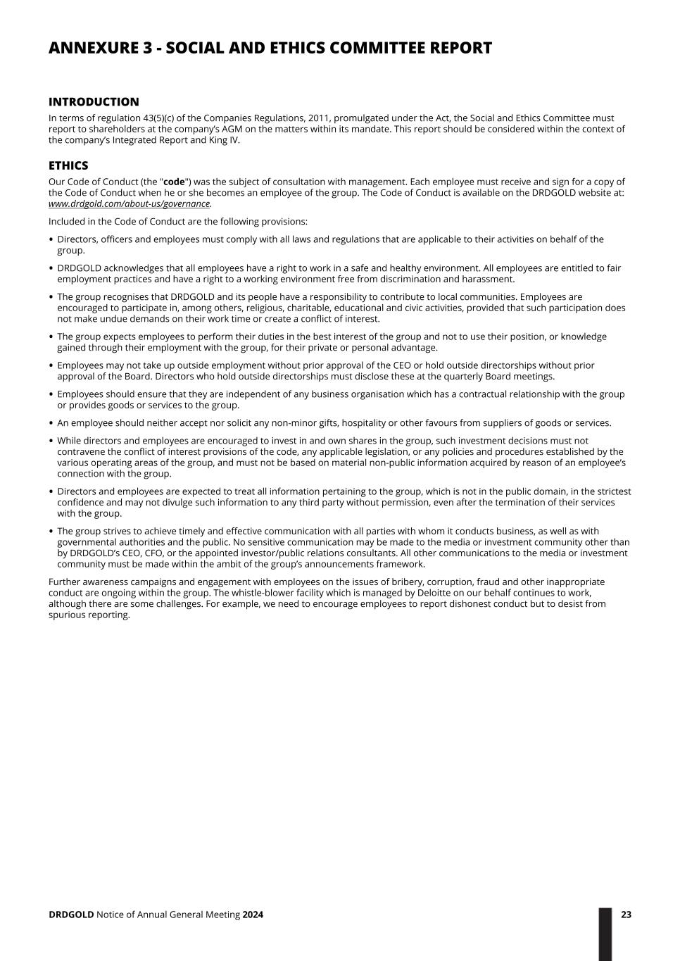 INTRODUCTION In terms of regulation 43(5)(c) of the Companies Regulations, 2011, promulgated under the Act, the Social and Ethics Committee must report to shareholders at the company’s AGM on the matters within its mandate. This report should be considered within the context of the company’s Integrated Report and King IV. ETHICS Our Code of Conduct (the "code") was the subject of consultation with management. Each employee must receive and sign for a copy of the Code of Conduct when he or she becomes an employee of the group. The Code of Conduct is available on the DRDGOLD website at: www.drdgold.com/about-us/governance. Included in the Code of Conduct are the following provisions: • Directors, officers and employees must comply with all laws and regulations that are applicable to their activities on behalf of the group. • DRDGOLD acknowledges that all employees have a right to work in a safe and healthy environment. All employees are entitled to fair employment practices and have a right to a working environment free from discrimination and harassment. • The group recognises that DRDGOLD and its people have a responsibility to contribute to local communities. Employees are encouraged to participate in, among others, religious, charitable, educational and civic activities, provided that such participation does not make undue demands on their work time or create a conflict of interest. • The group expects employees to perform their duties in the best interest of the group and not to use their position, or knowledge gained through their employment with the group, for their private or personal advantage. • Employees may not take up outside employment without prior approval of the CEO or hold outside directorships without prior approval of the Board. Directors who hold outside directorships must disclose these at the quarterly Board meetings. • Employees should ensure that they are independent of any business organisation which has a contractual relationship with the group or provides goods or services to the group. • An employee should neither accept nor solicit any non-minor gifts, hospitality or other favours from suppliers of goods or services. • While directors and employees are encouraged to invest in and own shares in the group, such investment decisions must not contravene the conflict of interest provisions of the code, any applicable legislation, or any policies and procedures established by the various operating areas of the group, and must not be based on material non-public information acquired by reason of an employee’s connection with the group. • Directors and employees are expected to treat all information pertaining to the group, which is not in the public domain, in the strictest confidence and may not divulge such information to any third party without permission, even after the termination of their services with the group. • The group strives to achieve timely and effective communication with all parties with whom it conducts business, as well as with governmental authorities and the public. No sensitive communication may be made to the media or investment community other than by DRDGOLD’s CEO, CFO, or the appointed investor/public relations consultants. All other communications to the media or investment community must be made within the ambit of the group’s announcements framework. Further awareness campaigns and engagement with employees on the issues of bribery, corruption, fraud and other inappropriate conduct are ongoing within the group. The whistle-blower facility which is managed by Deloitte on our behalf continues to work, although there are some challenges. For example, we need to encourage employees to report dishonest conduct but to desist from spurious reporting. ANNEXURE 3 - SOCIAL AND ETHICS COMMITTEE REPORT DRDGOLD Notice of Annual General Meeting 2024 23