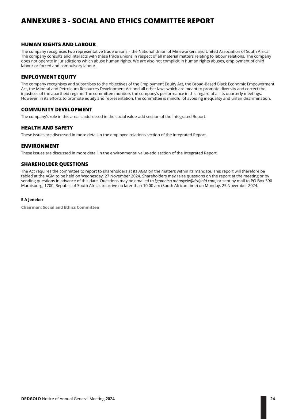 HUMAN RIGHTS AND LABOUR The company recognises two representative trade unions – the National Union of Mineworkers and United Association of South Africa. The company consults and interacts with these trade unions in respect of all material matters relating to labour relations. The company does not operate in jurisdictions which abuse human rights. We are also not complicit in human rights abuses, employment of child labour or forced and compulsory labour. EMPLOYMENT EQUITY The company recognises and subscribes to the objectives of the Employment Equity Act, the Broad-Based Black Economic Empowerment Act, the Mineral and Petroleum Resources Development Act and all other laws which are meant to promote diversity and correct the injustices of the apartheid regime. The committee monitors the company’s performance in this regard at all its quarterly meetings. However, in its efforts to promote equity and representation, the committee is mindful of avoiding inequality and unfair discrimination. COMMUNITY DEVELOPMENT The company’s role in this area is addressed in the social value-add section of the Integrated Report. HEALTH AND SAFETY These issues are discussed in more detail in the employee relations section of the Integrated Report. ENVIRONMENT These issues are discussed in more detail in the environmental value-add section of the Integrated Report. SHAREHOLDER QUESTIONS The Act requires the committee to report to shareholders at its AGM on the matters within its mandate. This report will therefore be tabled at the AGM to be held on Wednesday, 27 November 2024. Shareholders may raise questions on the report at the meeting or by sending questions in advance of this date. Questions may be emailed to kgomotso.mbanyele@drdgold.com, or sent by mail to PO Box 390 Maraisburg, 1700, Republic of South Africa, to arrive no later than 10:00 am (South African time) on Monday, 25 November 2024. E A Jeneker Chairman: Social and Ethics Committee ANNEXURE 3 - SOCIAL AND ETHICS COMMITTEE REPORT DRDGOLD Notice of Annual General Meeting 2024 24