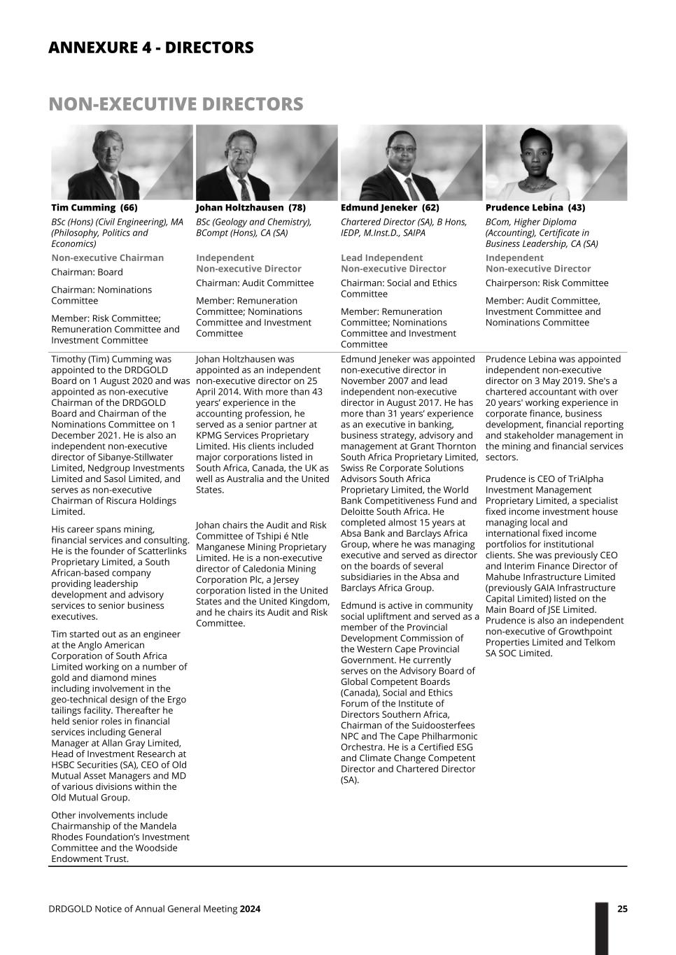 NON-EXECUTIVE DIRECTORS Tim Cumming (66) BSc (Hons) (Civil Engineering), MA (Philosophy, Politics and Economics) Johan Holtzhausen (78) BSc (Geology and Chemistry), BCompt (Hons), CA (SA) Edmund Jeneker (62) Chartered Director (SA), B Hons, IEDP, M.Inst.D., SAIPA Prudence Lebina (43) BCom, Higher Diploma (Accounting), Certificate in Business Leadership, CA (SA) Non-executive Chairman Chairman: Board Chairman: Nominations Committee Member: Risk Committee; Remuneration Committee and Investment Committee Independent Non-executive Director Chairman: Audit Committee Member: Remuneration Committee; Nominations Committee and Investment Committee Lead Independent Non-executive Director Chairman: Social and Ethics Committee Member: Remuneration Committee; Nominations Committee and Investment Committee Independent Non-executive Director Chairperson: Risk Committee Member: Audit Committee, Investment Committee and Nominations Committee Timothy (Tim) Cumming was appointed to the DRDGOLD Board on 1 August 2020 and was appointed as non-executive Chairman of the DRDGOLD Board and Chairman of the Nominations Committee on 1 December 2021. He is also an independent non-executive director of Sibanye-Stillwater Limited, Nedgroup Investments Limited and Sasol Limited, and serves as non-executive Chairman of Riscura Holdings Limited. His career spans mining, financial services and consulting. He is the founder of Scatterlinks Proprietary Limited, a South African-based company providing leadership development and advisory services to senior business executives. Tim started out as an engineer at the Anglo American Corporation of South Africa Limited working on a number of gold and diamond mines including involvement in the geo-technical design of the Ergo tailings facility. Thereafter he held senior roles in financial services including General Manager at Allan Gray Limited, Head of Investment Research at HSBC Securities (SA), CEO of Old Mutual Asset Managers and MD of various divisions within the Old Mutual Group. Other involvements include Chairmanship of the Mandela Rhodes Foundation’s Investment Committee and the Woodside Endowment Trust. Johan Holtzhausen was appointed as an independent non-executive director on 25 April 2014. With more than 43 years’ experience in the accounting profession, he served as a senior partner at KPMG Services Proprietary Limited. His clients included major corporations listed in South Africa, Canada, the UK as well as Australia and the United States. Johan chairs the Audit and Risk Committee of Tshipi é Ntle Manganese Mining Proprietary Limited. He is a non-executive director of Caledonia Mining Corporation Plc, a Jersey corporation listed in the United States and the United Kingdom, and he chairs its Audit and Risk Committee. Edmund Jeneker was appointed non-executive director in November 2007 and lead independent non-executive director in August 2017. He has more than 31 years’ experience as an executive in banking, business strategy, advisory and management at Grant Thornton South Africa Proprietary Limited, Swiss Re Corporate Solutions Advisors South Africa Proprietary Limited, the World Bank Competitiveness Fund and Deloitte South Africa. He completed almost 15 years at Absa Bank and Barclays Africa Group, where he was managing executive and served as director on the boards of several subsidiaries in the Absa and Barclays Africa Group. Edmund is active in community social upliftment and served as a member of the Provincial Development Commission of the Western Cape Provincial Government. He currently serves on the Advisory Board of Global Competent Boards (Canada), Social and Ethics Forum of the Institute of Directors Southern Africa, Chairman of the Suidoosterfees NPC and The Cape Philharmonic Orchestra. He is a Certified ESG and Climate Change Competent Director and Chartered Director (SA). Prudence Lebina was appointed independent non-executive director on 3 May 2019. She's a chartered accountant with over 20 years' working experience in corporate finance, business development, financial reporting and stakeholder management in the mining and financial services sectors. Prudence is CEO of TriAlpha Investment Management Proprietary Limited, a specialist fixed income investment house managing local and international fixed income portfolios for institutional clients. She was previously CEO and Interim Finance Director of Mahube Infrastructure Limited (previously GAIA Infrastructure Capital Limited) listed on the Main Board of JSE Limited. Prudence is also an independent non-executive of Growthpoint Properties Limited and Telkom SA SOC Limited. ANNEXURE 4 - DIRECTORS DRDGOLD Notice of Annual General Meeting 2024 25