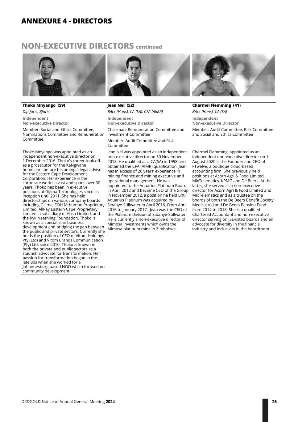 NON-EXECUTIVE DIRECTORS continued Thoko Mnyango (59) Dip Juris, BJuris Jean Nel (52) BAcc (Hons), CA (SA), CFA (AIMR) Charmel Flemming (41) BAcc (Hons), CA (SA) Independent Non-executive Director Member: Social and Ethics Committee; Nominations Committee and Remuneration Committee. Independent Non-executive Director Chairman: Remuneration Committee and Investment Committee Member: Audit Committee and Risk Committee Independent Non-executive Director Member: Audit Committee; Risk Committee and Social and Ethics Committee Thoko Mnyango was appointed as an independent non-executive director on 1 December 2016. Thoko’s career took off as a prosecutor for the KaNgwane homeland, before becoming a legal advisor for the Eastern Cape Development Corporation. Her experience in the corporate world is vast and spans over 30 years. Thoko has been in executive positions at Gijima Technologies since its inception until 2011. She has held directorships on various company boards including Gijima, EOH Mthombo Proprietary Limited, AllPay Eastern Cape Proprietary Limited, a subsidiary of Absa Limited, and the Ryk Neethling Foundation. Thoko is known as a specialist in business development and bridging the gap between the public and private sectors. Currently she holds the position of CEO of Vitom Holdings Pty (Ltd) and Vitom Brands Communication (Pty) Ltd, since 2010. Thoko is known in both the private and public sectors as a staunch advocate for transformation. Her passion for transformation began in the late 80s when she worked for a Johannesburg based NGO which focused on community development. Jean Nel was appointed as an independent non-executive director on 30 November 2018. He qualified as a CA(SA) in 1998 and obtained the CFA (AIMR) qualification. Jean has in excess of 20 years’ experience in mining finance and mining executive and operational management. He was appointed to the Aquarius Platinum Board in April 2012 and became CEO of the Group in November 2012, a position he held until Aquarius Platinum was acquired by Sibanye-Stillwater in April 2016. From April 2016 to January 2017, Jean was the CEO of the Platinum division of Sibanye-Stillwater. He is currently a non-executive director of Mimosa Investments which owns the Mimosa platinum mine in Zimbabwe. Charmel Flemming, appointed as an independent non-executive director on 1 August 2020 is the Founder and CEO of FTwelve, a boutique cloud-based accounting firm. She previously held positions at Acorn Agri & Food Limited, MixTelematics, KPMG and De Beers. At the latter, she served as a non-executive director for Acorn Agri & Food Limited and MixTelematics and as a trustee on the boards of both the De Beers Benefit Society Medical Aid and De Beers Pension Fund from 2014 to 2018. She is a qualified Chartered Accountant and non-executive director serving on JSE-listed boards and an advocate for diversity in the financial industry and inclusivity in the boardroom. ANNEXURE 4 - DIRECTORS DRDGOLD Notice of Annual General Meeting 2024 26