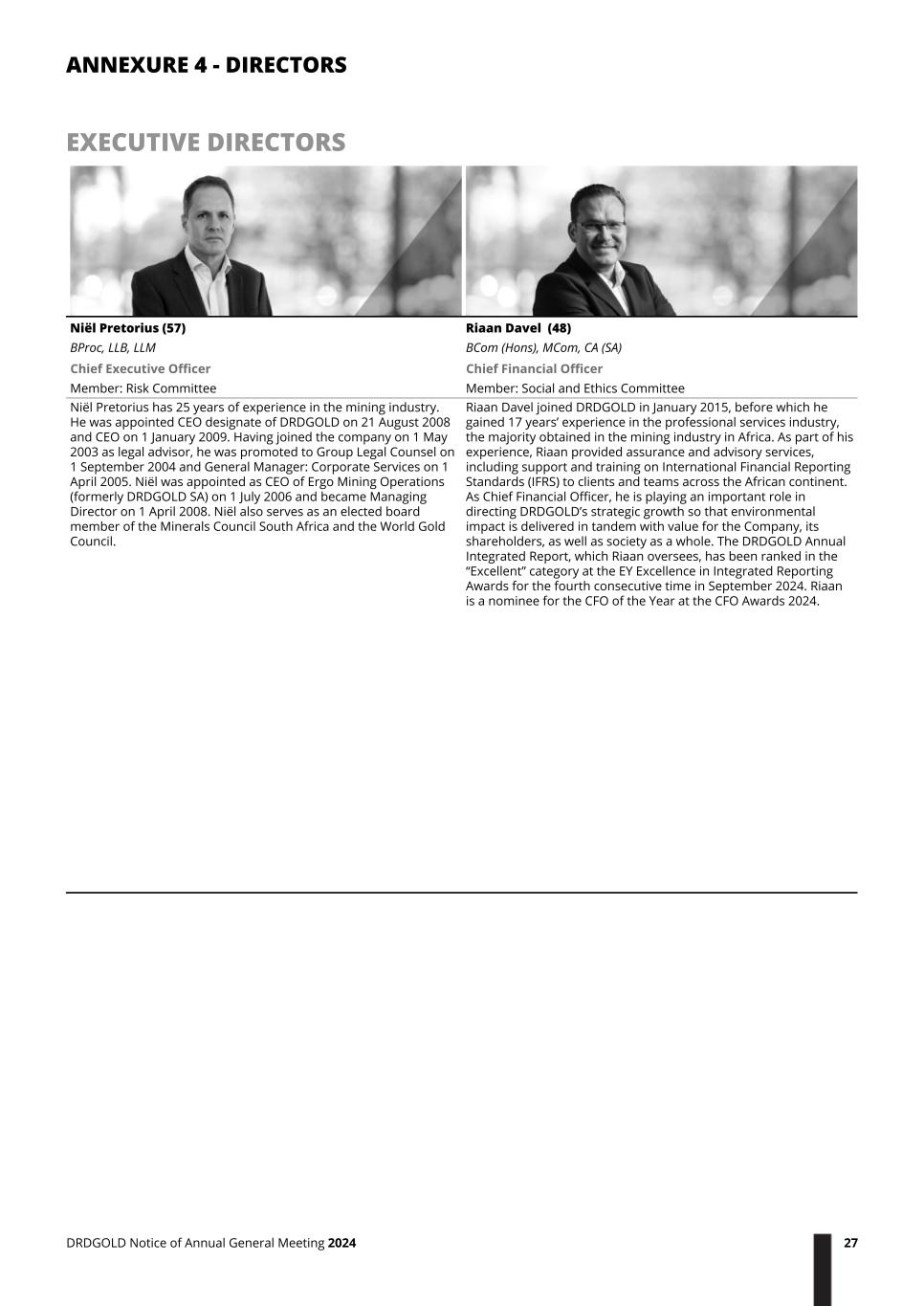 EXECUTIVE DIRECTORS Niël Pretorius (57) BProc, LLB, LLM Riaan Davel (48) BCom (Hons), MCom, CA (SA) Chief Executive Officer Member: Risk Committee Chief Financial Officer Member: Social and Ethics Committee Niël Pretorius has 25 years of experience in the mining industry. He was appointed CEO designate of DRDGOLD on 21 August 2008 and CEO on 1 January 2009. Having joined the company on 1 May 2003 as legal advisor, he was promoted to Group Legal Counsel on 1 September 2004 and General Manager: Corporate Services on 1 April 2005. Niël was appointed as CEO of Ergo Mining Operations (formerly DRDGOLD SA) on 1 July 2006 and became Managing Director on 1 April 2008. Niël also serves as an elected board member of the Minerals Council South Africa and the World Gold Council. Riaan Davel joined DRDGOLD in January 2015, before which he gained 17 years’ experience in the professional services industry, the majority obtained in the mining industry in Africa. As part of his experience, Riaan provided assurance and advisory services, including support and training on International Financial Reporting Standards (IFRS) to clients and teams across the African continent. As Chief Financial Officer, he is playing an important role in directing DRDGOLD’s strategic growth so that environmental impact is delivered in tandem with value for the Company, its shareholders, as well as society as a whole. The DRDGOLD Annual Integrated Report, which Riaan oversees, has been ranked in the “Excellent” category at the EY Excellence in Integrated Reporting Awards for the fourth consecutive time in September 2024. Riaan is a nominee for the CFO of the Year at the CFO Awards 2024. ANNEXURE 4 - DIRECTORS DRDGOLD Notice of Annual General Meeting 2024 27