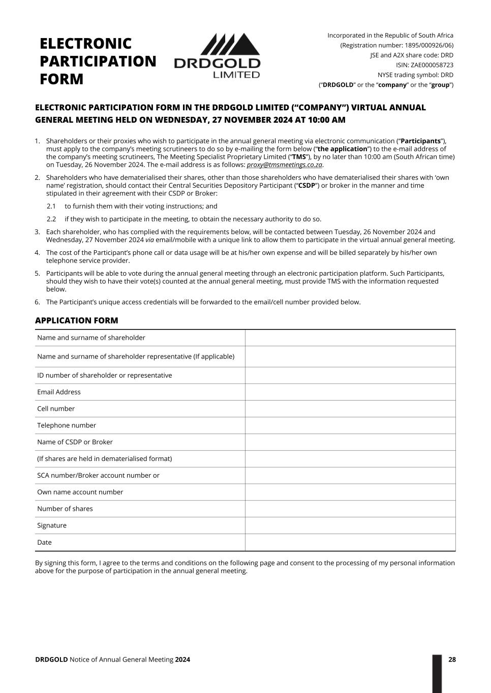 ELECTRONIC PARTICIPATION FORM IN THE DRDGOLD LIMITED (“COMPANY”) VIRTUAL ANNUAL GENERAL MEETING HELD ON WEDNESDAY, 27 NOVEMBER 2024 AT 10:00 AM 1. Shareholders or their proxies who wish to participate in the annual general meeting via electronic communication (“Participants”), must apply to the company’s meeting scrutineers to do so by e-mailing the form below (“the application”) to the e-mail address of the company’s meeting scrutineers, The Meeting Specialist Proprietary Limited (“TMS”), by no later than 10:00 am (South African time) on Tuesday, 26 November 2024. The e-mail address is as follows: proxy@tmsmeetings.co.za. 2. Shareholders who have dematerialised their shares, other than those shareholders who have dematerialised their shares with ‘own name’ registration, should contact their Central Securities Depository Participant (“CSDP”) or broker in the manner and time stipulated in their agreement with their CSDP or Broker: 2.1 to furnish them with their voting instructions; and 2.2 if they wish to participate in the meeting, to obtain the necessary authority to do so. 3. Each shareholder, who has complied with the requirements below, will be contacted between Tuesday, 26 November 2024 and Wednesday, 27 November 2024 via email/mobile with a unique link to allow them to participate in the virtual annual general meeting. 4. The cost of the Participant’s phone call or data usage will be at his/her own expense and will be billed separately by his/her own telephone service provider. 5. Participants will be able to vote during the annual general meeting through an electronic participation platform. Such Participants, should they wish to have their vote(s) counted at the annual general meeting, must provide TMS with the information requested below. 6. The Participant’s unique access credentials will be forwarded to the email/cell number provided below. APPLICATION FORM Name and surname of shareholder Name and surname of shareholder representative (If applicable) ID number of shareholder or representative Email Address Cell number Telephone number Name of CSDP or Broker (If shares are held in dematerialised format) SCA number/Broker account number or Own name account number Number of shares Signature Date By signing this form, I agree to the terms and conditions on the following page and consent to the processing of my personal information above for the purpose of participation in the annual general meeting. ELECTRONIC PARTICIPATION FORM Incorporated in the Republic of South Africa (Registration number: 1895/000926/06) JSE and A2X share code: DRD ISIN: ZAE000058723 NYSE trading symbol: DRD (“DRDGOLD” or the “company” or the “group”) DRDGOLD Notice of Annual General Meeting 2024 28