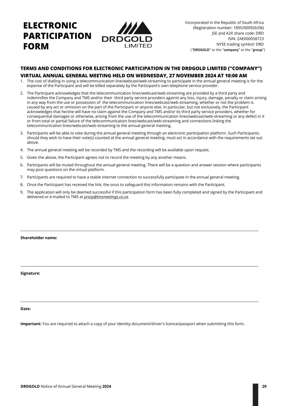 TERMS AND CONDITIONS FOR ELECTRONIC PARTICIPATION IN THE DRDGOLD LIMITED (“COMPANY”) VIRTUAL ANNUAL GENERAL MEETING HELD ON WEDNESDAY, 27 NOVEMBER 2024 AT 10:00 AM 1. The cost of dialling in using a telecommunication line/webcast/web-streaming to participate in the annual general meeting is for the expense of the Participant and will be billed separately by the Participant’s own telephone service provider. 2. The Participant acknowledges that the telecommunication lines/webcast/web-streaming are provided by a third party and indemnifies the Company and TMS and/or their third party service providers against any loss, injury, damage, penalty or claim arising in any way from the use or possession of the telecommunication lines/webcast/web-streaming, whether or not the problem is caused by any act or omission on the part of the Participant or anyone else. In particular, but not exclusively, the Participant acknowledges that he/she will have no claim against the Company and TMS and/or its third party service providers, whether for consequential damages or otherwise, arising from the use of the telecommunication lines/webcast/web-streaming or any defect in it or from total or partial failure of the telecommunication lines/webcast/web-streaming and connections linking the telecommunication lines/webcast/web-streaming to the annual general meeting. 3. Participants will be able to vote during the annual general meeting through an electronic participation platform. Such Participants, should they wish to have their vote(s) counted at the annual general meeting, must act in accordance with the requirements set out above. 4. The annual general meeting will be recorded by TMS and the recording will be available upon request. 5. Given the above, the Participant agrees not to record the meeting by any another means. 6. Participants will be muted throughout the annual general meeting. There will be a question and answer session where participants may post questions on the virtual platform. 7. Participants are required to have a stable internet connection to successfully participate in the annual general meeting. 8. Once the Participant has received the link, the onus to safeguard this information remains with the Participant. 9. The application will only be deemed successful if this participation form has been fully completed and signed by the Participant and delivered or e-mailed to TMS at proxy@tmsmeetings.co.za. Shareholder name: Signature: Date: Important: You are required to attach a copy of your identity document/driver's licence/passport when submitting this form. ELECTRONIC PARTICIPATION FORM Incorporated in the Republic of South Africa (Registration number: 1895/000926/06) JSE and A2X share code: DRD ISIN: ZAE000058723 NYSE trading symbol: DRD (“DRDGOLD” or the “company” or the “group”) DRDGOLD Notice of Annual General Meeting 2024 29