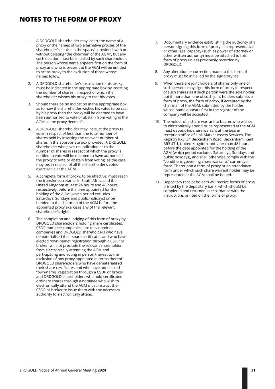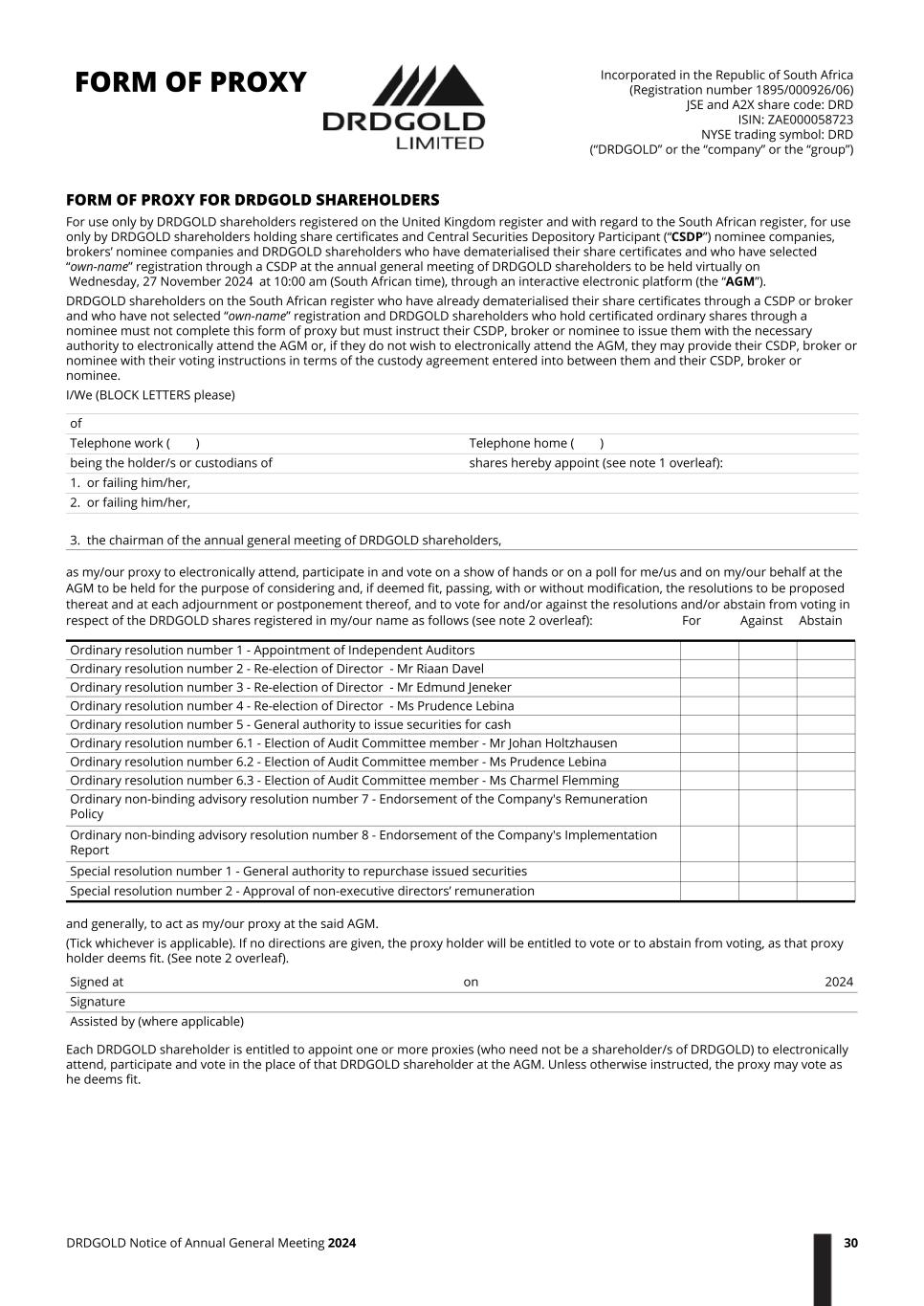 1. A DRDGOLD shareholder may insert the name of a proxy or the names of two alternative proxies of the shareholder’s choice in the space/s provided, with or without deleting “the chairman of the AGM”, but any such deletion must be initialled by such shareholder. The person whose name appears first on the form of proxy and who is present at the AGM will be entitled to act as proxy to the exclusion of those whose names follow. 2. A DRDGOLD shareholder’s instruction to his proxy must be indicated in the appropriate box by inserting the number of shares in respect of which the shareholder wishes his proxy to cast his votes. 3. Should there be no indication in the appropriate box as to how the shareholder wishes his votes to be cast by his proxy then the proxy will be deemed to have been authorised to vote or abstain from voting at the AGM as the proxy deems fit. 4. A DRDGOLD shareholder may instruct the proxy to vote in respect of less than the total number of shares held by inserting the relevant number of shares in the appropriate box provided. A DRDGOLD shareholder who gives no indication as to the number of shares in respect of which the proxy is entitled to vote will be deemed to have authorised the proxy to vote or abstain from voting, as the case may be, in respect of all the shareholder’s votes exercisable at the AGM. 5. A complete form of proxy, to be effective, must reach the transfer secretaries in South Africa and the United Kingdom at least 24 hours and 48 hours, respectively, before the time appointed for the holding of the AGM (which period excludes Saturdays, Sundays and public holidays) or be handed to the chairman of the AGM before the appointed proxy exercises any of the relevant shareholder’s rights. 6. The completion and lodging of this form of proxy by DRDGOLD shareholders holding share certificates, CSDP nominee companies, brokers’ nominee companies and DRDGOLD shareholders who have dematerialised their share certificates and who have elected “own-name” registration through a CSDP or broker, will not preclude the relevant shareholder from electronically attending the AGM and participating and voting in person thereat to the exclusion of any proxy appointed in terms thereof. DRDGOLD shareholders who have dematerialised their share certificates and who have not elected “own-name” registration through a CSDP or broker and DRDGOLD shareholders who hold certificated ordinary shares through a nominee who wish to electronically attend the AGM must instruct their CSDP or broker to issue them with the necessary authority to electronically attend. 7. Documentary evidence establishing the authority of a person signing this form of proxy in a representative or other legal capacity (such as power of attorney or other written authority) must be attached to this form of proxy unless previously recorded by DRDGOLD. 8. Any alteration or correction made to this form of proxy must be initialled by the signatory/ies. 9. When there are joint holders of shares only one of such persons may sign this form of proxy in respect of such shares as if such person were the sole holder, but if more than one of such joint holders submits a form of proxy, the form of proxy, if accepted by the chairman of the AGM, submitted by the holder whose name appears first in the register of the company will be accepted. 10. The holder of a share warrant to bearer who wishes to electronically attend or be represented at the AGM must deposit his share warrant at the bearer reception office of Link Market Assets Services, The Registry PXS, 34 Beckenham Road, Beckenham, Kent BR3 4TU, United Kingdom, not later than 48 hours before the date appointed for the holding of the AGM (which period excludes Saturdays, Sundays and public holidays), and shall otherwise comply with the “conditions governing share warrants” currently in force. Thereupon a form of proxy or an attendance form under which such share warrant holder may be represented at the AGM shall be issued. 11. Depositary receipt holders will receive forms of proxy printed by the depositary bank, which should be completed and returned in accordance with the instructions printed on the forms of proxy. NOTES TO THE FORM OF PROXY DRDGOLD Notice of Annual General Meeting 2024 31