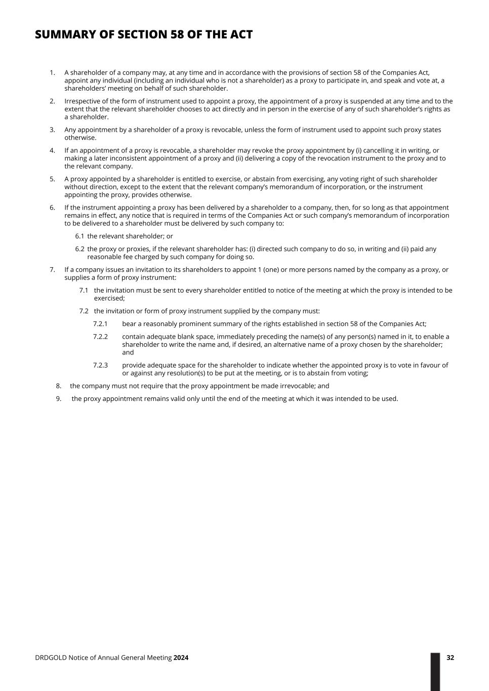 1. A shareholder of a company may, at any time and in accordance with the provisions of section 58 of the Companies Act, appoint any individual (including an individual who is not a shareholder) as a proxy to participate in, and speak and vote at, a shareholders’ meeting on behalf of such shareholder. 2. Irrespective of the form of instrument used to appoint a proxy, the appointment of a proxy is suspended at any time and to the extent that the relevant shareholder chooses to act directly and in person in the exercise of any of such shareholder’s rights as a shareholder. 3. Any appointment by a shareholder of a proxy is revocable, unless the form of instrument used to appoint such proxy states otherwise. 4. If an appointment of a proxy is revocable, a shareholder may revoke the proxy appointment by (i) cancelling it in writing, or making a later inconsistent appointment of a proxy and (ii) delivering a copy of the revocation instrument to the proxy and to the relevant company. 5. A proxy appointed by a shareholder is entitled to exercise, or abstain from exercising, any voting right of such shareholder without direction, except to the extent that the relevant company’s memorandum of incorporation, or the instrument appointing the proxy, provides otherwise. 6. If the instrument appointing a proxy has been delivered by a shareholder to a company, then, for so long as that appointment remains in effect, any notice that is required in terms of the Companies Act or such company’s memorandum of incorporation to be delivered to a shareholder must be delivered by such company to: 6.1 the relevant shareholder; or 6.2 the proxy or proxies, if the relevant shareholder has: (i) directed such company to do so, in writing and (ii) paid any reasonable fee charged by such company for doing so. 7. If a company issues an invitation to its shareholders to appoint 1 (one) or more persons named by the company as a proxy, or supplies a form of proxy instrument: 7.1 the invitation must be sent to every shareholder entitled to notice of the meeting at which the proxy is intended to be exercised; 7.2 the invitation or form of proxy instrument supplied by the company must: 7.2.1 bear a reasonably prominent summary of the rights established in section 58 of the Companies Act; 7.2.2 contain adequate blank space, immediately preceding the name(s) of any person(s) named in it, to enable a shareholder to write the name and, if desired, an alternative name of a proxy chosen by the shareholder; and 7.2.3 provide adequate space for the shareholder to indicate whether the appointed proxy is to vote in favour of or against any resolution(s) to be put at the meeting, or is to abstain from voting; 8. the company must not require that the proxy appointment be made irrevocable; and 9. the proxy appointment remains valid only until the end of the meeting at which it was intended to be used. SUMMARY OF SECTION 58 OF THE ACT DRDGOLD Notice of Annual General Meeting 2024 32