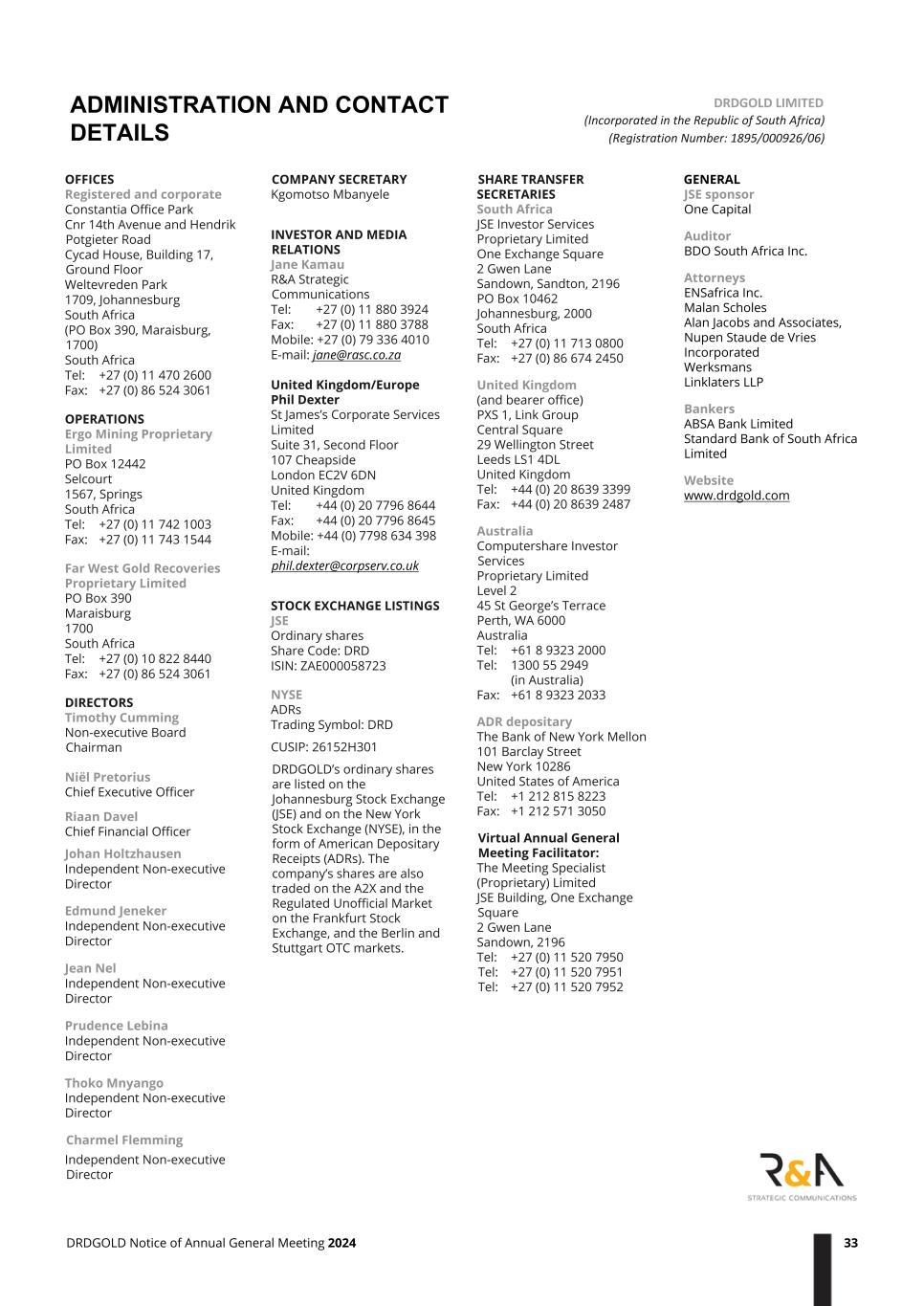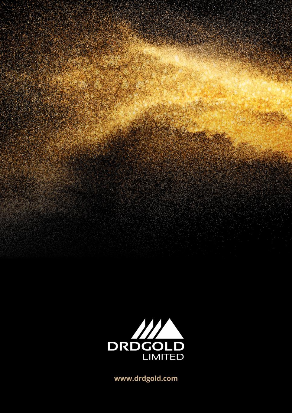OFFICES Registered and corporate Constantia Office Park Cnr 14th Avenue and Hendrik Potgieter Road Cycad House, Building 17, Ground Floor Weltevreden Park 1709, Johannesburg South Africa (PO Box 390, Maraisburg, 1700) South Africa Tel: +27 (0) 11 470 2600 Fax: +27 (0) 86 524 3061 OPERATIONS Ergo Mining Proprietary Limited PO Box 12442 Selcourt 1567, Springs South Africa Tel: +27 (0) 11 742 1003 Fax: +27 (0) 11 743 1544 Far West Gold Recoveries Proprietary Limited PO Box 390 Maraisburg 1700 South Africa Tel: +27 (0) 10 822 8440 Fax: +27 (0) 86 524 3061 DIRECTORS Timothy Cumming Non-executive Board Chairman Niël Pretorius Chief Executive Officer Riaan Davel Chief Financial Officer Johan Holtzhausen Independent Non-executive Director Edmund Jeneker Independent Non-executive Director Jean Nel Independent Non-executive Director Prudence Lebina Independent Non-executive Director Thoko Mnyango Independent Non-executive Director Charmel Flemming Independent Non-executive Director COMPANY SECRETARY Kgomotso Mbanyele INVESTOR AND MEDIA RELATIONS Jane Kamau R&A Strategic Communications Tel: +27 (0) 11 880 3924 Fax: +27 (0) 11 880 3788 Mobile: +27 (0) 79 336 4010 E-mail: jane@rasc.co.za United Kingdom/Europe Phil Dexter St James’s Corporate Services Limited Suite 31, Second Floor 107 Cheapside London EC2V 6DN United Kingdom Tel: +44 (0) 20 7796 8644 Fax: +44 (0) 20 7796 8645 Mobile: +44 (0) 7798 634 398 E-mail: phil.dexter@corpserv.co.uk STOCK EXCHANGE LISTINGS JSE Ordinary shares Share Code: DRD ISIN: ZAE000058723 NYSE ADRs Trading Symbol: DRD CUSIP: 26152H301 DRDGOLD’s ordinary shares are listed on the Johannesburg Stock Exchange (JSE) and on the New York Stock Exchange (NYSE), in the form of American Depositary Receipts (ADRs). The company’s shares are also traded on the A2X and the Regulated Unofficial Market on the Frankfurt Stock Exchange, and the Berlin and Stuttgart OTC markets. SHARE TRANSFER SECRETARIES South Africa JSE Investor Services Proprietary Limited One Exchange Square 2 Gwen Lane Sandown, Sandton, 2196 PO Box 10462 Johannesburg, 2000 South Africa Tel: +27 (0) 11 713 0800 Fax: +27 (0) 86 674 2450 United Kingdom (and bearer office) PXS 1, Link Group Central Square 29 Wellington Street Leeds LS1 4DL United Kingdom Tel: +44 (0) 20 8639 3399 Fax: +44 (0) 20 8639 2487 Australia Computershare Investor Services Proprietary Limited Level 2 45 St George’s Terrace Perth, WA 6000 Australia Tel: +61 8 9323 2000 Tel: 1300 55 2949 (in Australia) Fax: +61 8 9323 2033 ADR depositary The Bank of New York Mellon 101 Barclay Street New York 10286 United States of America Tel: +1 212 815 8223 Fax: +1 212 571 3050 Virtual Annual General Meeting Facilitator: The Meeting Specialist (Proprietary) Limited JSE Building, One Exchange Square 2 Gwen Lane Sandown, 2196 Tel: +27 (0) 11 520 7950 Tel: +27 (0) 11 520 7951 Tel: +27 (0) 11 520 7952 GENERAL JSE sponsor One Capital Auditor BDO South Africa Inc. Attorneys ENSafrica Inc. Malan Scholes Alan Jacobs and Associates, Nupen Staude de Vries Incorporated Werksmans Linklaters LLP Bankers ABSA Bank Limited Standard Bank of South Africa Limited Website www.drdgold.com ADMINISTRATION AND CONTACT DETAILS DRDGOLD LIMITED (Incorporated in the Republic of South Africa) (Registration Number: 1895/000926/06) DRDGOLD Notice of Annual General Meeting 2024 33