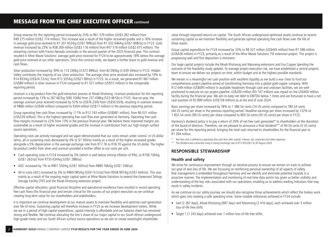 4 HARMONY GOLD MINING COMPANY LIMITED FY24 RESULTS FOR THE YEAR ENDED 30 JUNE 2024 MESSAGE FROM THE CHIEF EXECUTIVE OFFICER continued Production in FY24 from these operations was down 3% year-on-year at 19 061kg (612 826oz) compared to 19 641kg (631 474oz) in FY23. Average underground recovered grades at these operations remained largely flat at 4.86g/t from 4.87g/t in the previous reporting period. The AISC for the South African underground optimised operations increased by 12% to R1 110 814/kg (US$1 848/oz) in FY24 from R989 249/kg (US$1 732/oz) in FY23. This increase was mainly due to inflationary increases and lower production. Despite the higher costs, operating free cash flows from these operations increased by 78% to R1 989 million (US$106 million) from R1 115 million (US$63 million) in the previous reporting period. At current gold prices, these assets are generating meaningful returns and continue delivering significant socio- economic benefits. We will continue investing in these assets as long as we can mine both safely and profitably. 3. South African surface operations Our South African surface assets which include Mine Waste Solutions, Phoenix, Central Plant Reclamation, Savuka tailings, the rock dumps and Kalgold, all delivered an excellent set of operating results. This affirms our decision to further invest in our surface retreatment assets. The Kareerand TSF expansion project at Mine Waste Solutions is progressing as planned, with first deposition imminent. We are also in the process of bringing on a fourth processing stream at Mine Waste Solutions. This will increase the total processing capacity from 78 000 tonnes per day to 86 000 tonnes per day. This will only be possible once the Kareerand TSF extension is complete to accommodate the additional residue deposition. Tailings retreatment presents a fantastic opportunity for Harmony due to the lower risk, high margins and positive ESG story associated with these operations. Harmony has an abundance of resources in old gold tailings dams in the Free State, North West and Gauteng regions. We are therefore continuing studies to determine the feasibility of converting 5.7 million ounces in Mineral Resources to Mineral Reserves in the Free State region. This is an excellent example of capital allocation which delivers both commercial and ESG benefits. FY24 production from surface sources increased by 21% to 9 066kg (291 477oz) from 7 523kg (241 872oz) in FY23 mainly as a result of a 36% increase in recovered grades at Mine Waste Solutions and improved performance at Kalgold. The South African surface operations' AISC for FY24 decreased by 8% to R703 730/kg (US$1 171/oz) compared to R764 285/kg (US$1 338/oz) in the previous reporting period. This was mainly due to a 17% increase in recovered grades to 0.21g/t from 0.18g/t in FY23 across these operations. Operating free cash flows generated by these operations increased by 210% to R2 586 million (US$138 million) in FY24 from R835 million (US$47 million) in the previous reporting period. R1 352 million (US$72 million) in major capital was deployed at Mine Waste Solutions. We expect to deploy another R1 198 million (US$66 million) in major capital at Mine Waste Solutions in FY25 to complete the TSF expansion and bring the fourth stream and additional retreatment sources online. 4. International Hidden Valley Gold production in FY24 at Hidden Valley increased by 17% to 5 101kg (164 000oz) from 4 370kg (140 498oz) in FY23. Silver production also increased by 41% to 110 195kg (3 542 852oz) from 78 386kg (2 520 163oz) in FY23. The improved performance was on the back of significantly higher recovered grades from the Kaveroi saddle and Big Red areas, which have now been mined out. Recovered grades in FY24 increased by 33% to 1.52g/t compared to 1.14g/t in the comparable reporting period. Recovered grades will be lower in FY25, now that we have commenced with mining and waste stripping in Stage 8. AISC for FY24 declined by 20% to R814 375/kg (US$1 352/oz) from R1 014 228/kg (US$1 785/oz) due to the higher recovered grades and record silver production. Hidden Valley generated operating free cash flows of R2 188 million (US$117 million) in FY24 compared to R615 million (US$35 million) in FY23. This contribution to the group's operating free cash flows, was the second highest after Mponeng. Studies are underway to determine whether Hidden Valley can be extended beyond financial year 2028. Additional deposition capacity is being sought which could allow for a Stage 9 cutback. Total capital expenditure at Hidden Valley in FY25 remains elevated as we continue with the Stage 8 cutback, procure necessary replacement fleet and continue with TSF expansion work. Wafi-Golpu project Negotiations continue between Harmony, our joint venture partner Newmont Corporation and the Papua New Guinea Government regarding the terms of a Mining Development Contract (which is required for a Special Mining Lease). Harmony remains committed to permitting this Tier 1 copper-gold asset. Eva Copper project The feasibility study update for Eva is still underway. We received conditional grant funding of A$20.7 million from the Queensland government after it had declared the Eva project as a 'Prescribed Project', given its strategic importance to the region. The grant funding, which will help accelerate development of this project, is subject to a number of conditions, including that Harmony reaches a positive final investment decision (FID) by January 2026. The grant of A$20.7 million is earmarked for preparatory works at the project site, located 75 kilometres north of Cloncurry and 95 kilometres north-east of Mount Isa, on the traditional lands of the Kalkadoon People. Since the acquisition, 82 000 metres have been drilled to grow the project's resource base. We have significantly de-risked this project and enhanced confidence in the resource estimates as we continue with the update of the feasibility study. Harmo