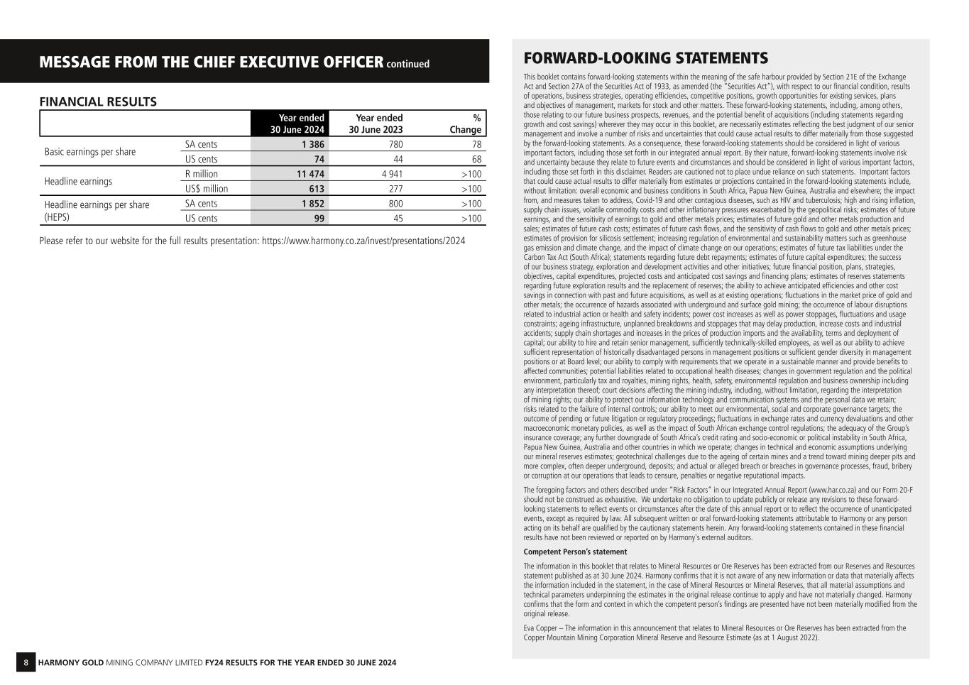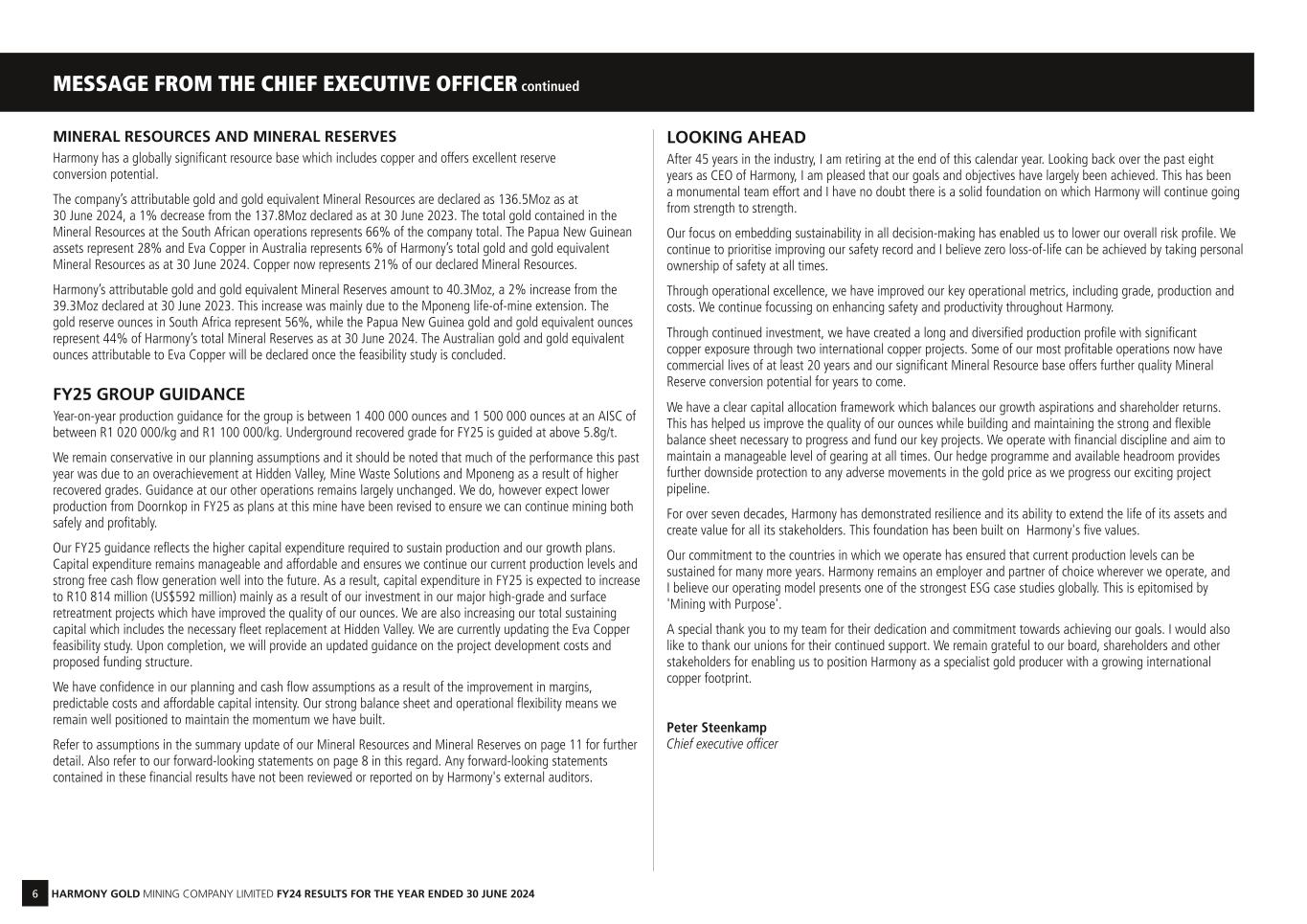 6 HARMONY GOLD MINING COMPANY LIMITED FY24 RESULTS FOR THE YEAR ENDED 30 JUNE 2024 MINERAL RESOURCES AND MINERAL RESERVES Harmony has a globally significant resource base which includes copper and offers excellent reserve conversion potential. The company’s attributable gold and gold equivalent Mineral Resources are declared as 136.5Moz as at 30 June 2024, a 1% decrease from the 137.8Moz declared as at 30 June 2023. The total gold contained in the Mineral Resources at the South African operations represents 66% of the company total. The Papua New Guinean assets represent 28% and Eva Copper in Australia represents 6% of Harmony’s total gold and gold equivalent Mineral Resources as at 30 June 2024. Copper now represents 21% of our declared Mineral Resources. Harmony’s attributable gold and gold equivalent Mineral Reserves amount to 40.3Moz, a 2% increase from the 39.3Moz declared at 30 June 2023. This increase was mainly due to the Mponeng life-of-mine extension. The gold reserve ounces in South Africa represent 56%, while the Papua New Guinea gold and gold equivalent ounces represent 44% of Harmony’s total Mineral Reserves as at 30 June 2024. The Australian gold and gold equivalent ounces attributable to Eva Copper will be declared once the feasibility study is concluded. FY25 GROUP GUIDANCE Year-on-year production guidance for the group is between 1 400 000 ounces and 1 500 000 ounces at an AISC of between R1 020 000/kg and R1 100 000/kg. Underground recovered grade for FY25 is guided at above 5.8g/t. We remain conservative in our planning assumptions and it should be noted that much of the performance this past year was due to an overachievement at Hidden Valley, Mine Waste Solutions and Mponeng as a result of higher recovered grades. Guidance at our other operations remains largely unchanged. We do, however expect lower production from Doornkop in FY25 as plans at this mine have been revised to ensure we can continue mining both safely and profitably. Our FY25 guidance reflects the higher capital expenditure required to sustain production and our growth plans. Capital expenditure remains manageable and affordable and ensures we continue our current production levels and strong free cash flow generation well into the future. As a result, capital expenditure in FY25 is expected to increase to R10 814 million (US$592 million) mainly as a result of our investment in our major high-grade and surface retreatment projects which have improved the quality of our ounces. We are also increasing our total sustaining capital which includes the necessary fleet replacement at Hidden Valley. We are currently updating the Eva Copper feasibility study. Upon completion, we will provide an updated guidance on the project development costs and proposed funding structure. We have confidence in our planning and cash flow assumptions as a result of the improvement in margins, predictable costs and affordable capital intensity. Our strong balance sheet and operational flexibility means we remain well positioned to maintain the momentum we have built. Refer to assumptions in the summary update of our Mineral Resources and Mineral Reserves on page 11 for further detail. Also refer to our forward-looking statements on page 8 in this regard. Any forward-looking statements contained in these financial results have not been reviewed or reported on by Harmony's external auditors. MESSAGE FROM THE CHIEF EXECUTIVE OFFICER continued LOOKING AHEAD After 45 years in the industry, I am retiring at the end of this calendar year. Looking back over the past eight years as CEO of Harmony, I am pleased that our goals and objectives have largely been achieved. This has been a monumental team effort and I have no doubt there is a solid foundation on which Harmony will continue going from strength to strength. Our focus on embedding sustainability in all decision-making has enabled us to lower our overall risk profile. We continue to prioritise improving our safety record and I believe zero loss-of-life can be achieved by taking personal ownership of safety at all times. Through operational excellence, we have improved our key operational metrics, including grade, production and costs. We continue focussing on enhancing safety and productivity throughout Harmony. Through continued investment, we have created a long and diversified production profile with significant copper exposure through two international copper projects. Some of our most profitable operations now have commercial lives of at least 20 years and our significant Mineral Resource base offers further quality Mineral Reserve conversion potential for years to come. We have a clear capital allocation framework which balances our growth aspirations and shareholder returns. This has helped us improve the quality of our ounces while building and maintaining the strong and flexible balance sheet necessary to progress and fund our key projects. We operate with financial discipline and aim to maintain a manageable level of gearing at all times. Our hedge programme and available headroom provides further downside protection to any adverse movements in the gold price as we progress our exciting project pipeline. For over seven decades, Harmony has demonstrated resilience and its ability to extend the life of its assets and create value for all its stakeholders. This foundation has been built on Harmony's five values. Our commitment to the countries in which we operate has ensured that current production levels can be sustained for many more years. Harmony remains an employer and partner of choice wherever we operate, and I believe our operating model presents one of the strongest ESG case studies globally. This is epitomised by 'Mining with Purpose'. A special thank you to my team for their dedication and commitment towards achieving our goals. I would also like to thank our unions for their continued support. We remain grateful to our board, shareholders and other stak